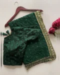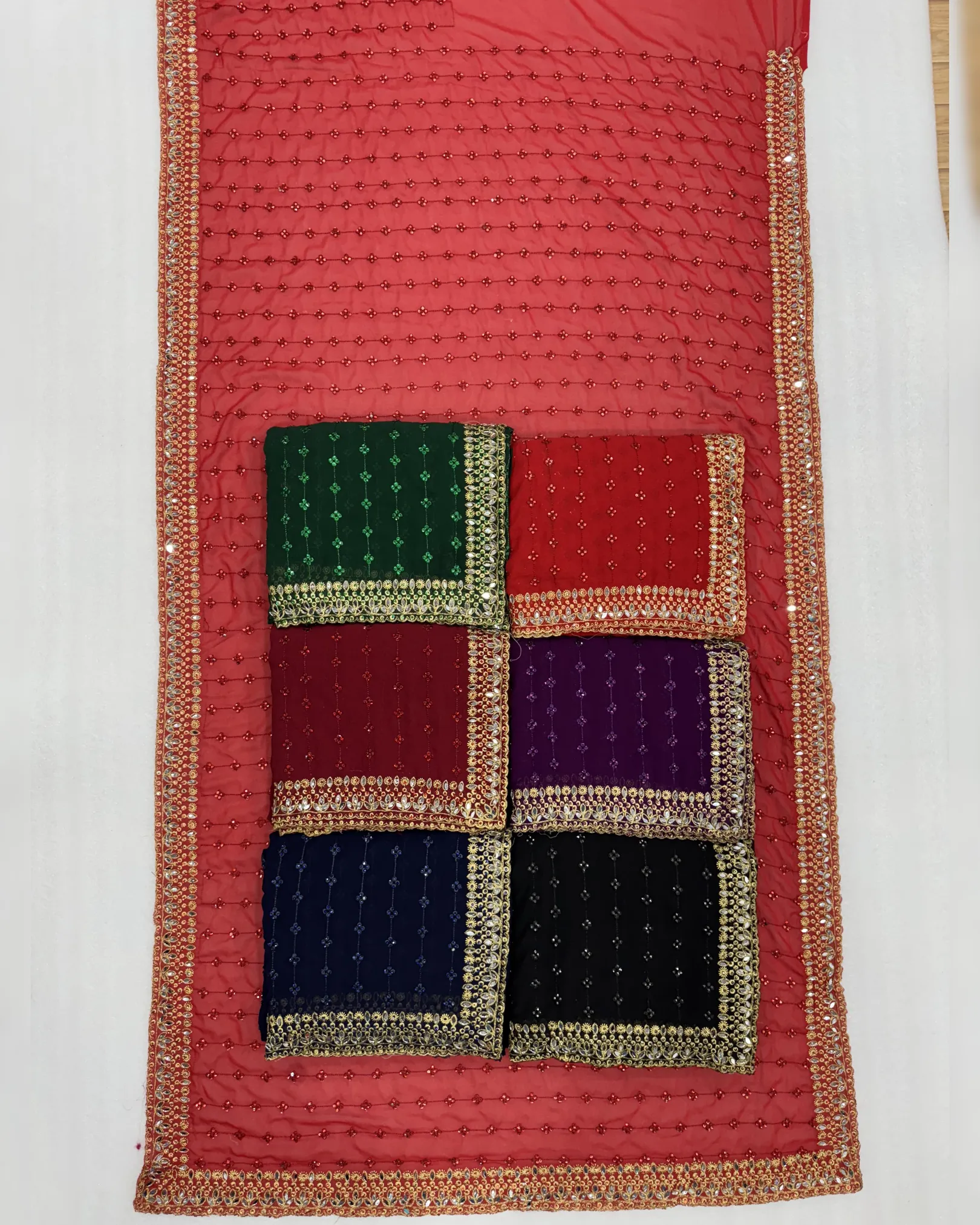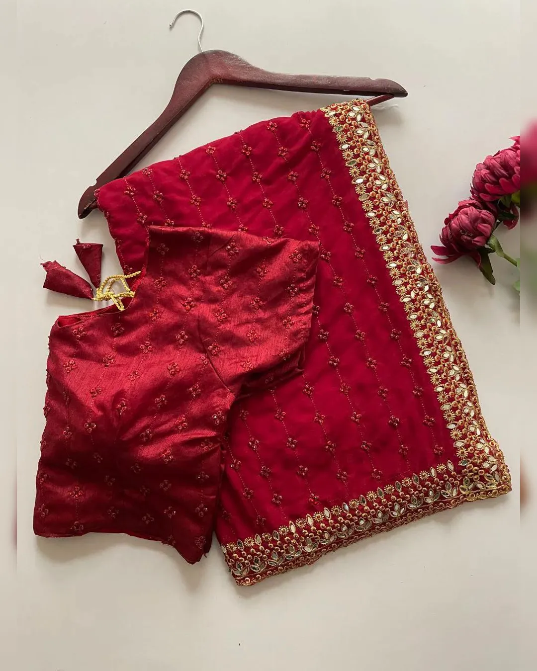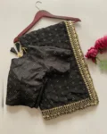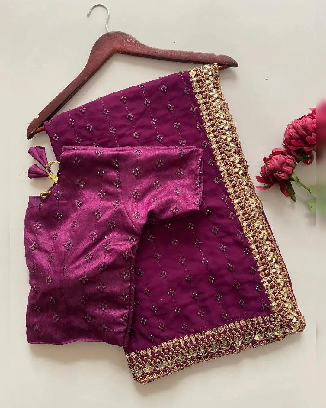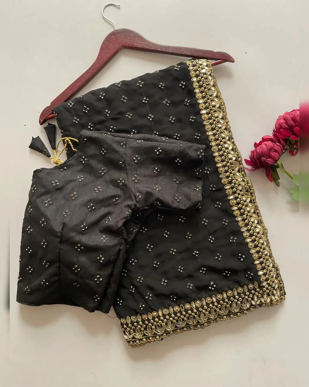 Premium faux georgette saree with heavy sequin work and real mirror lace border, paired with a stunning embroidered Banglori silk blouse.