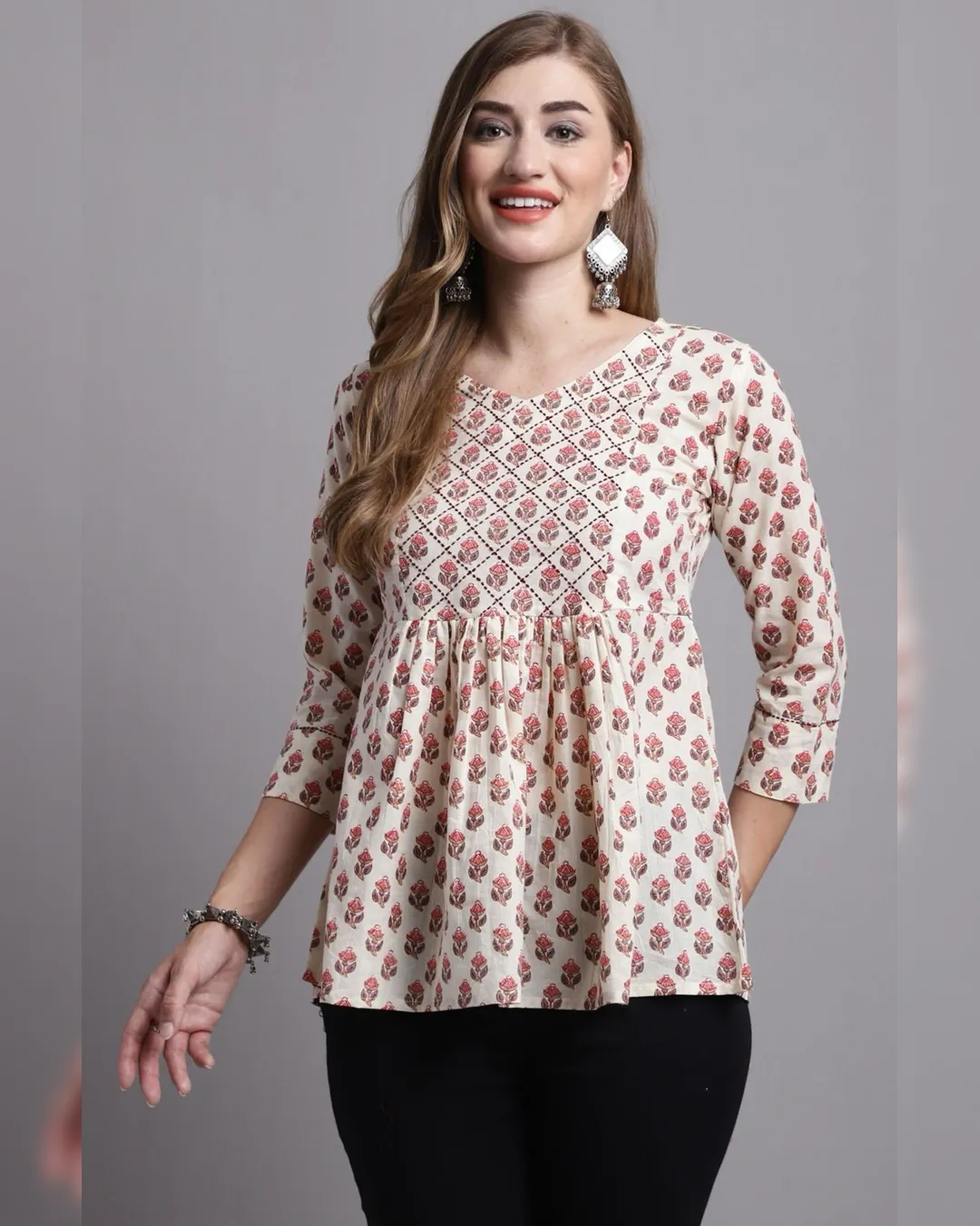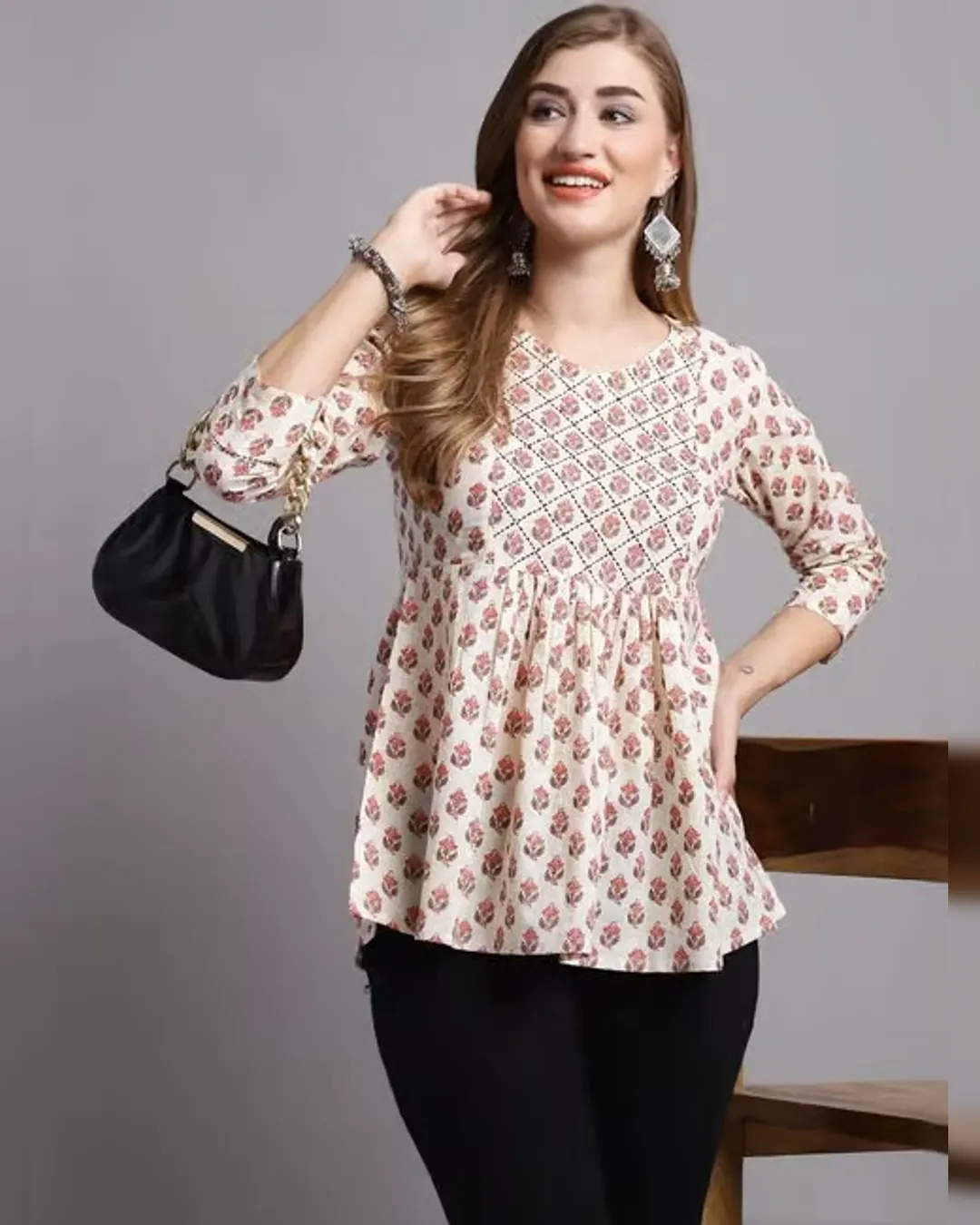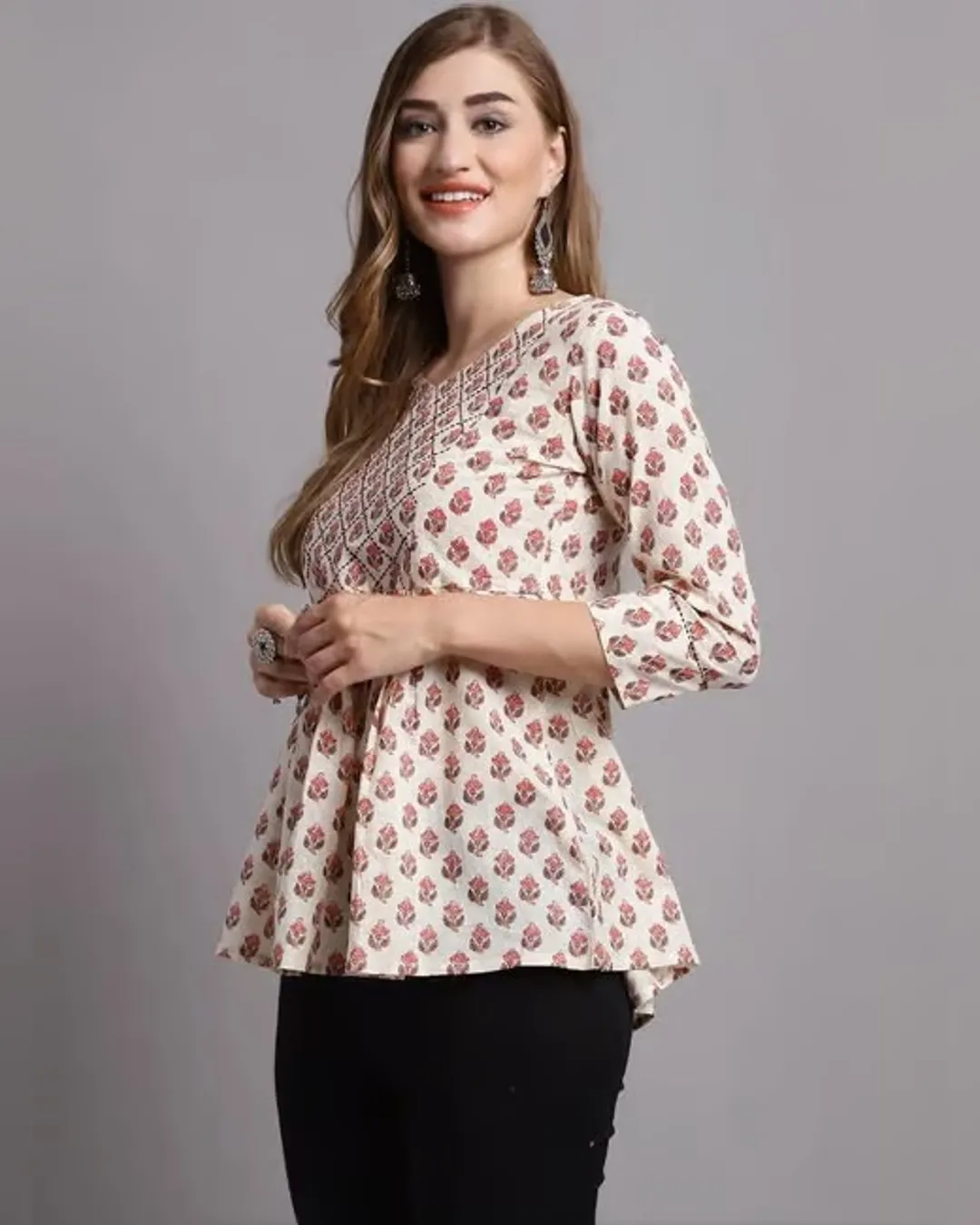 Slim-fit cotton short kurti with delicate thread work—ideal with jeans for a smart, effortless look.