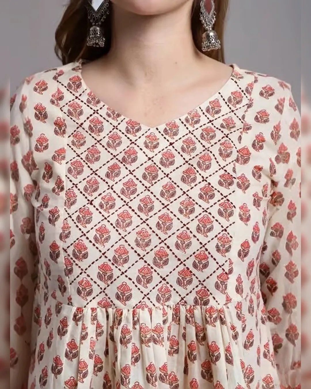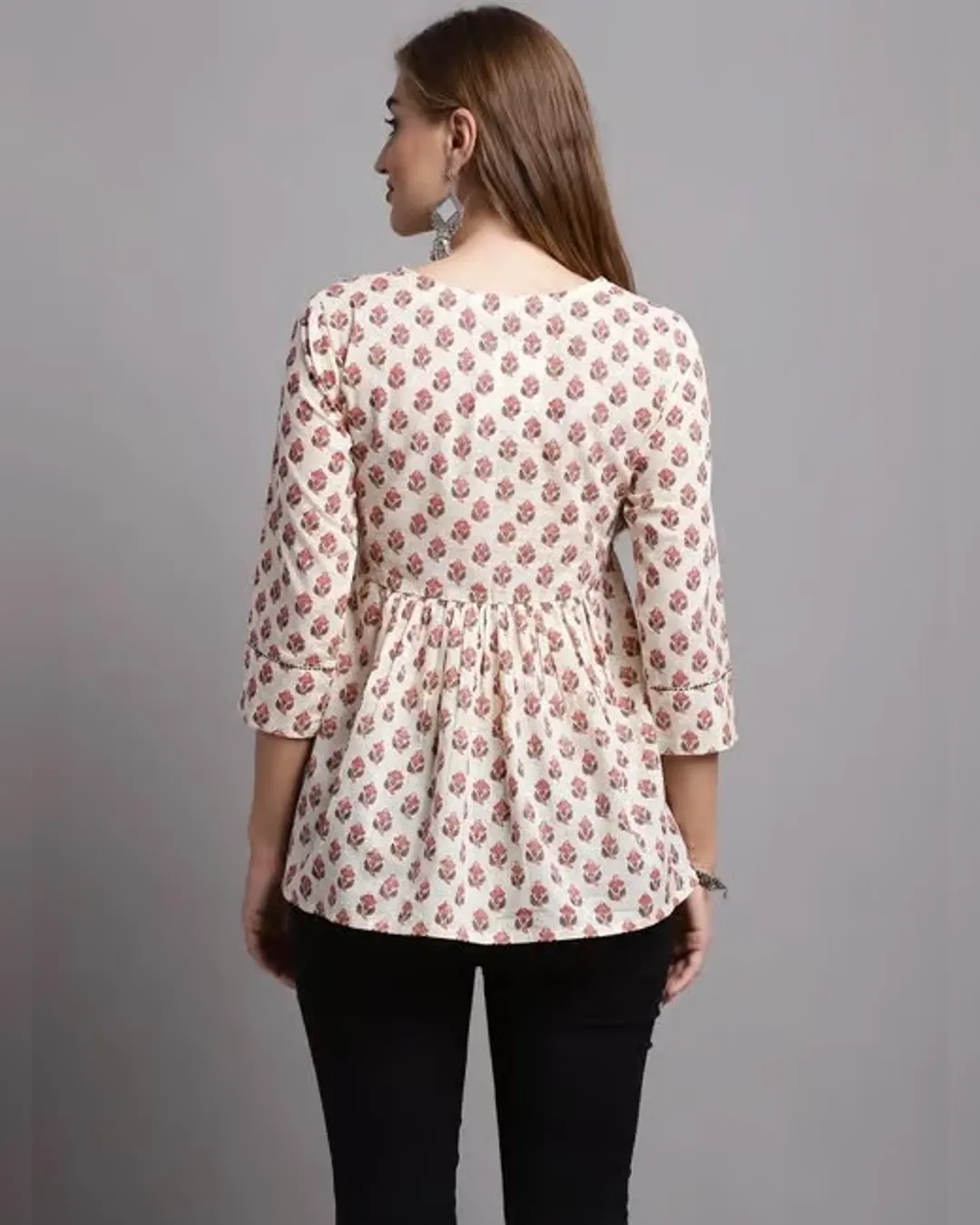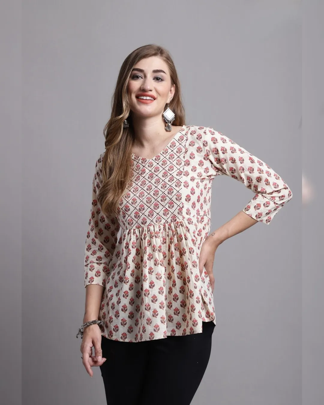 Slim-fit cotton short kurti with delicate thread work—ideal with jeans for a smart, effortless look.