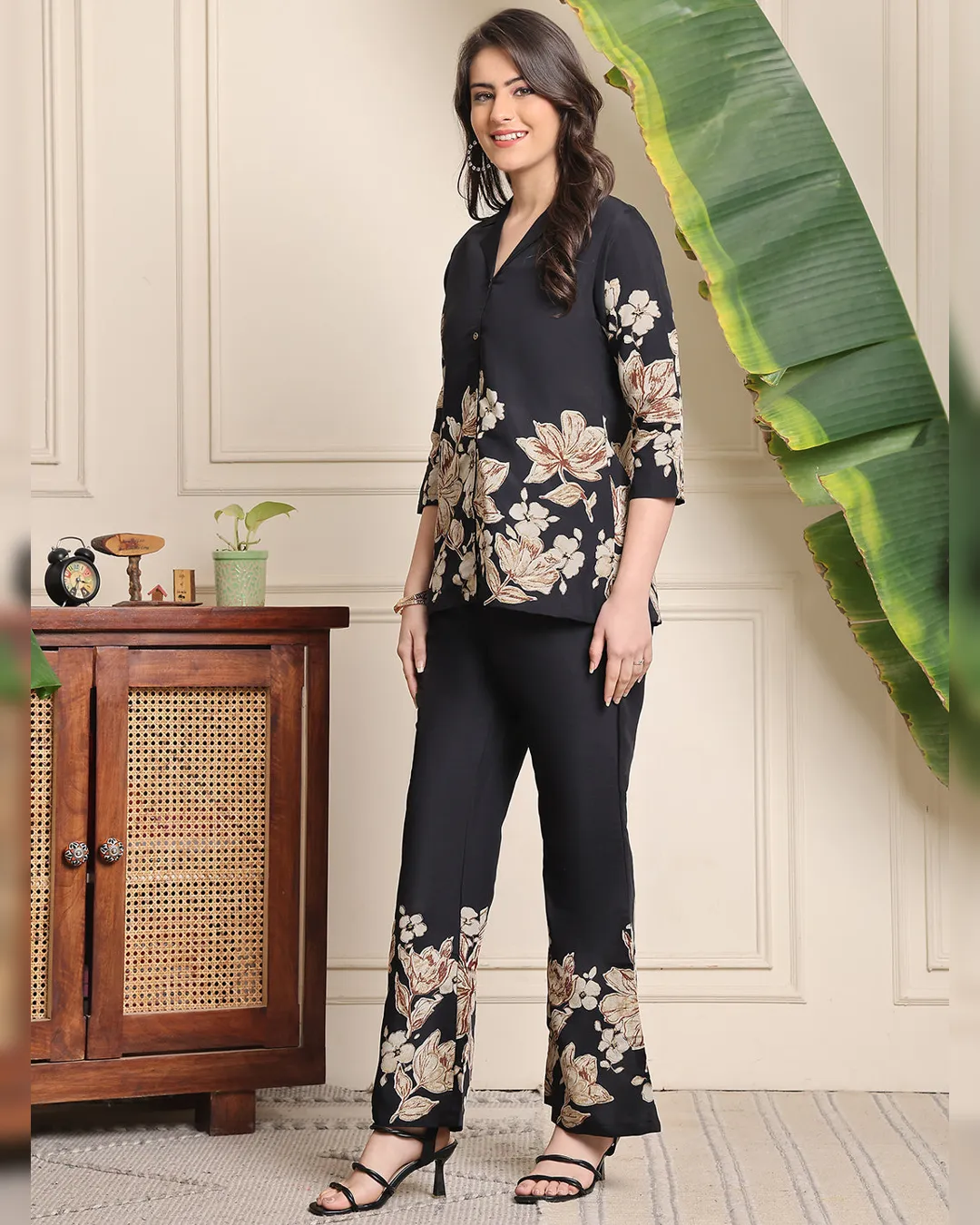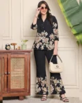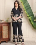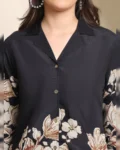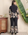 Elegant black floral co-ord set in premium Chanderi silk featuring a lapel collar tunic and practical drawstring trousers—ideal for classy everyday or festive wear.