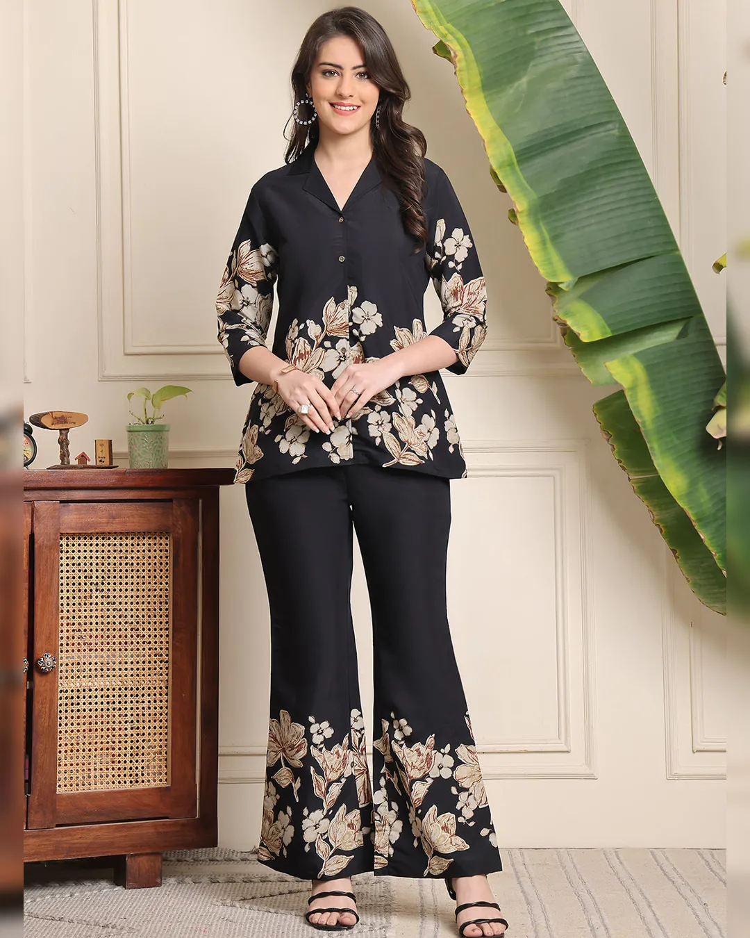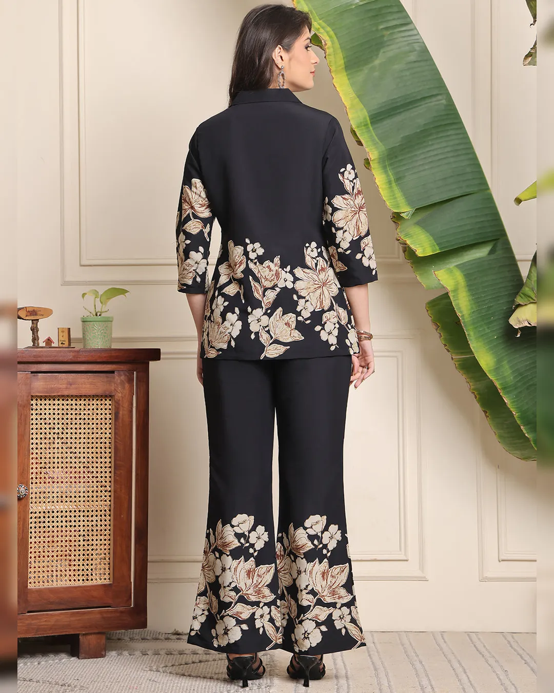 Make a bold yet graceful statement with this Black Floral Printed Premium Chanderi Co-Ord Set, thoughtfully designed for the stylish woman. Crafted from luxurious Chanderi silk, this outfit features a sleek black tunic with beige floral prints, a lapel shirt collar, and three-quarter sleeves. It’s paired with coordinated floral trousers, enhanced with a drawstring closure and handy side pockets for functionality and ease. Whether you're heading to work, attending a gathering, or enjoying a casual day out, this set offers refined elegance and effortless comfort.