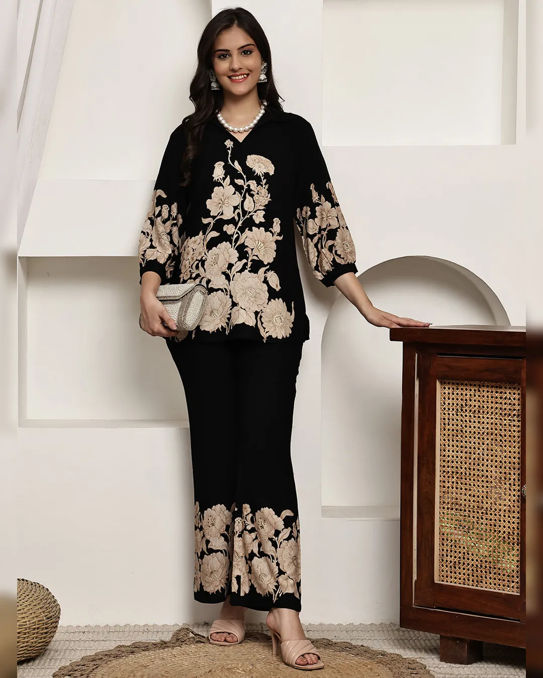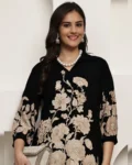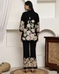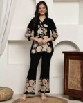Bring a touch of floral charm to your casual wardrobe with this black and beige floral printed co-ord set, crafted from soft and breathable viscose rayon. The set features a v-neck tunic with three-quarter sleeves and elasticated trousers with slip-on closure for an effortless fit. Lightweight and comfortable, it’s ideal for casual outings, brunches, or relaxed gatherings, while maintaining a chic, put-together look.