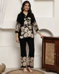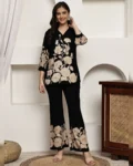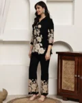 Black floral printed viscose rayon co-ord set with v-neck tunic and elasticated trousers—comfortable casual wear with effortless style.