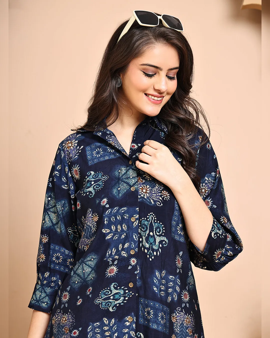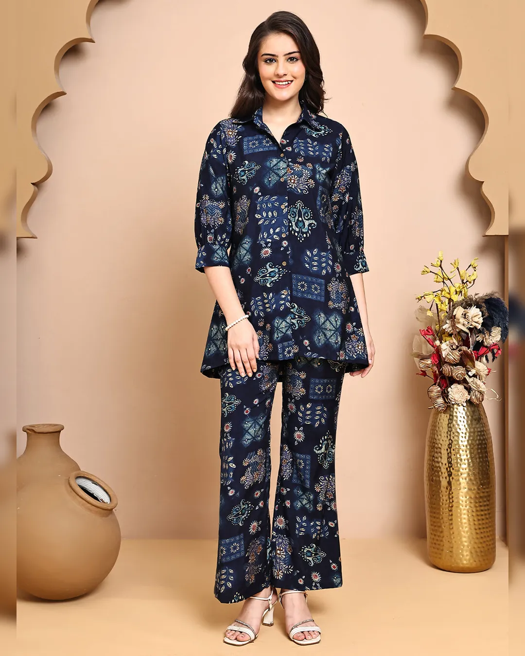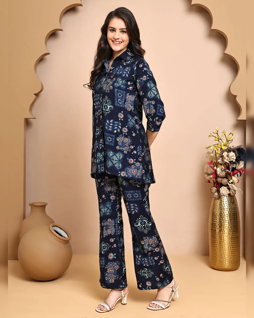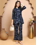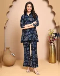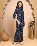 Navy blue abstract printed co-ord set in premium Chanderi, featuring a shirt-collar tunic and comfy trousers with a modern silhouette.