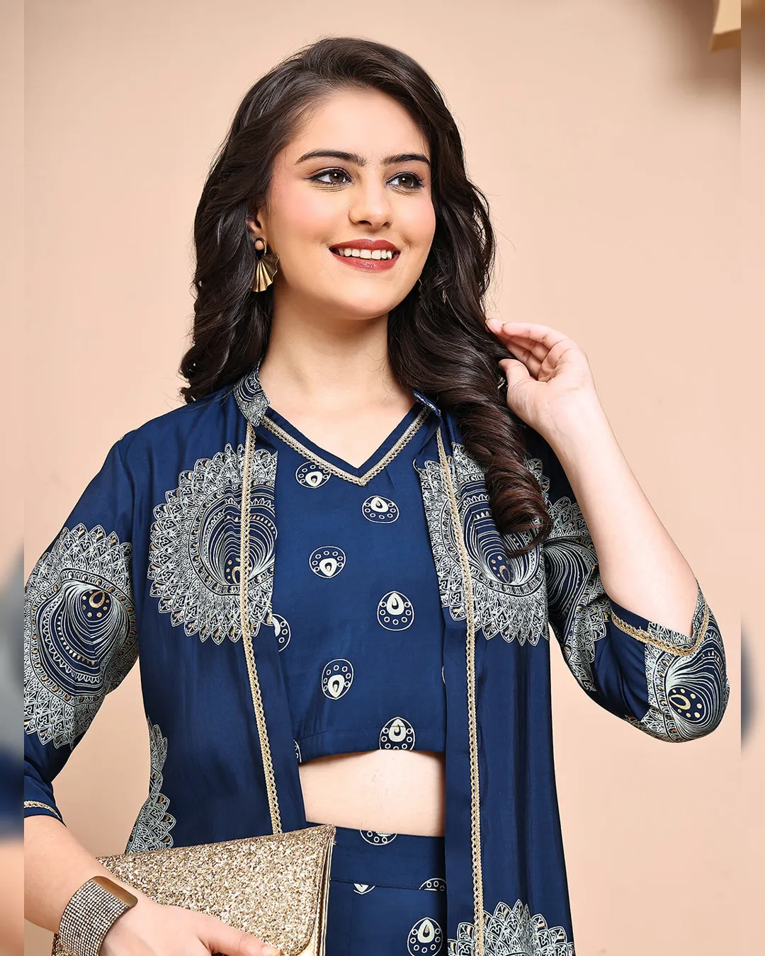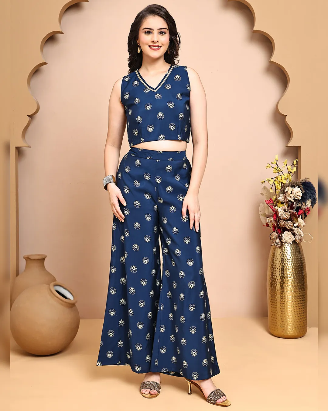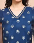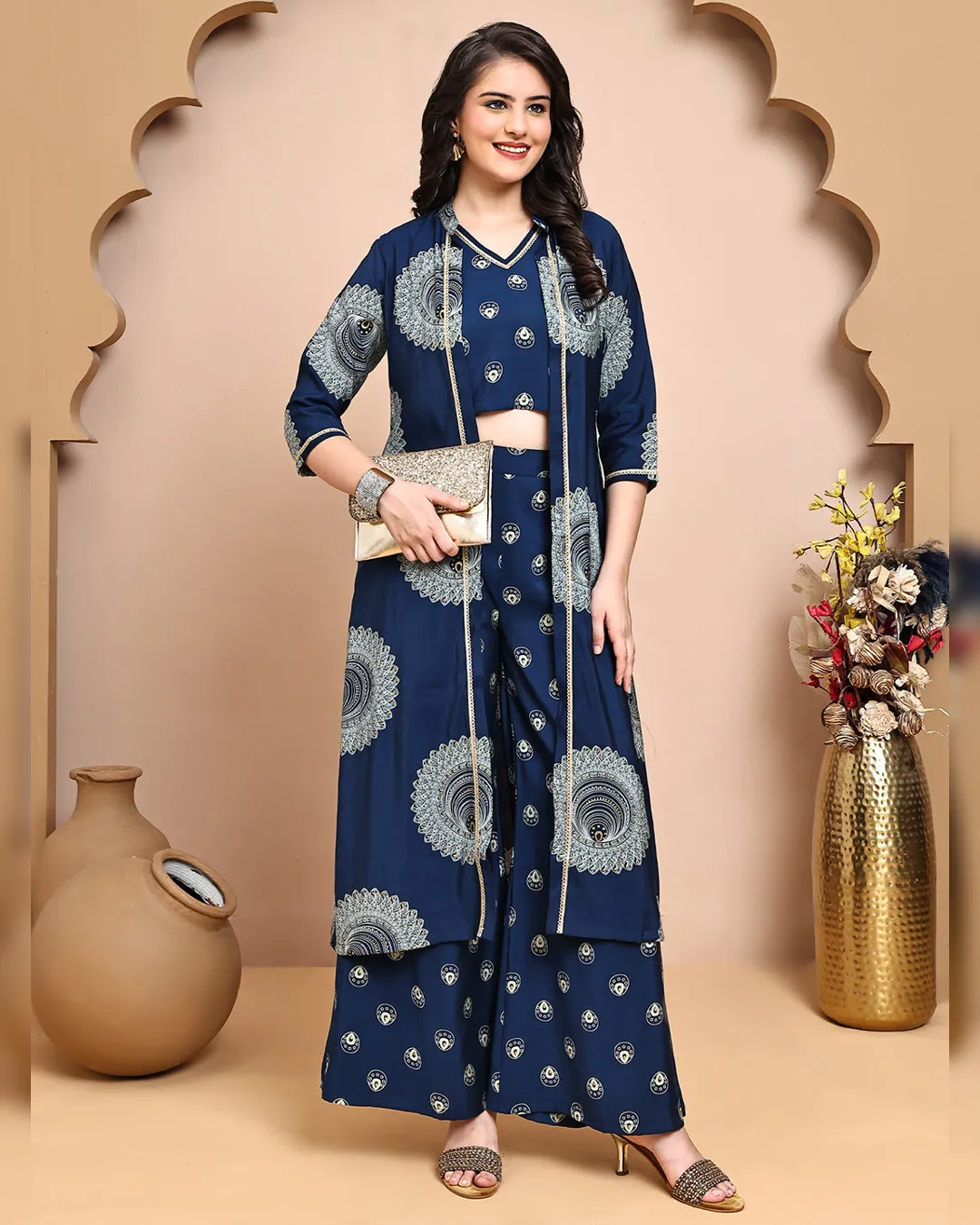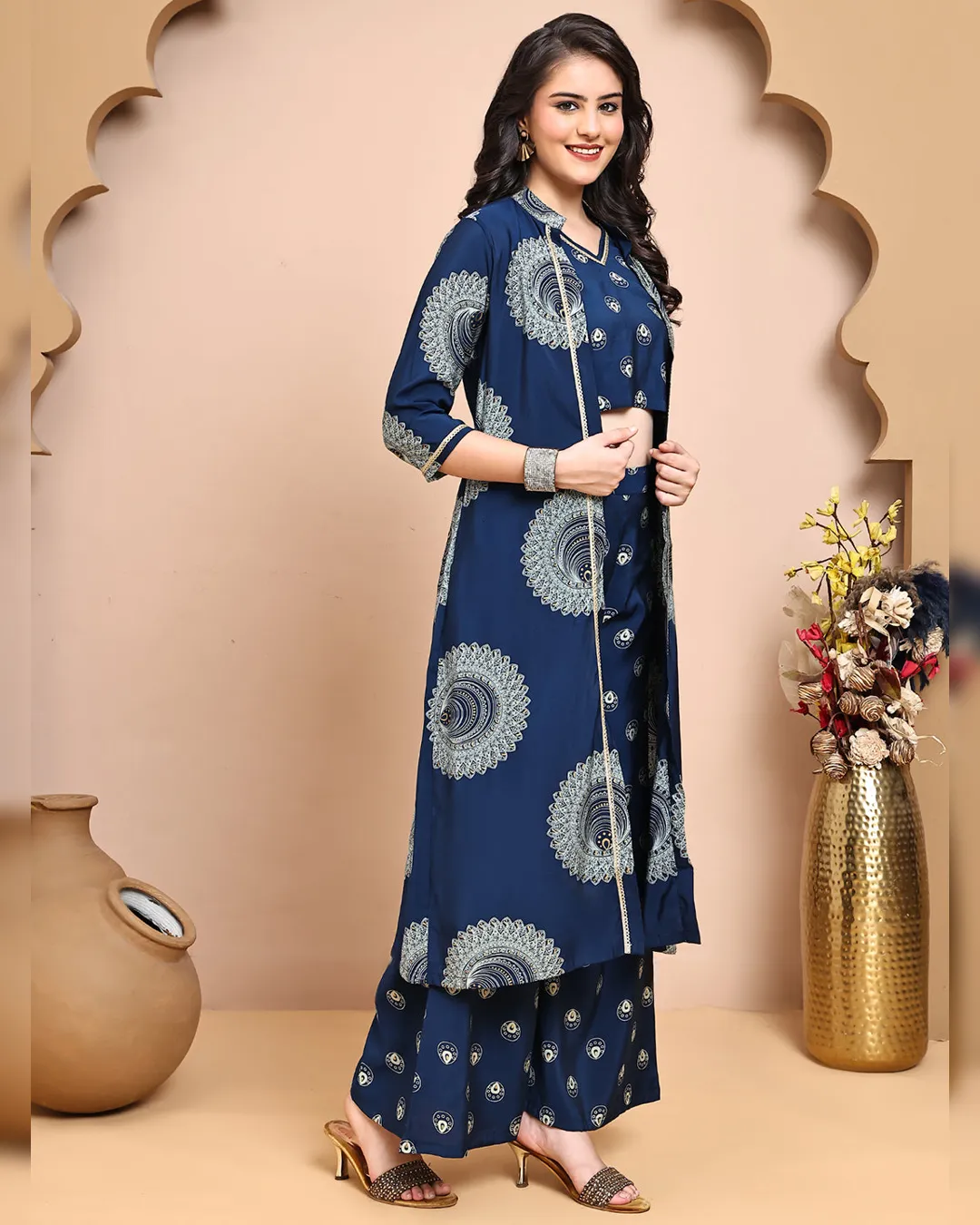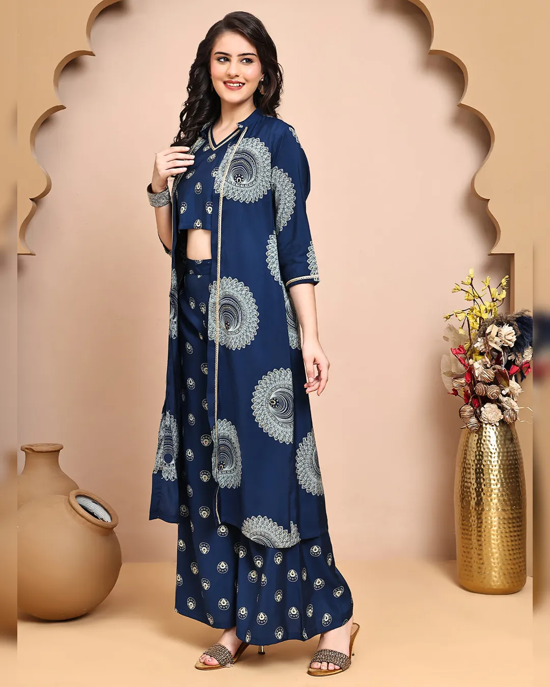 Make a statement in this stylish blue ethnic printed co-ord set crafted in luxurious premium Chanderi fabric. The set features a sleeveless V-neck printed top, paired with matching printed trousers that come with a comfortable drawstring closure. Completing the ensemble is a coordinated printed jacket, offering a chic layered look that blends tradition with contemporary charm. Perfect for casual gatherings, festive brunches, or relaxed office looks.