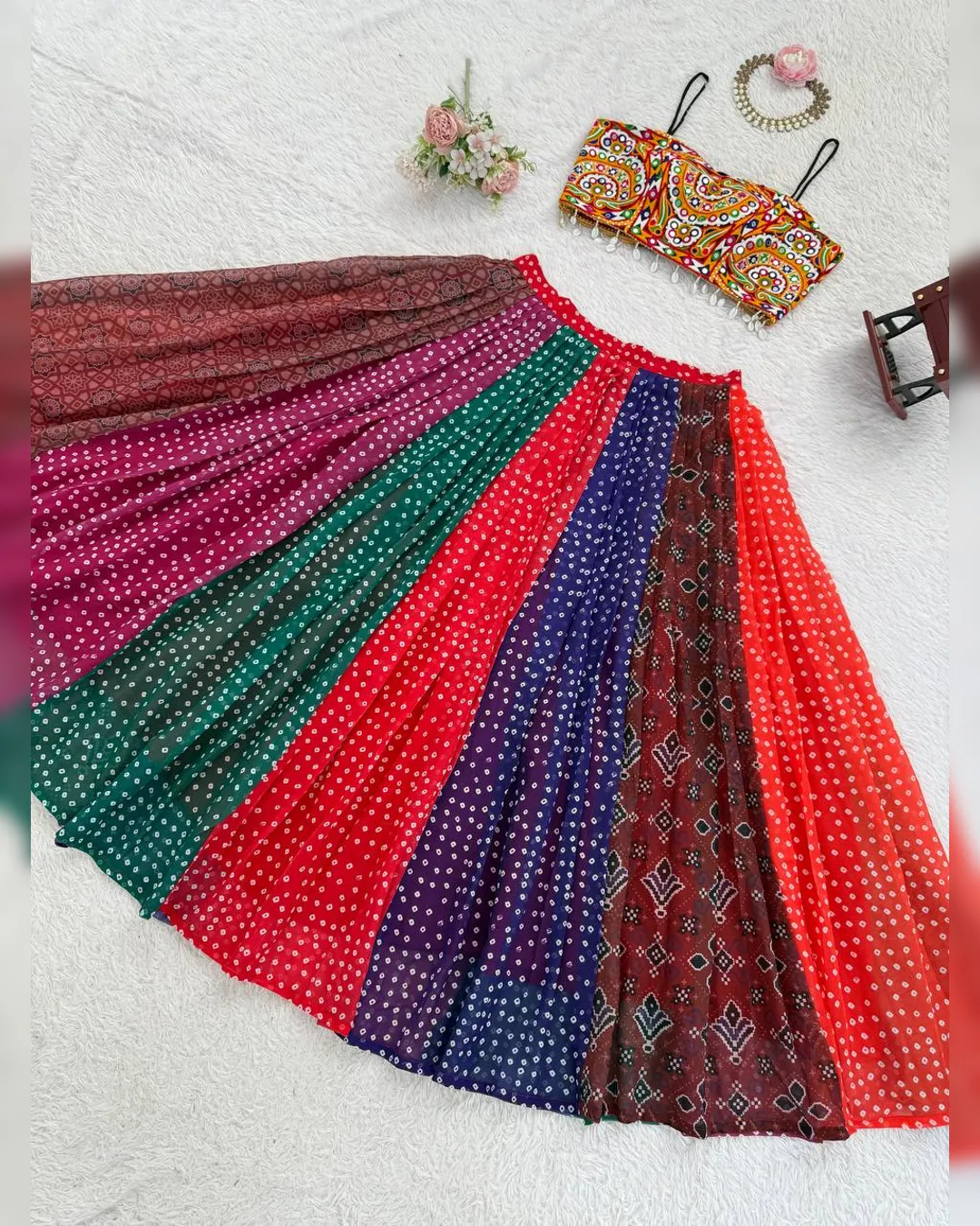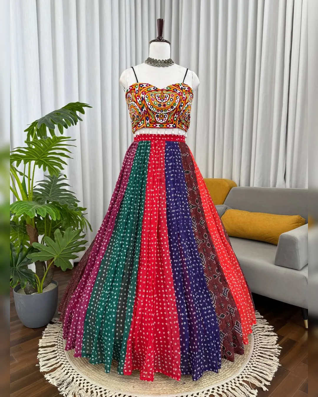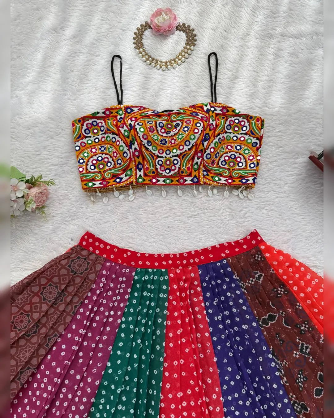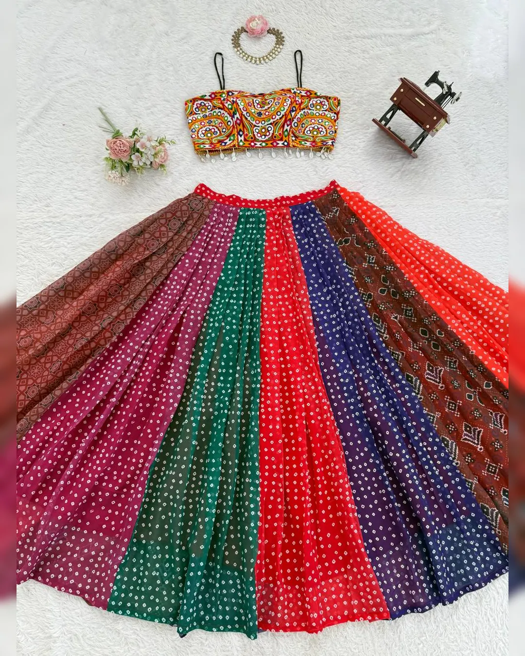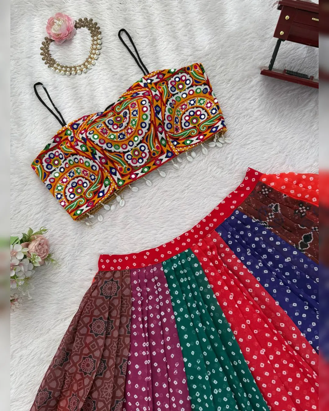 Bollywood special digital print lehenga with flared faux georgette, paired with gamthi mirror work choli. Fully stitched and ready to wear.