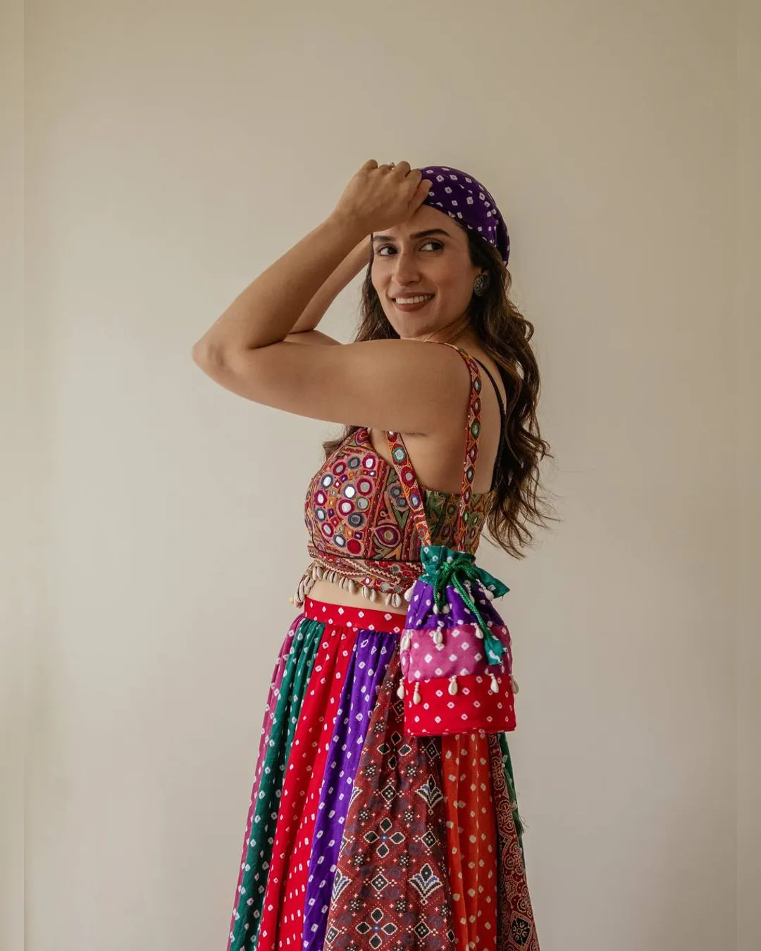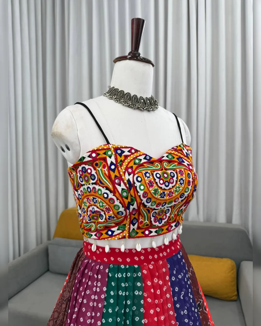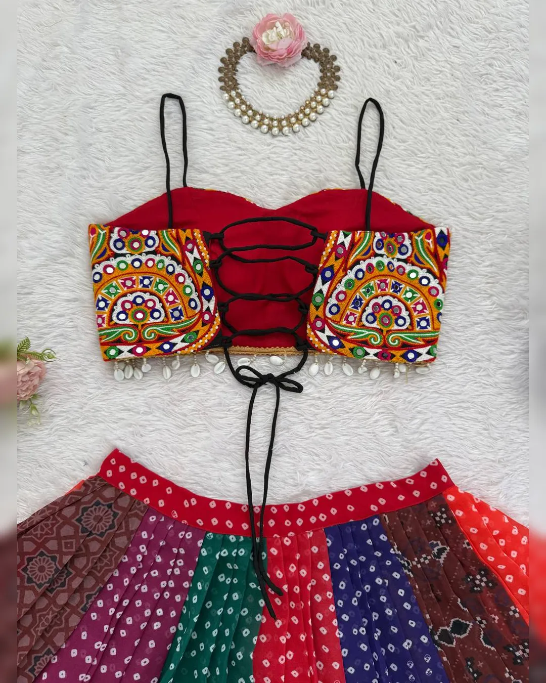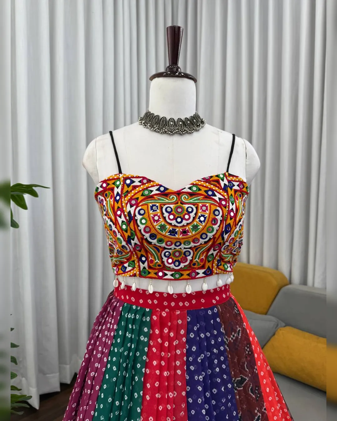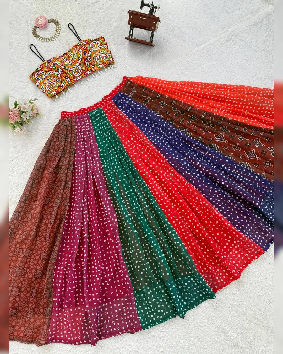 Bollywood special digital print lehenga with flared faux georgette, paired with gamthi mirror work choli. Fully stitched and ready to wear.