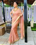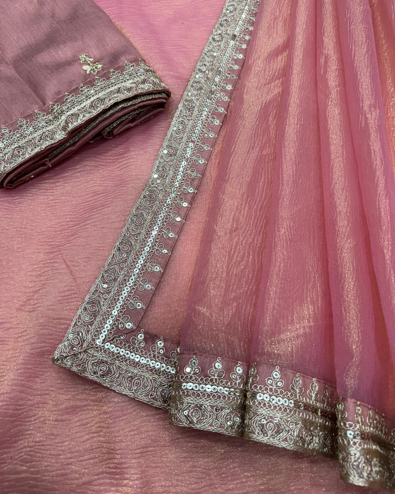 Trendy Bollywood-style saree crafted in Banarasi crush twill with sequins and dori embroidery, paired with a heavy Banglori blouse.