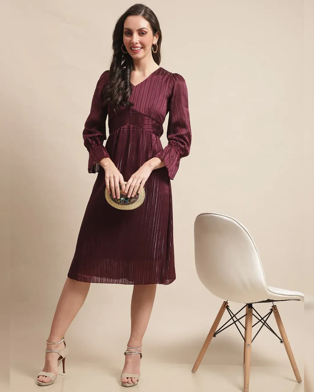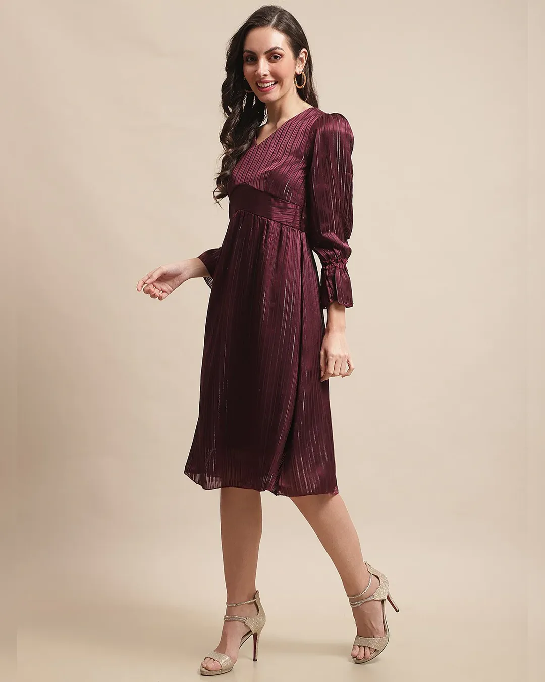 The elegant V-neckline and three-quarter bell sleeves exude timeless sophistication, while the rich maroon hue adds a touch of vibrancy and allure. Designed for versatility and style, this dress transitions seamlessly from day to night, perfect for brunches, daytime outings, or casual gatherings.