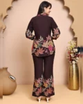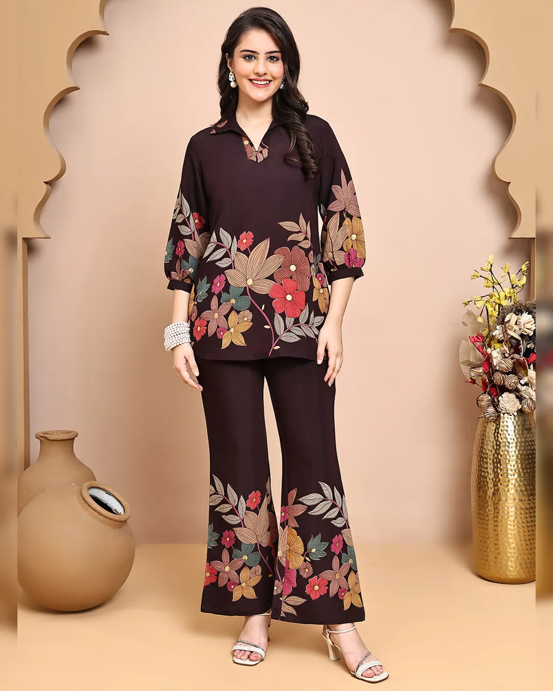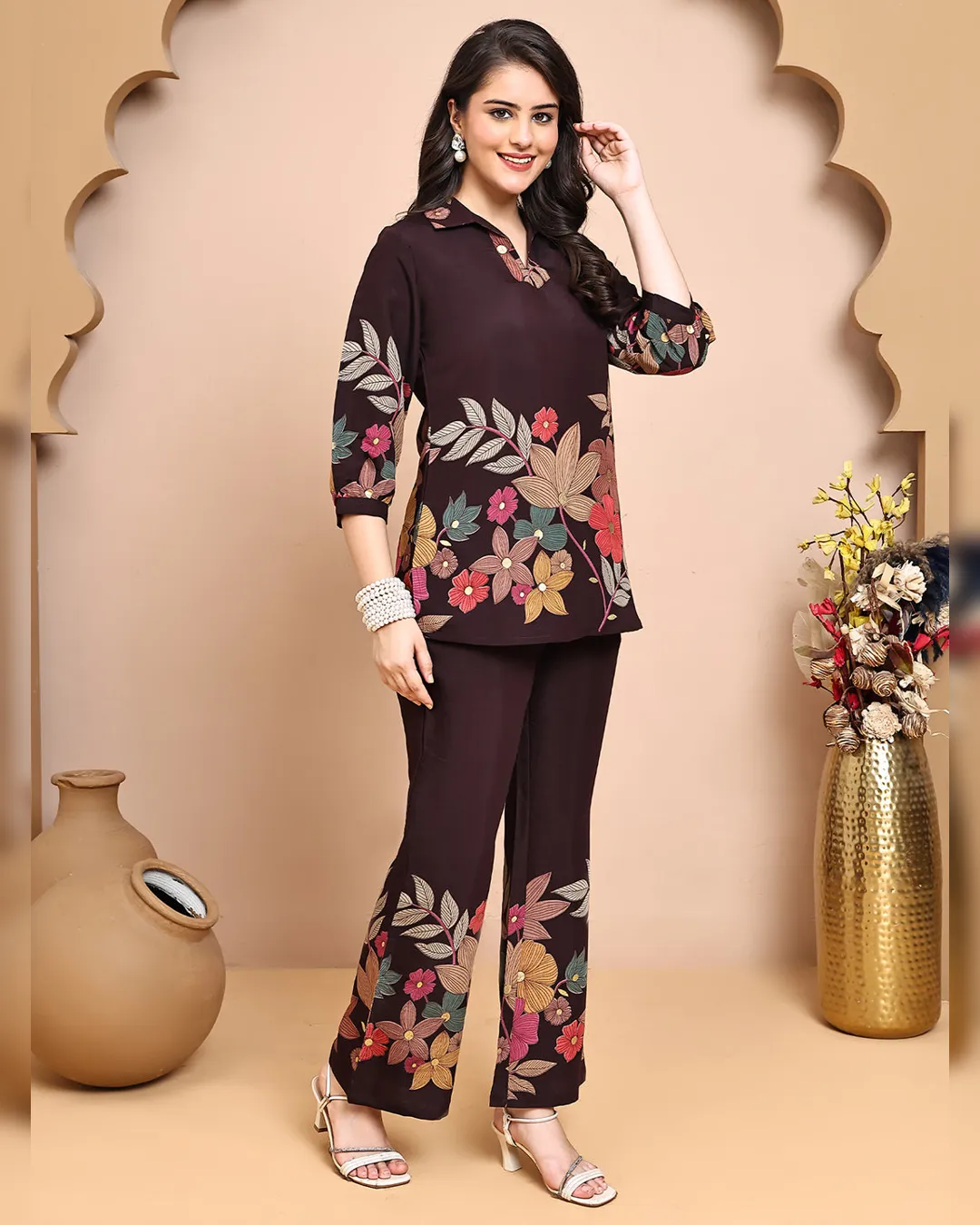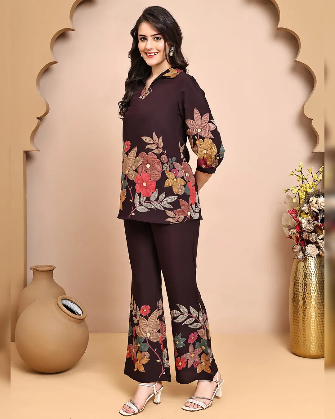 Coffee brown floral printed tunic and trousers co-ord set in Chanderi silk with drawstring trousers and shirt collar top—classy, breathable, and easy to wear.