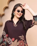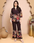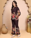 Step into effortless style with this coffee brown floral printed co-ord set made from premium Chanderi silk. Featuring a shirt-style tunic with a neat shirt collar and three-quarter sleeves, it’s paired with matching trousers that come with a drawstring closure and two pockets for everyday functionality. Light, breathable, and chic—ideal for brunches, get-togethers, or casual office wear.