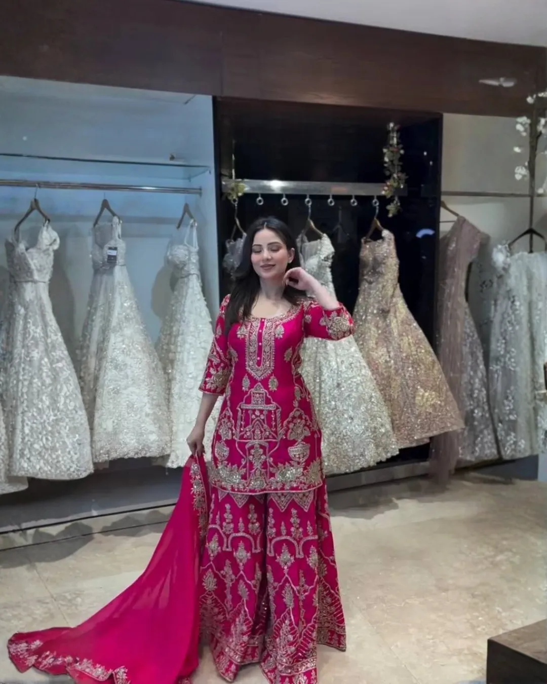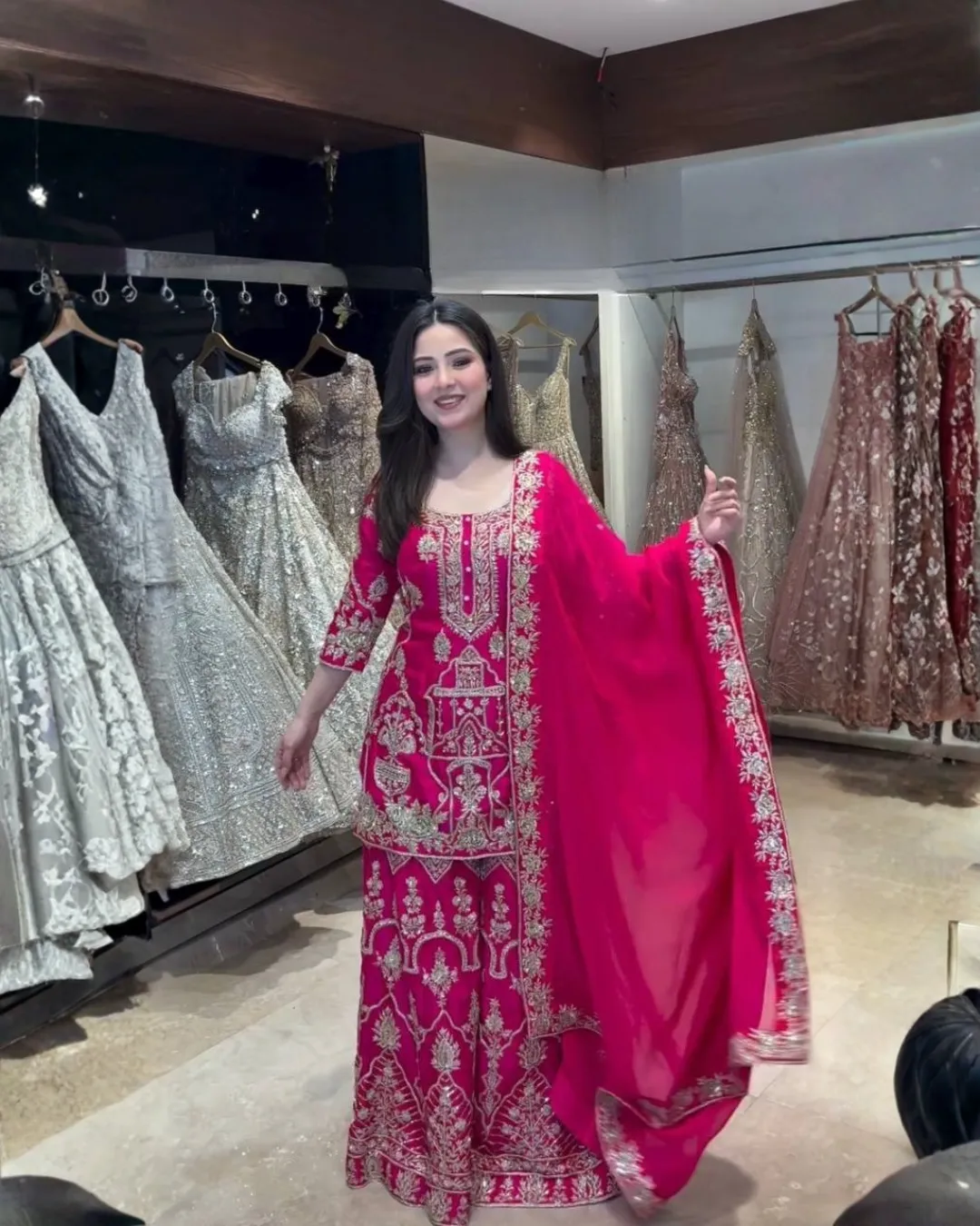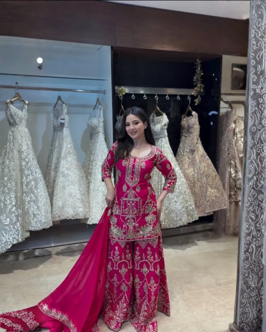 Paired with a matching sharara featuring heavy embroidery and elastic waist, this set ensures both style and ease of wear. The look is completed with a beautifully embroidered dupatta, making it a perfect choice for weddings, parties, and festive occasions.