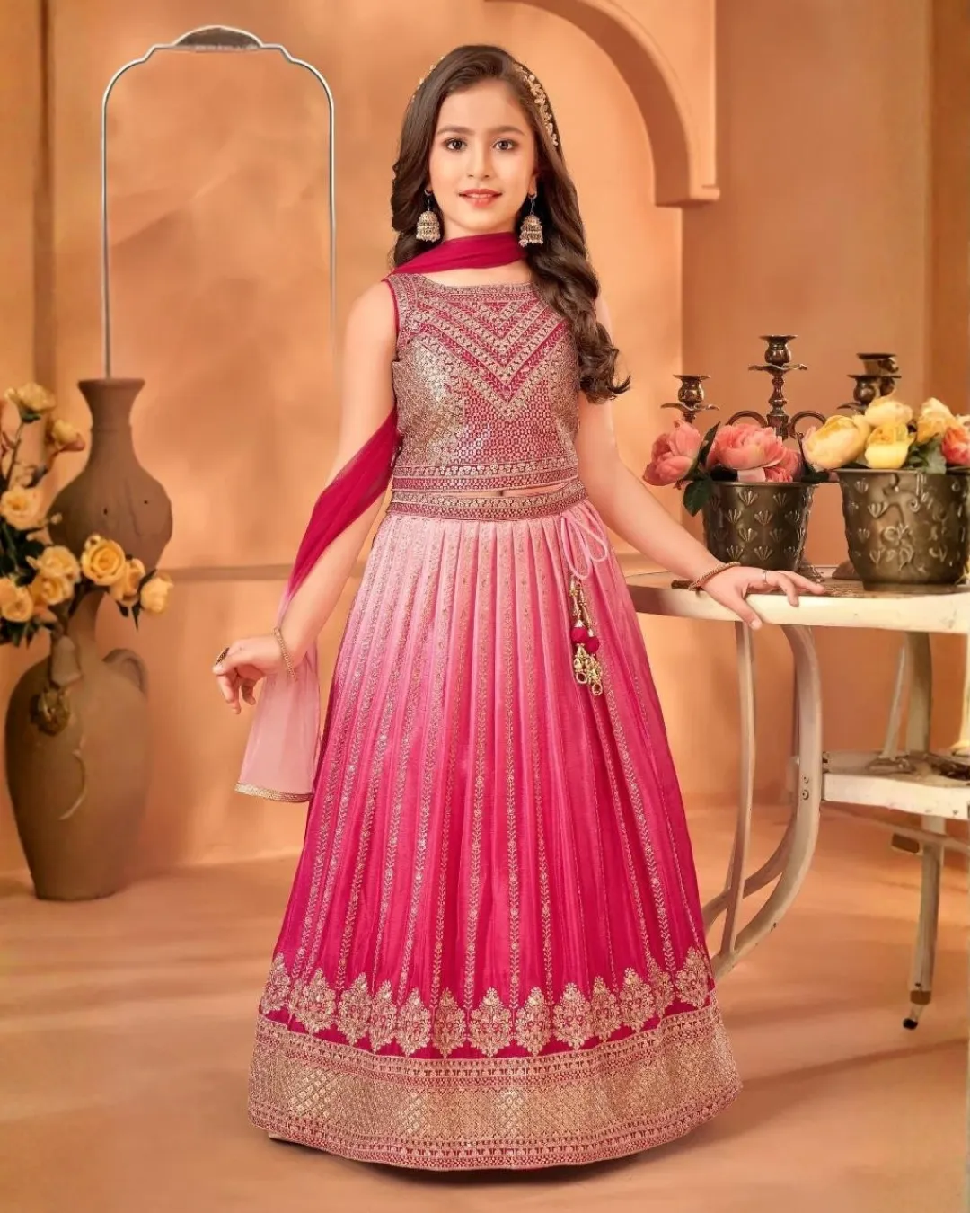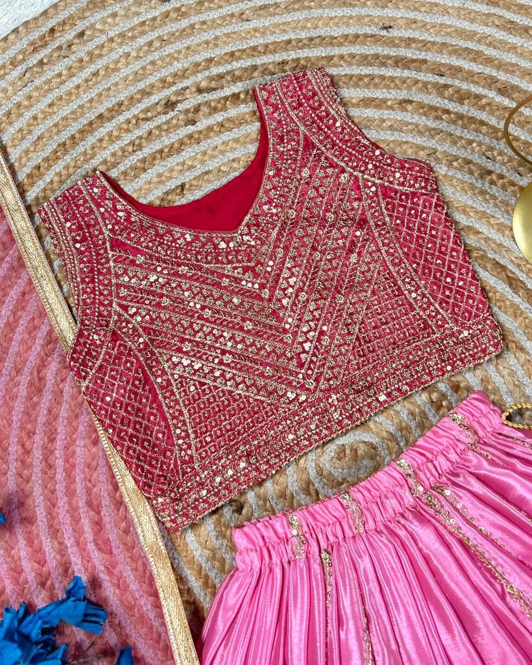 Stylish designer lehenga set crafted in soft chinon silk with elegant sequins embroidery and print work, paired with a butterfly net dupatta with lace border. Fully stitched and ready to wear for special occasions.
