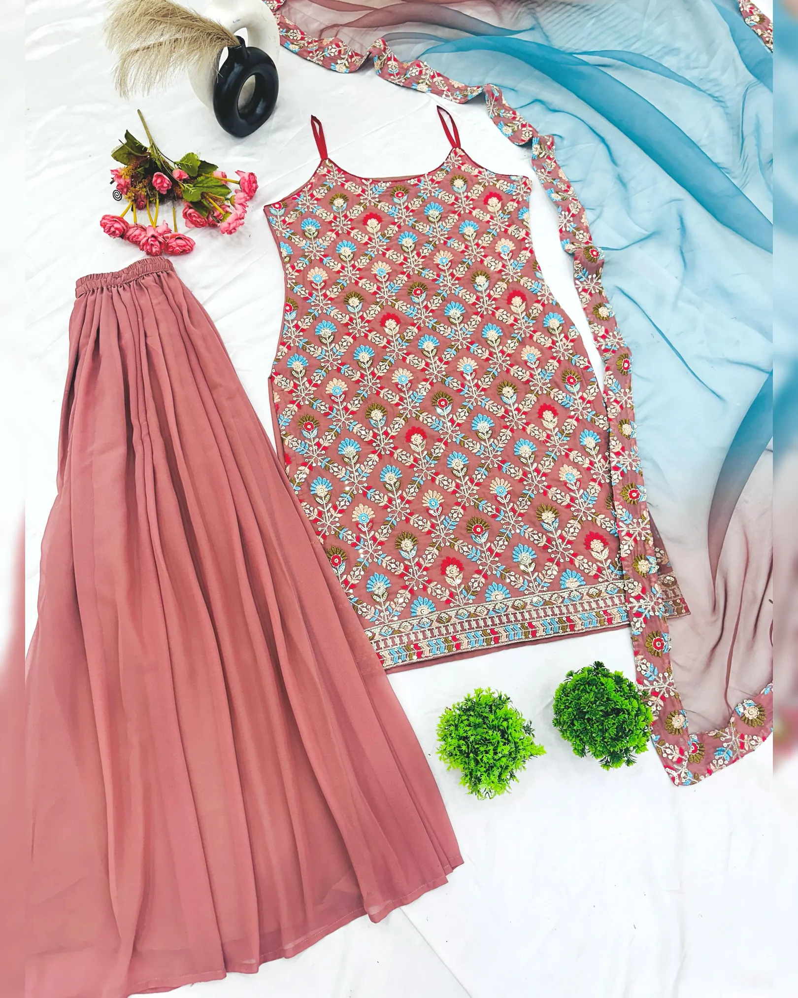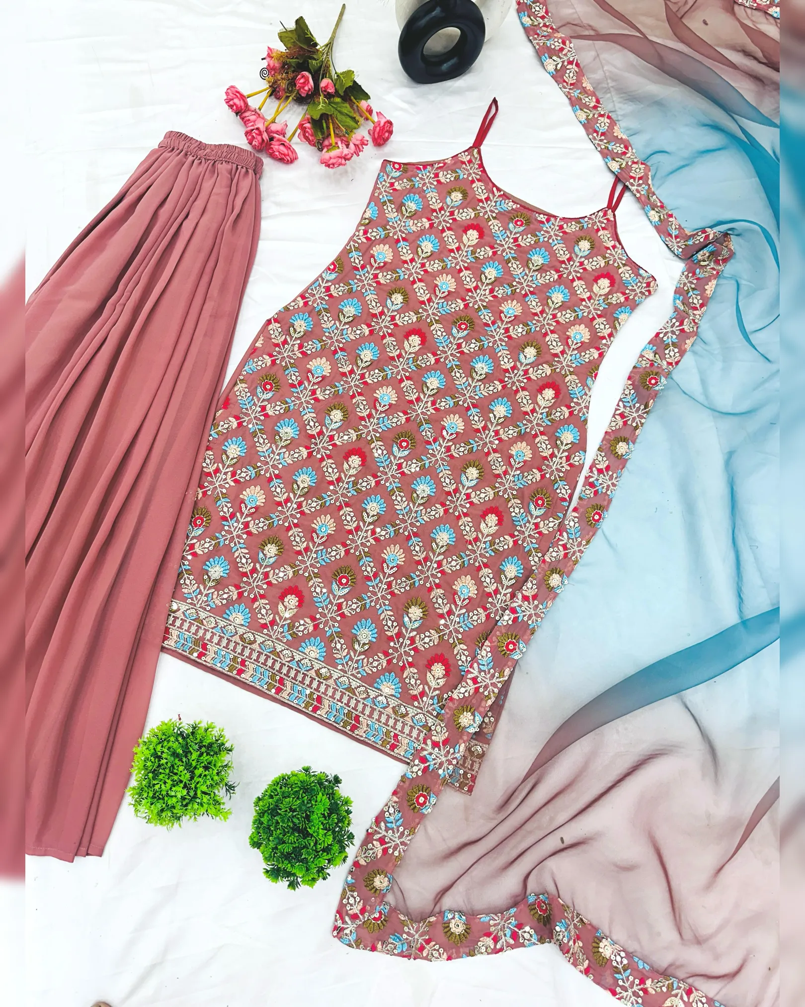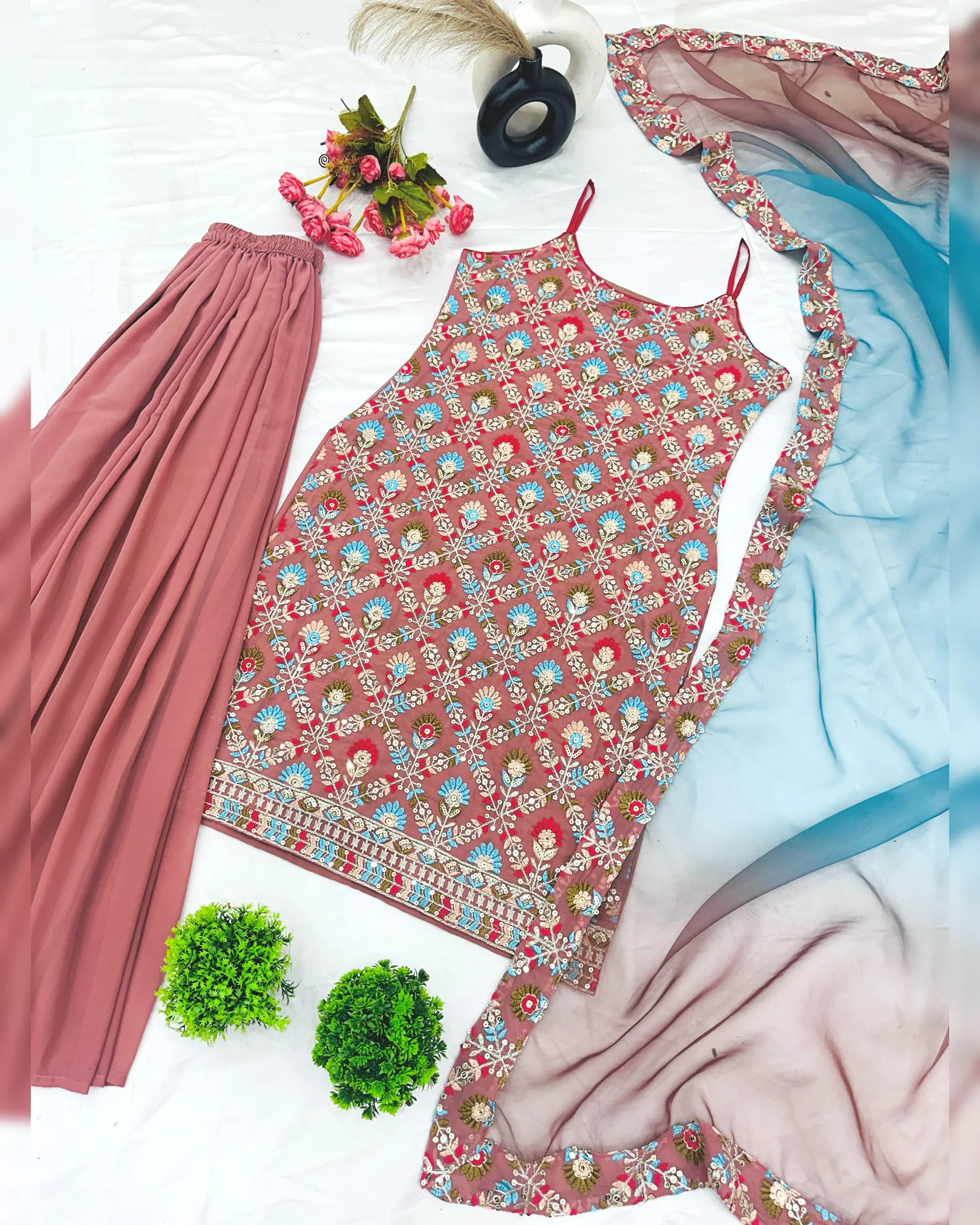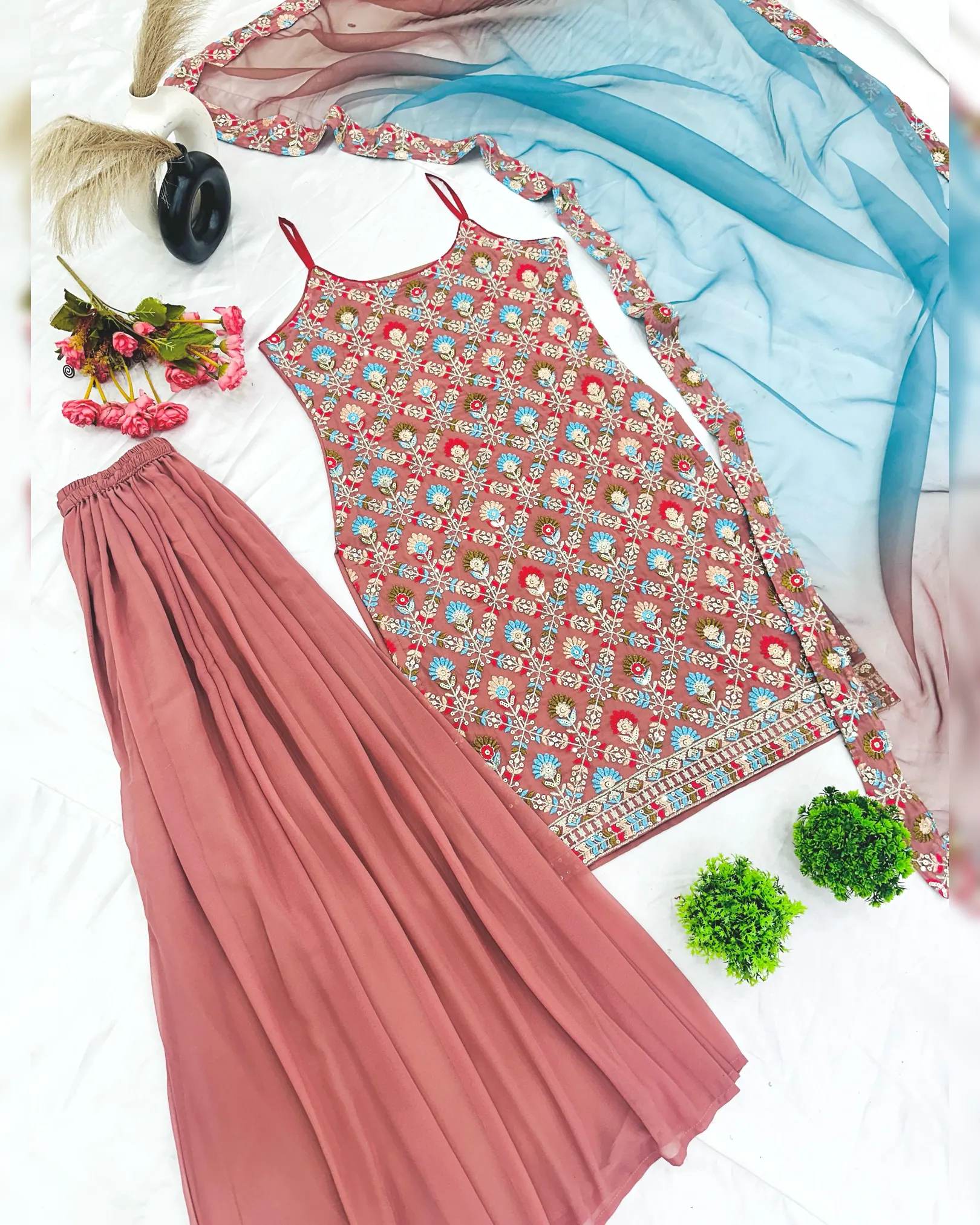 Drape yourself in luxury and sophistication with this exquisite Heavy Faux Georgette Top-Sharara & Dupatta Set. The intricate 5mm embroidery sequence work enhances its charm, while the Micro Cotton lining ensures all-day comfort. The Sharara Plazzo adds a stylish flair with its flowy design and elastic fit, making movement effortless. Paired with a stunning embroidered dupatta, this ensemble is perfect for weddings, parties, and festive celebrations.