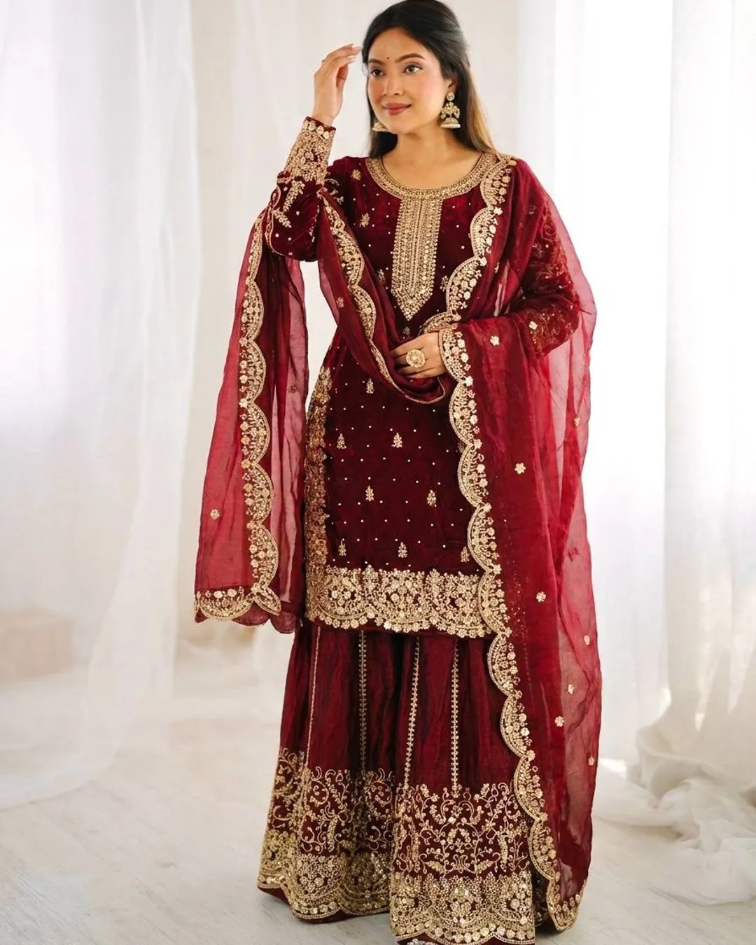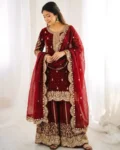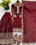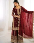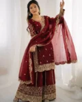 Completing the set is a Fendy Silk dupatta embellished with embroidery coding, sequence work, and a delicate lace border, adding an extra touch of elegance. This fully stitched ready-to-wear outfit is ideal for festive celebrations, parties, family gatherings, and special occasions.