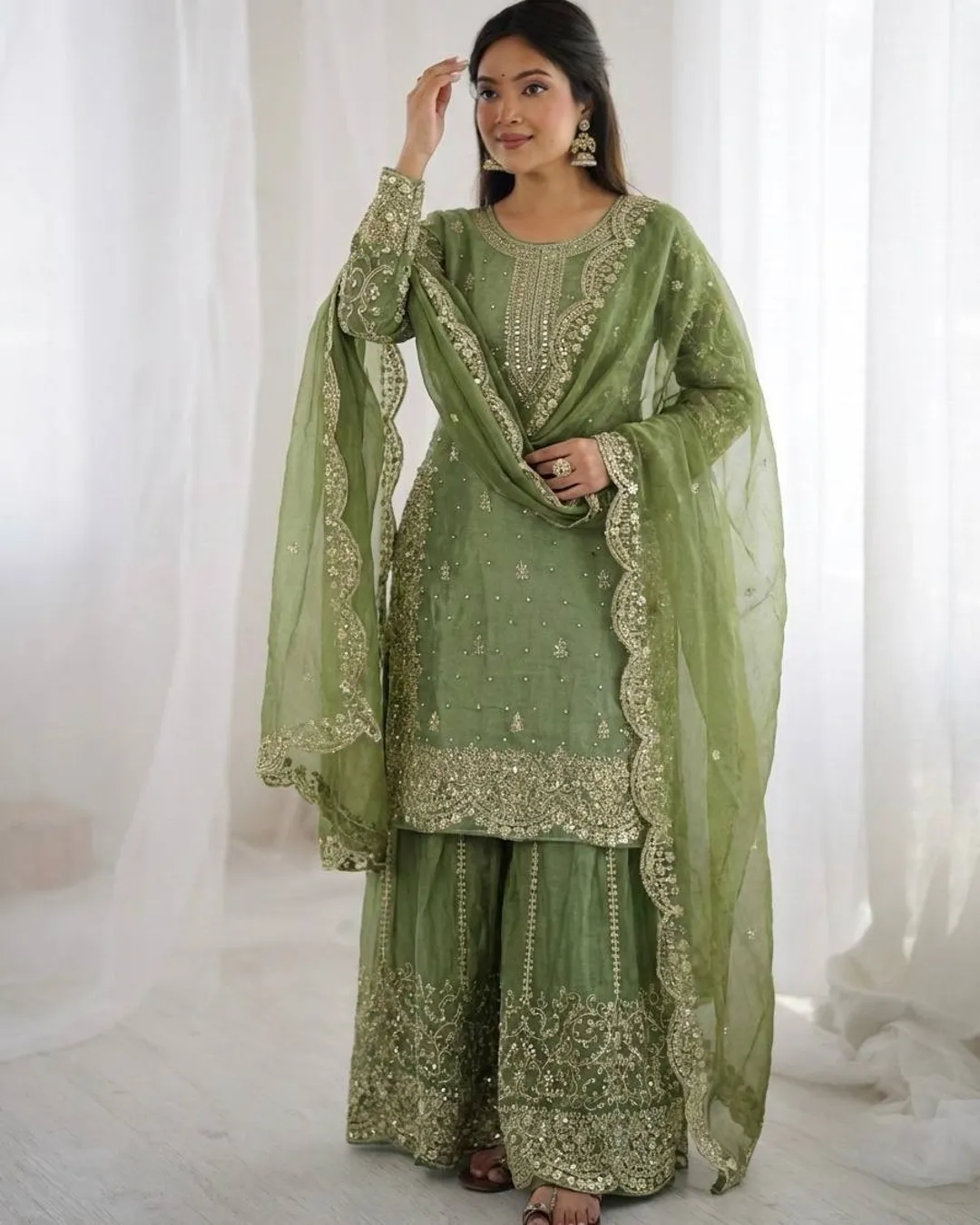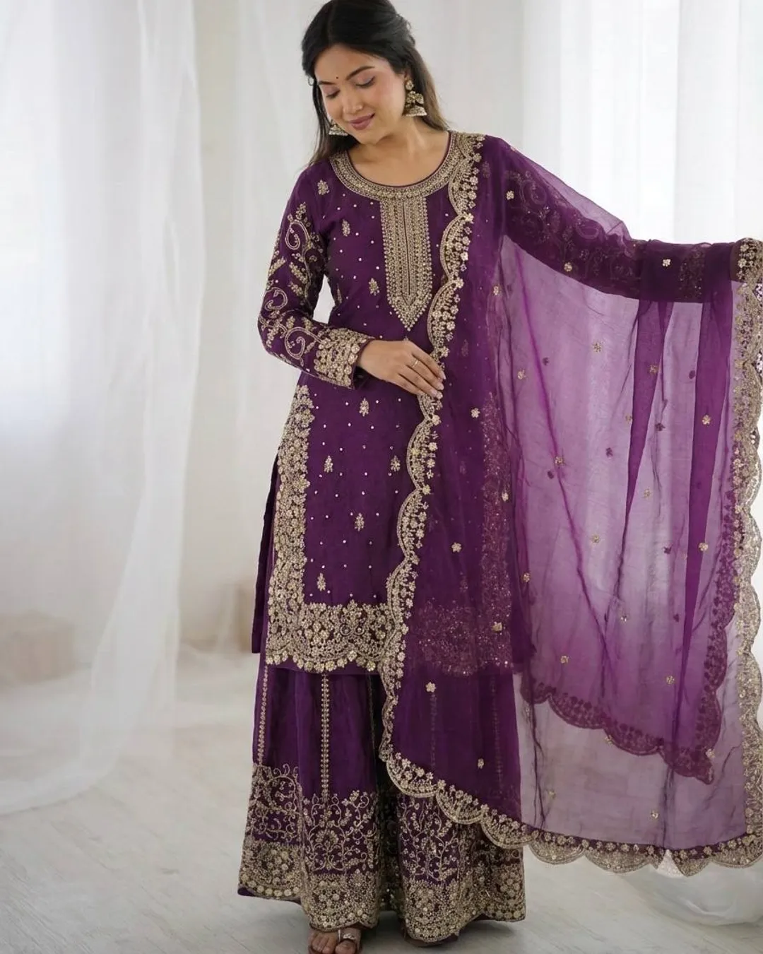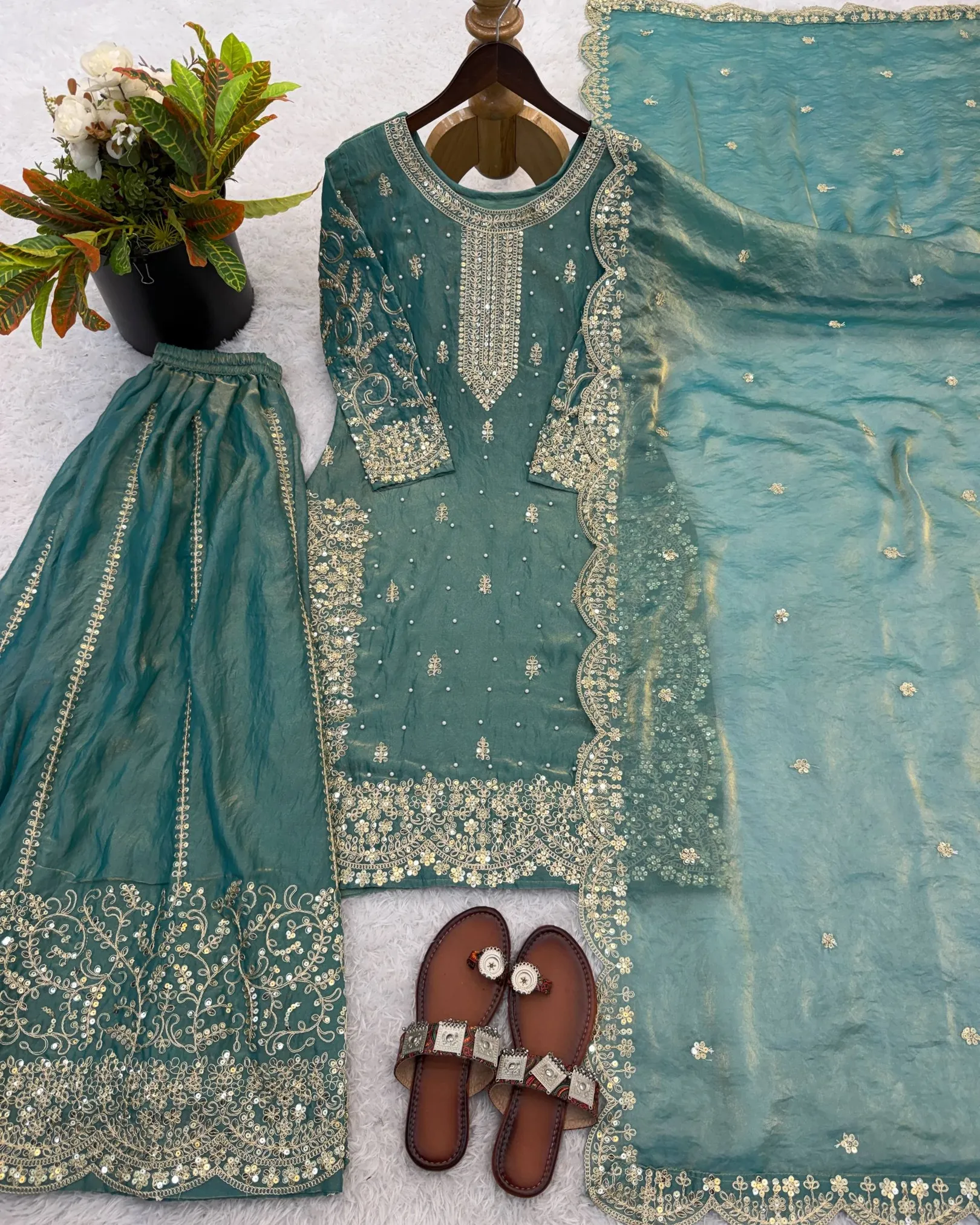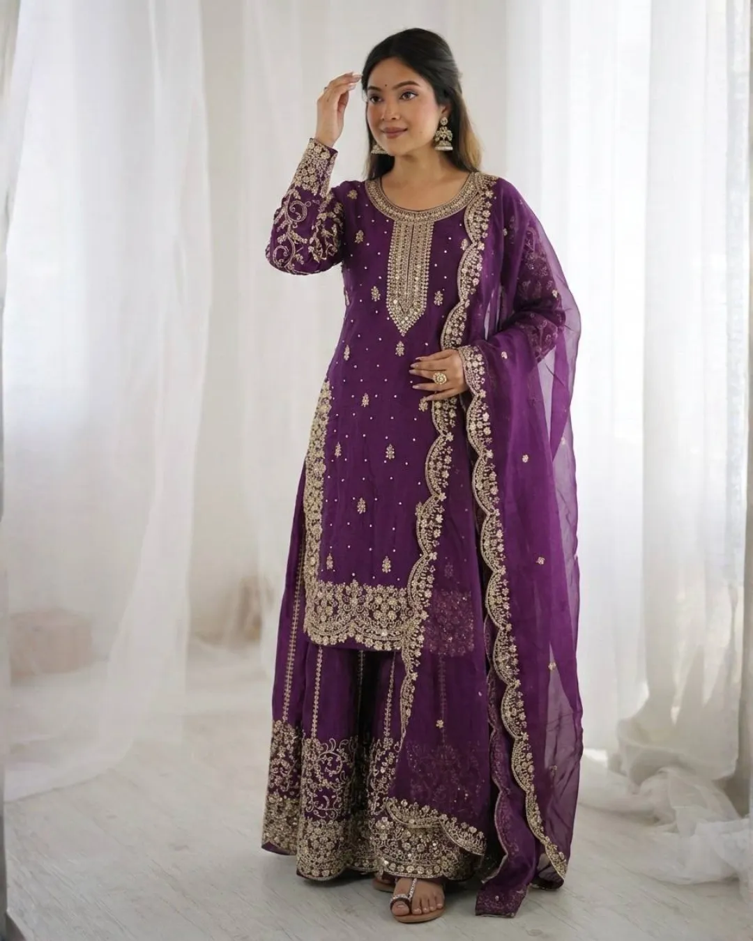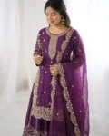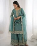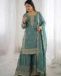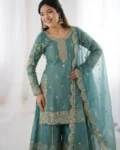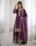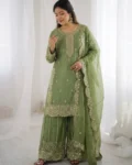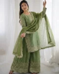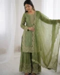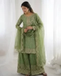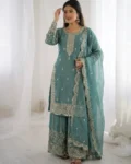 Add elegance to your ethnic wardrobe with this designer Fendy Silk Kurti Palazzo Dupatta Set, crafted for women who love stylish and graceful outfits. The beautiful kurti is adorned with intricate embroidery coding and sequence work, giving it a rich and festive appeal.