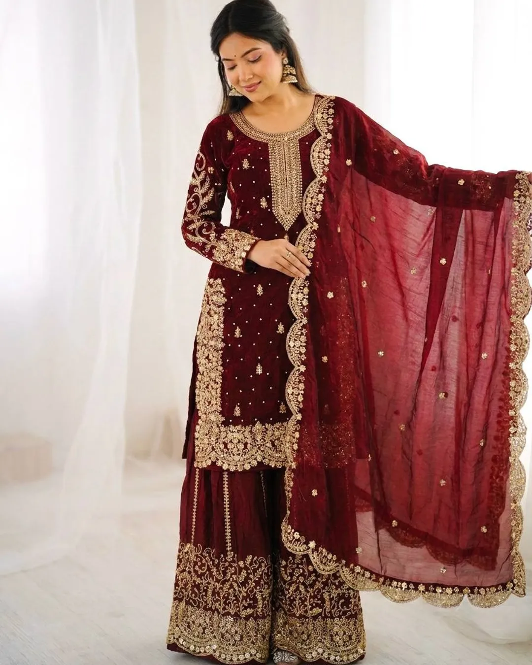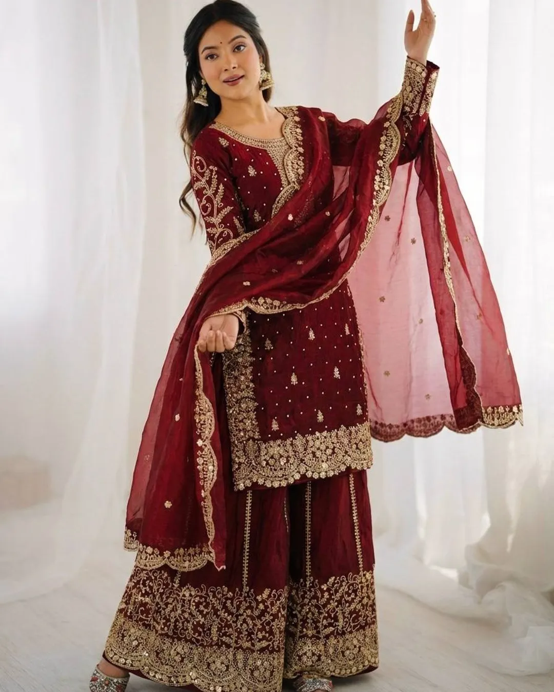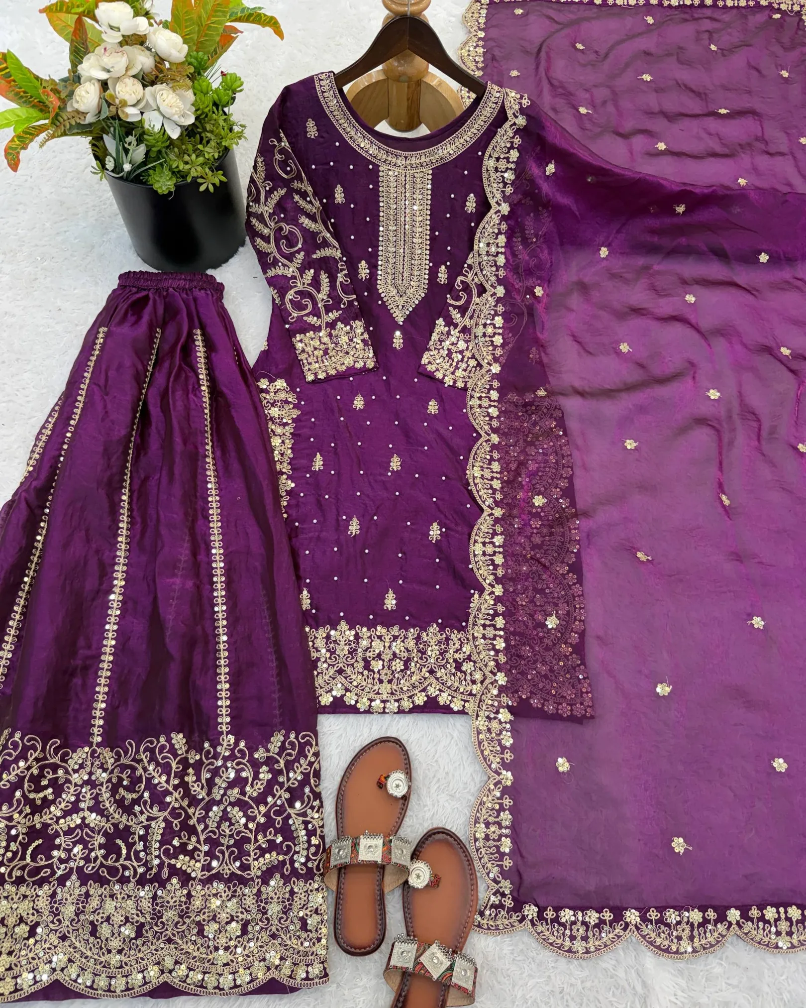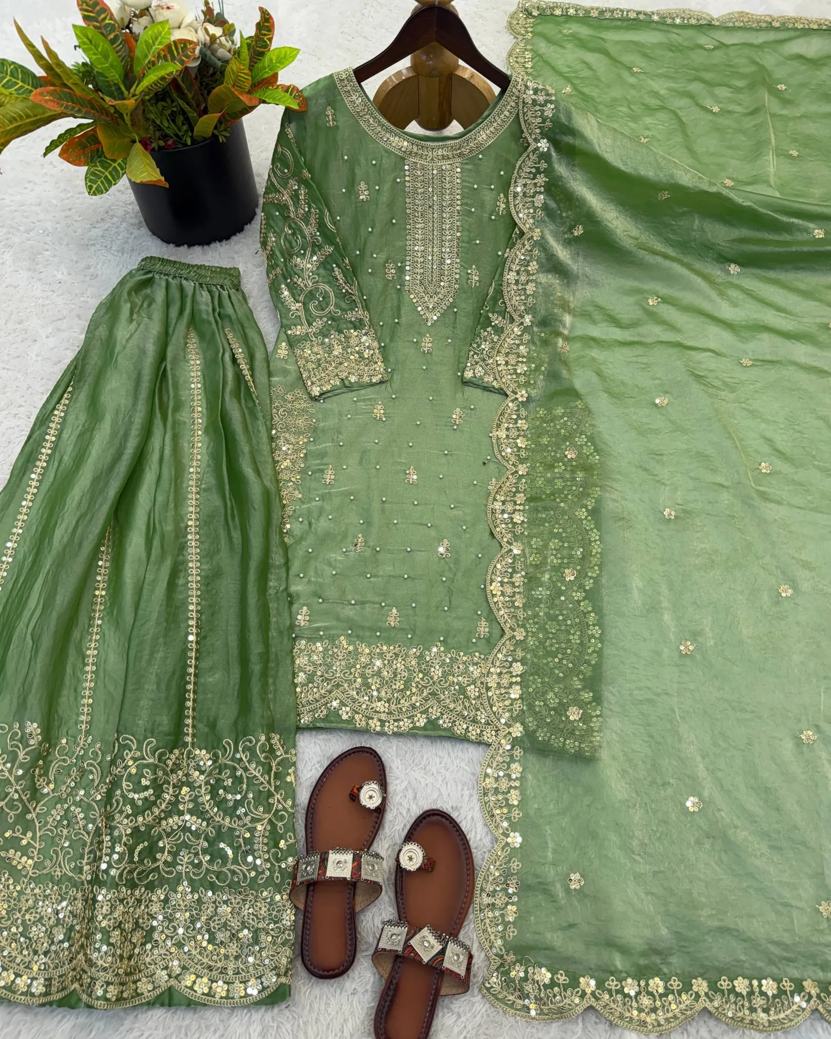 Add elegance to your ethnic wardrobe with this designer Fendy Silk Kurti Palazzo Dupatta Set, crafted for women who love stylish and graceful outfits. The beautiful kurti is adorned with intricate embroidery coding and sequence work, giving it a rich and festive appeal.