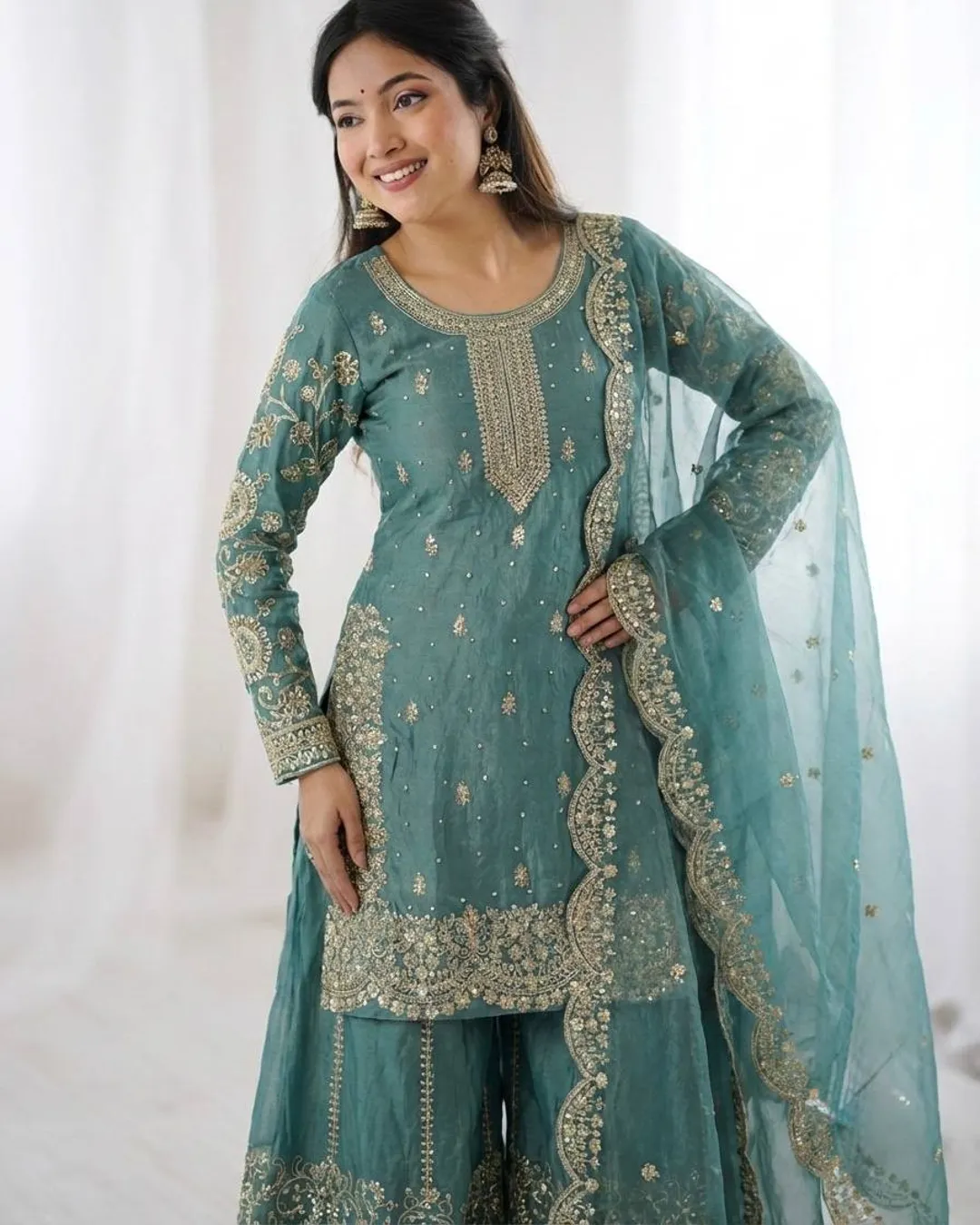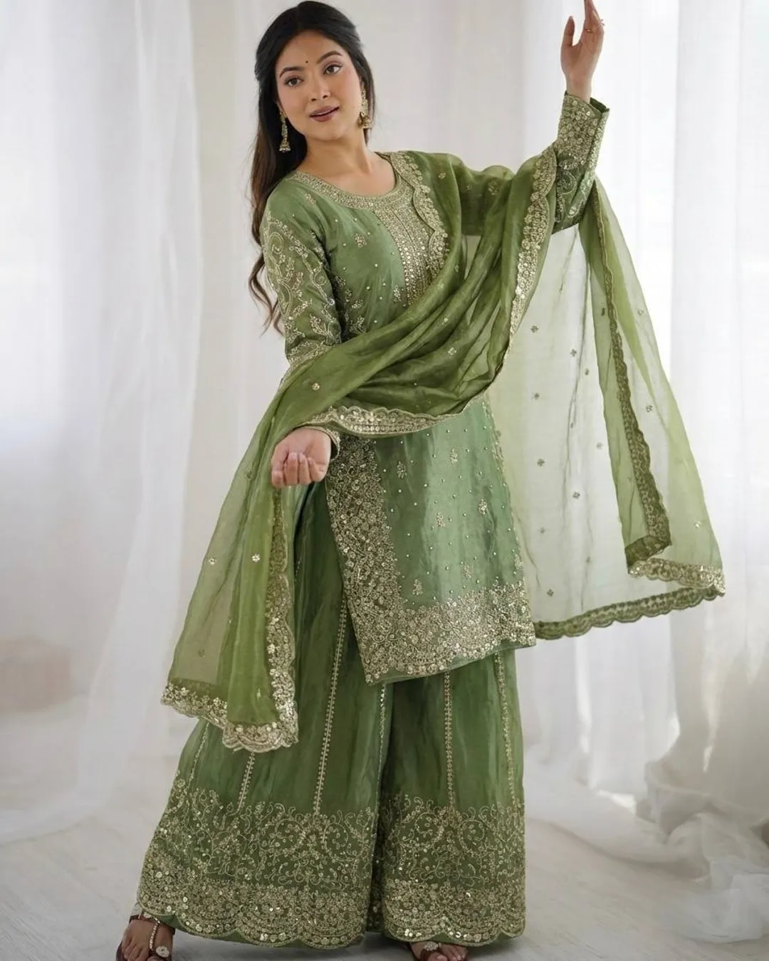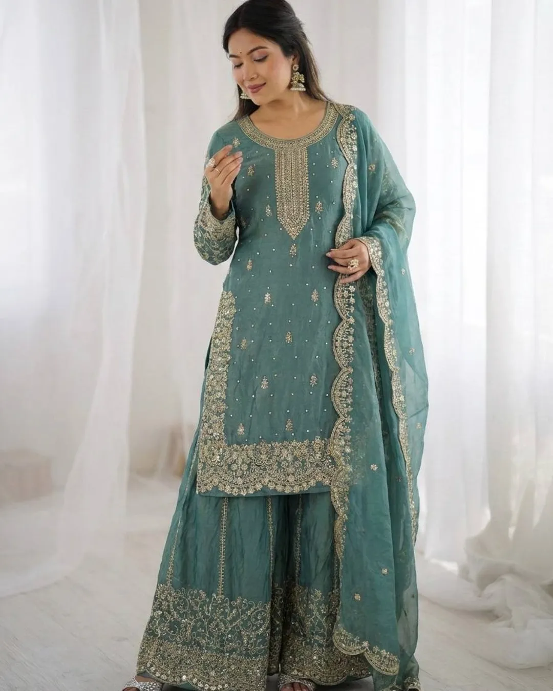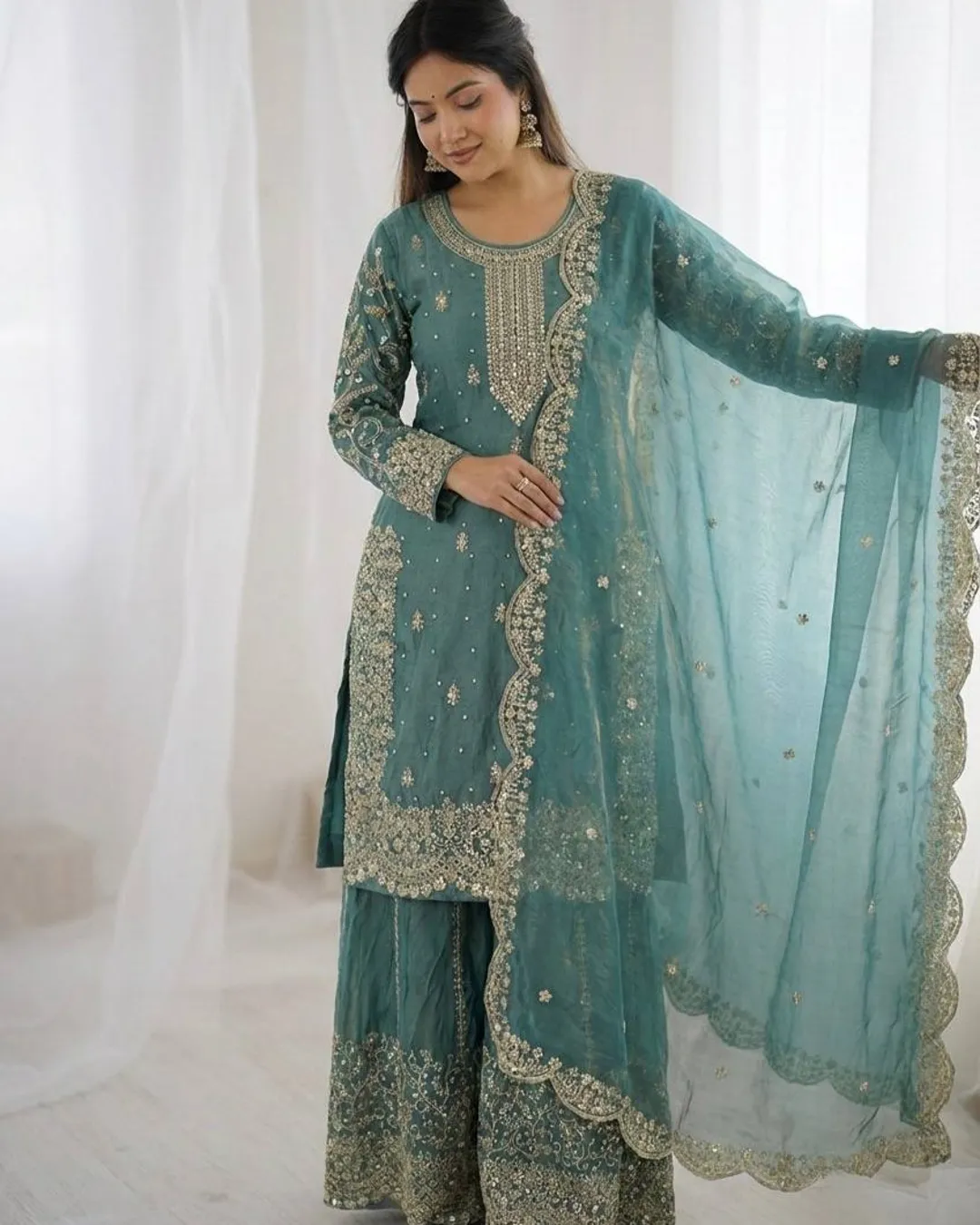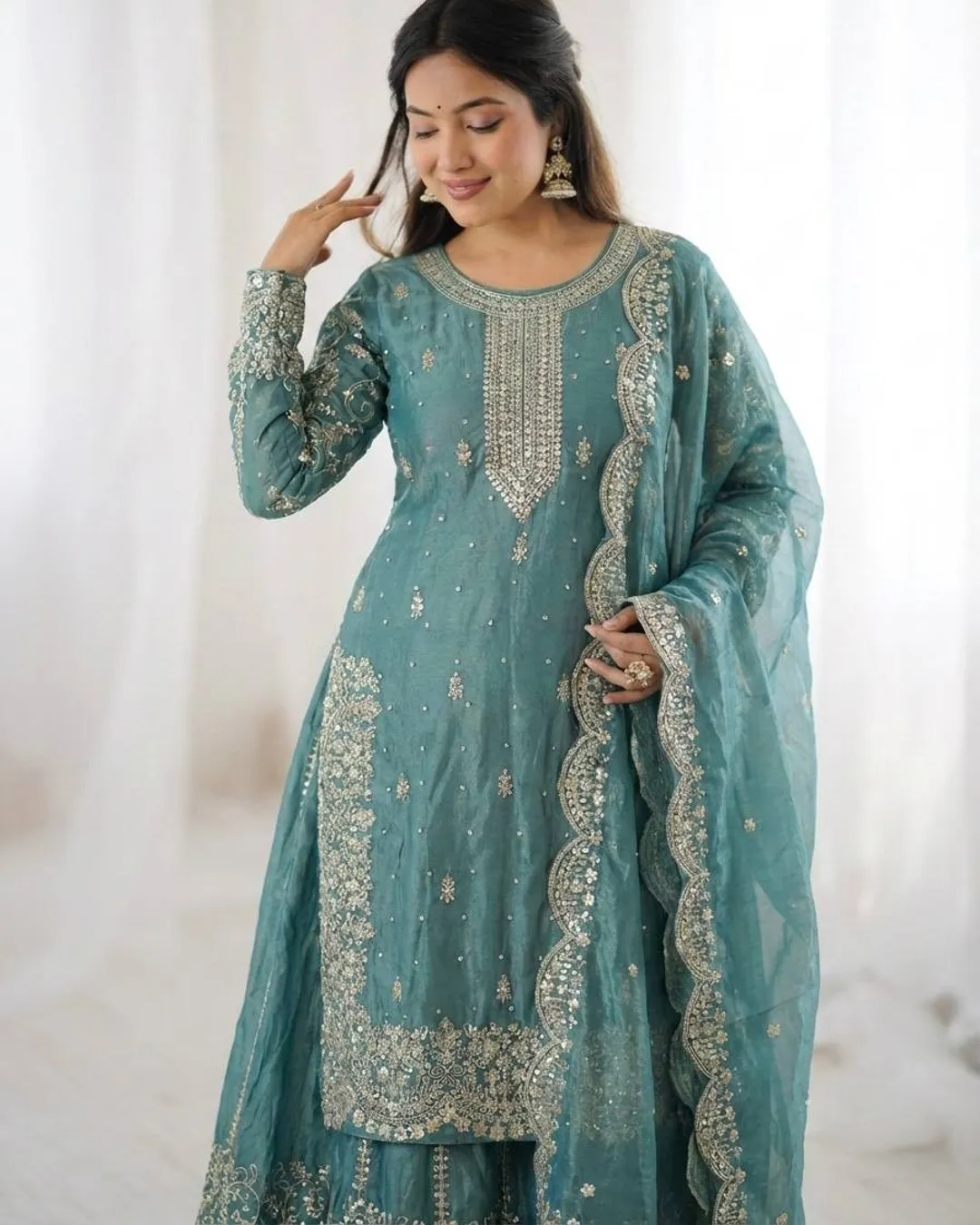 Elegant Fendy Silk 3-piece ethnic set featuring a beautifully embroidered kurti with coding and sequence work, matching palazzo, and a stylish dupatta with lace border. Perfect for festive and party wear.