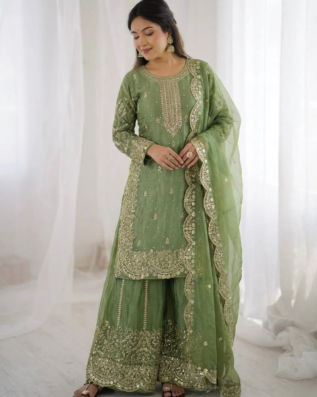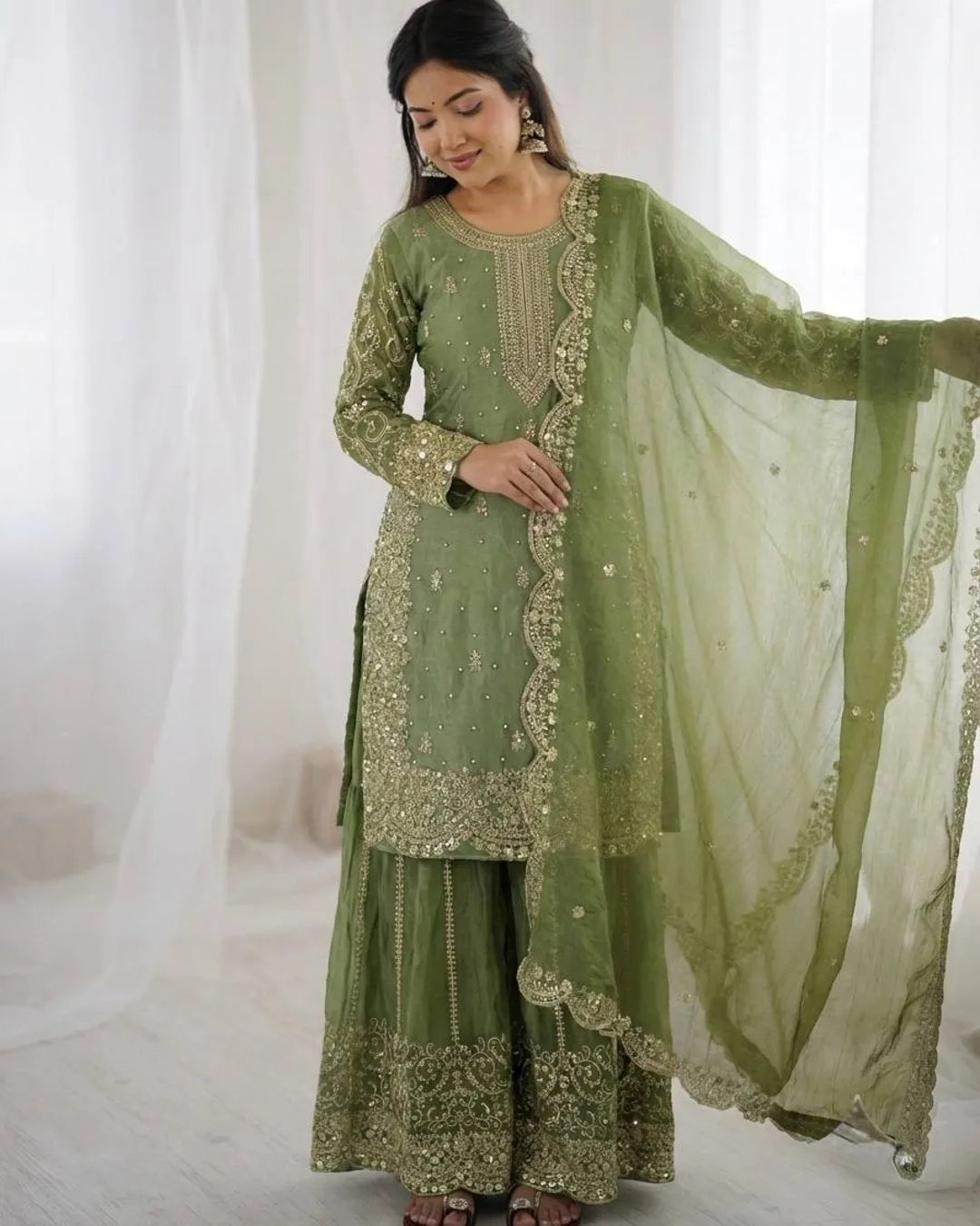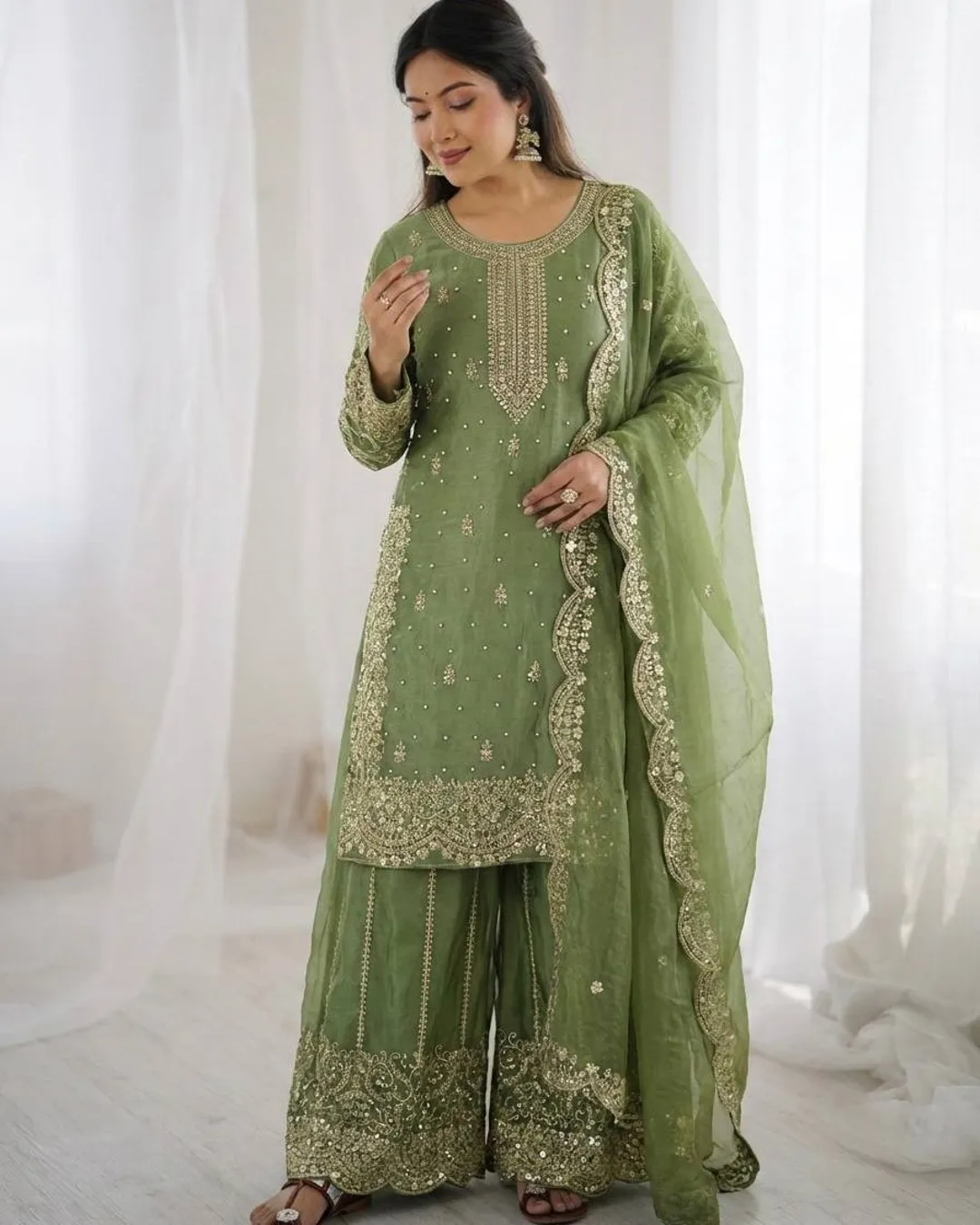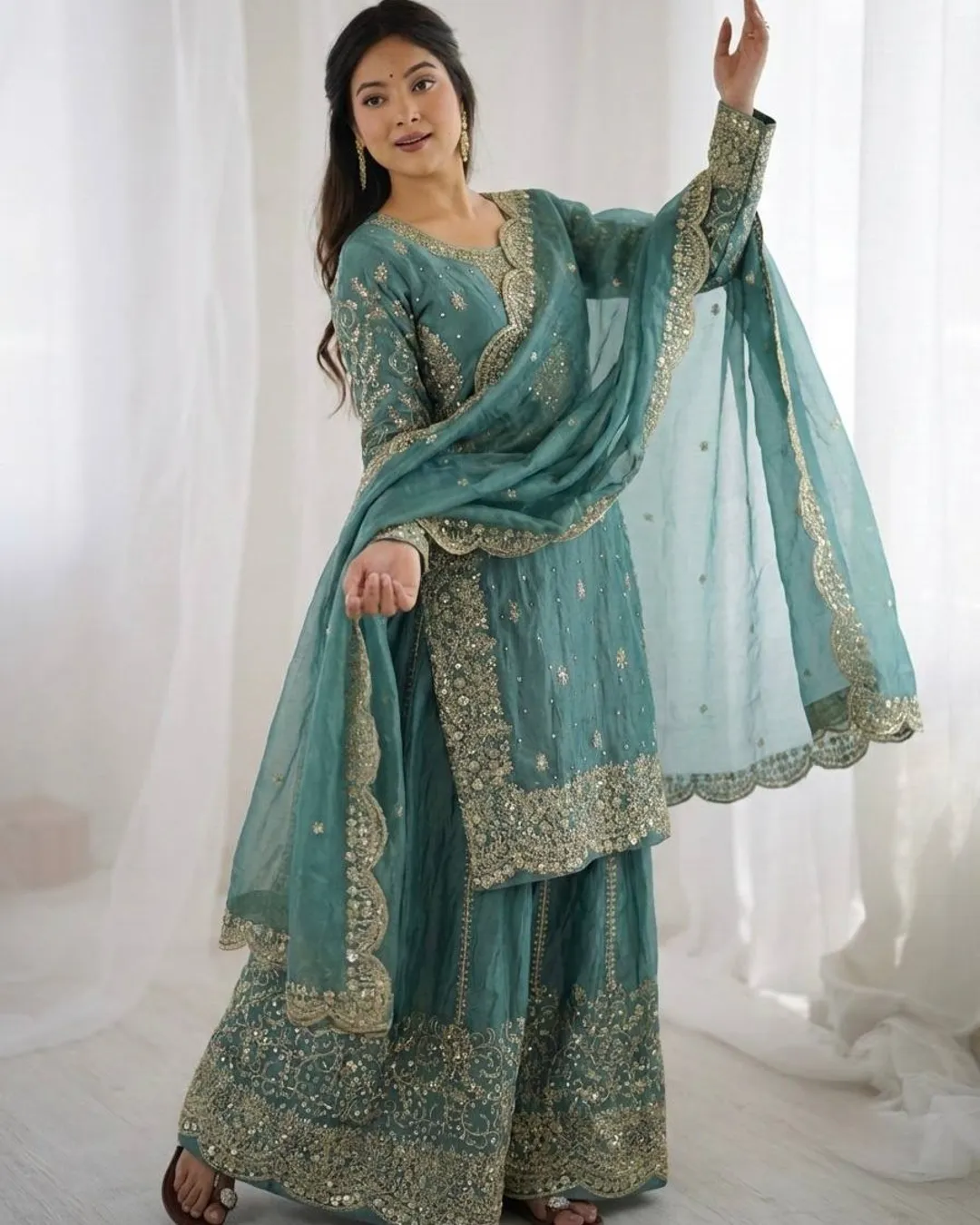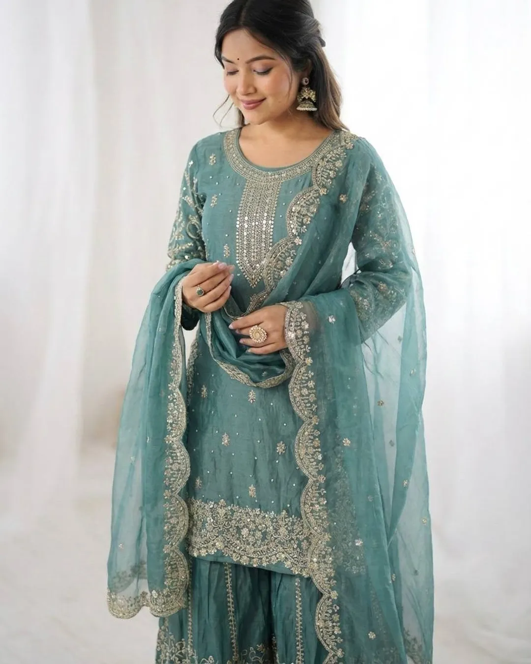 Elegant Fendy Silk 3-piece ethnic set featuring a beautifully embroidered kurti with coding and sequence work, matching palazzo, and a stylish dupatta with lace border. Perfect for festive and party wear.