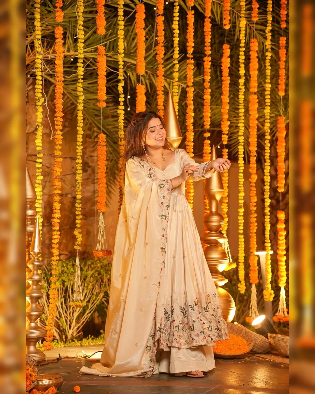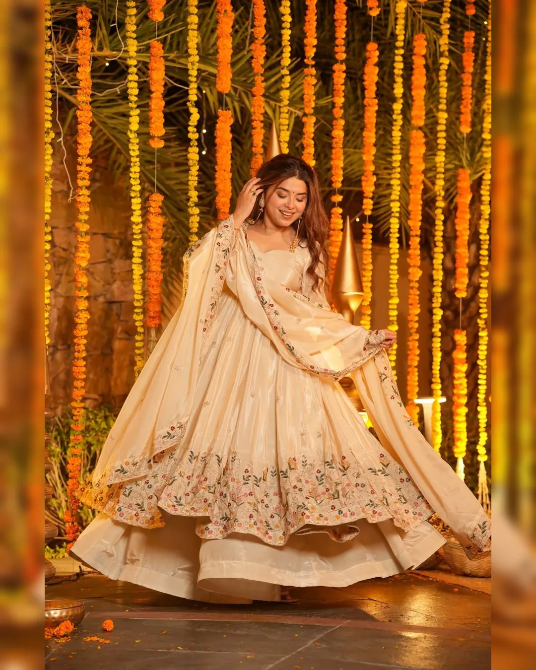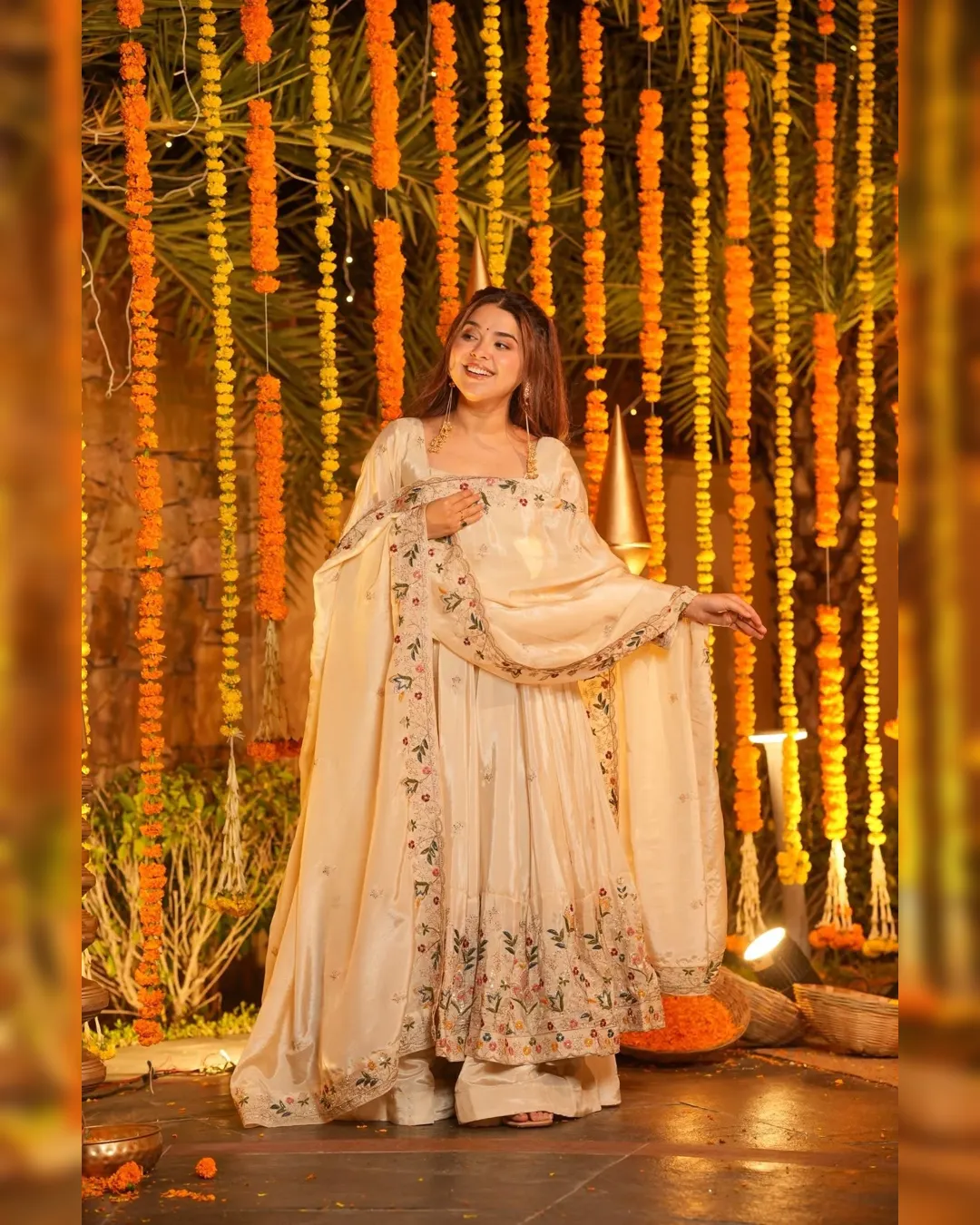 Presenting a New Designer Anarkali Suit in a stunning fancy style, crafted to make every celebration unforgettable. This elegant ensemble features a Heavy Natural Crepe Silk Anarkali, adorned with 5mm sequence and rich embroidery work with fully sleeved detailing. The 4-meter grand flair gives a royal, flowy silhouette, while the micro cotton inner ensures all-day comfort. Paired with a matching Crepe Silk Plazzo and a beautifully embroidered sequence work dupatta, this fully stitched set is perfect for festive functions, weddings, and special occasions. Designed with cups and a side zipper for a flawless fit, this outfit blends luxury, comfort, and timeless charm.