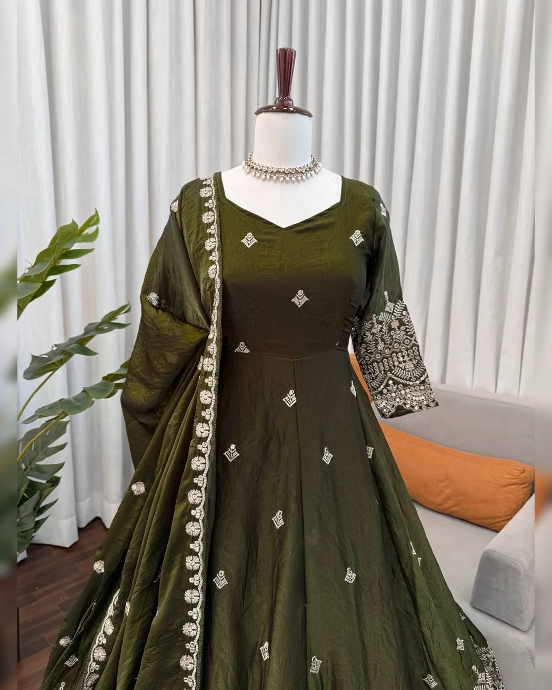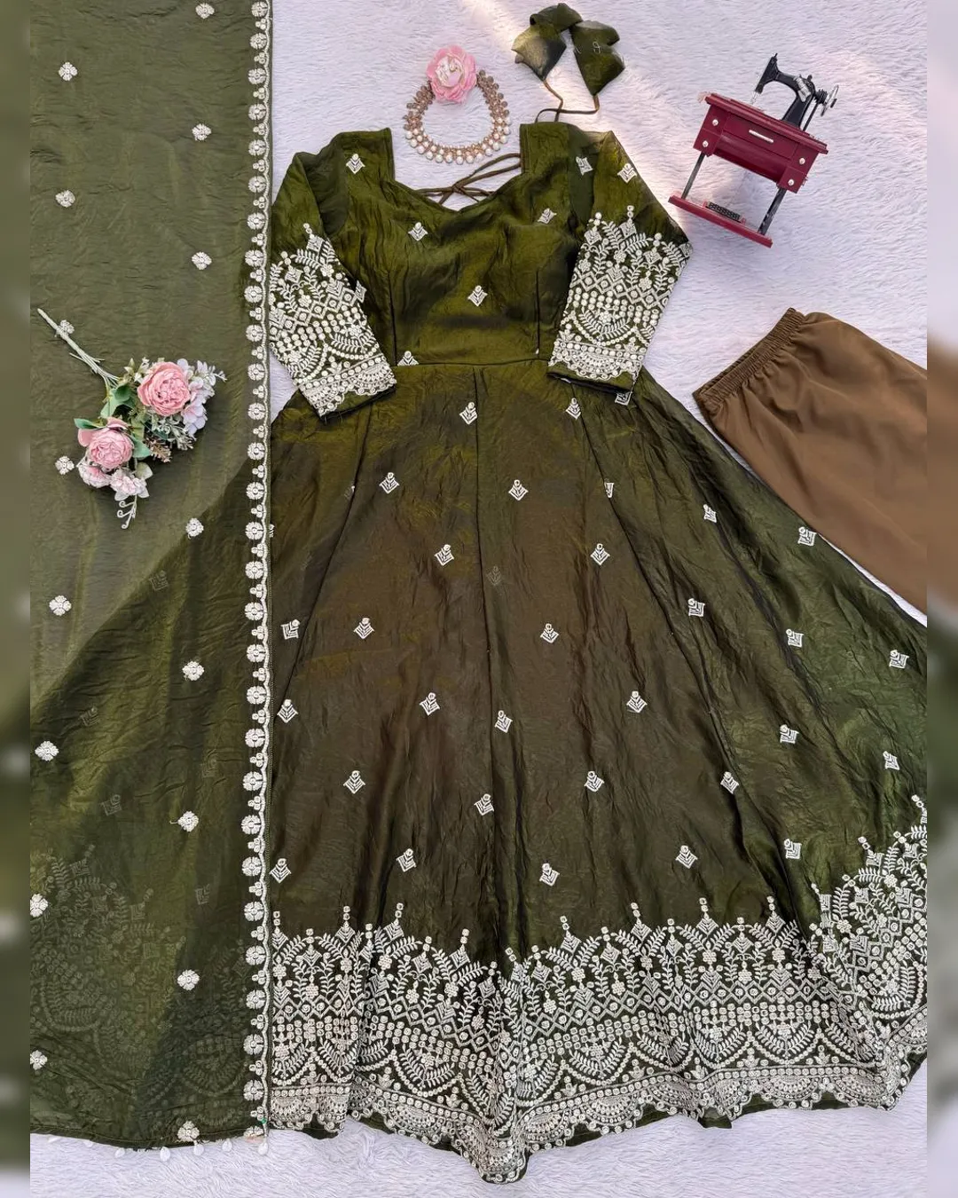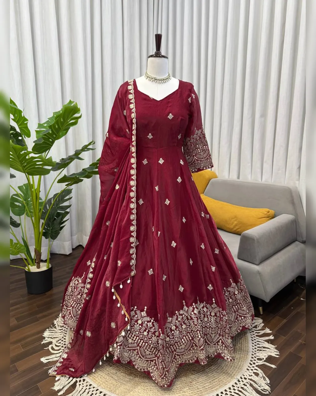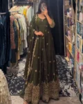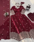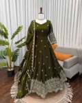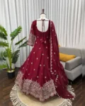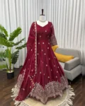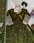 Make a grand style statement with this Designer Heavy Fendy Silk Gown Set, crafted for women who love luxurious ethnic fashion. The beautifully flared gown in premium Fendy silk features intricate thread and sequins embroidery, giving it a royal and festive appeal. Paired with a comfortable micro cotton pant and a matching Fendy silk dupatta adorned with fancy lace and shimmering sequence work, this ensemble is perfect for weddings, festive occasions, parties, and special celebrations. Designed for elegance, comfort, and glamour – all in one stunning outfit.