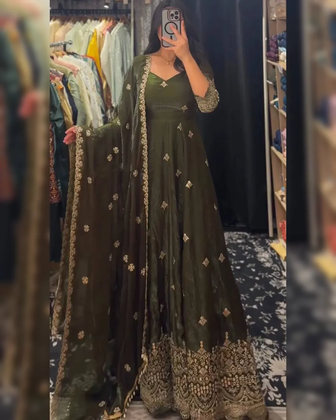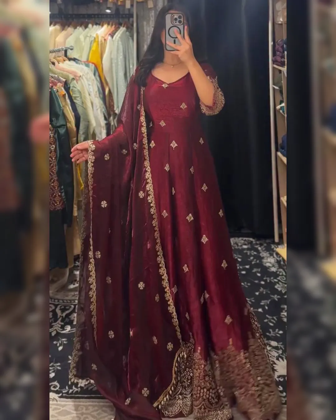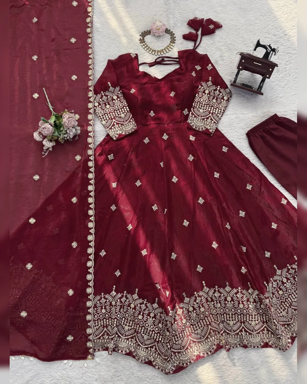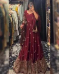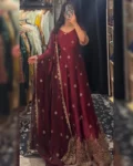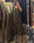 Premium heavy Fendy silk gown set with thread-sequins embroidery, flared silhouette, micro cotton pant, and matching embroidered dupatta for a regal festive look.