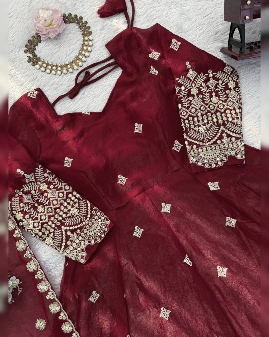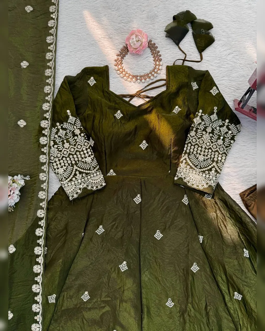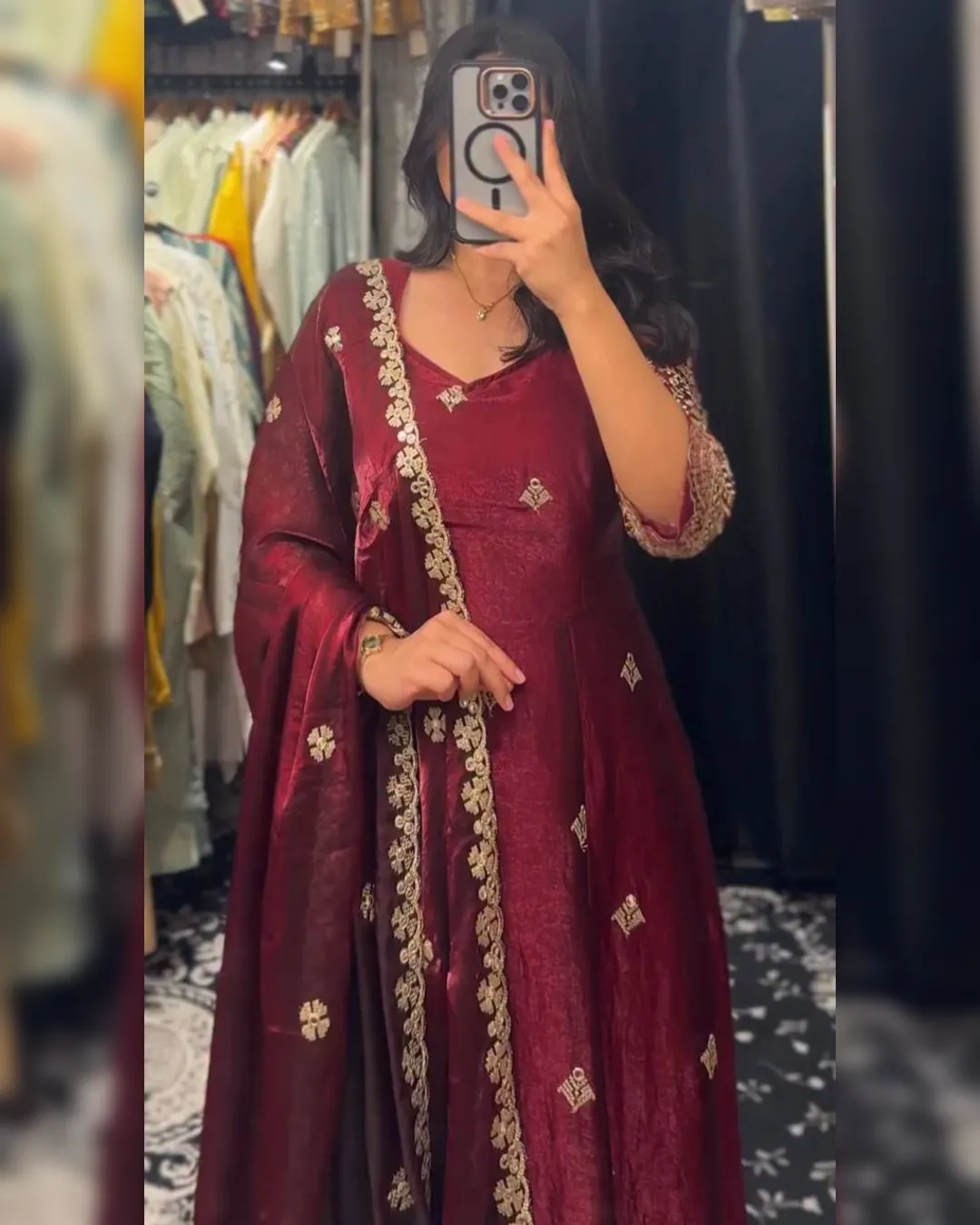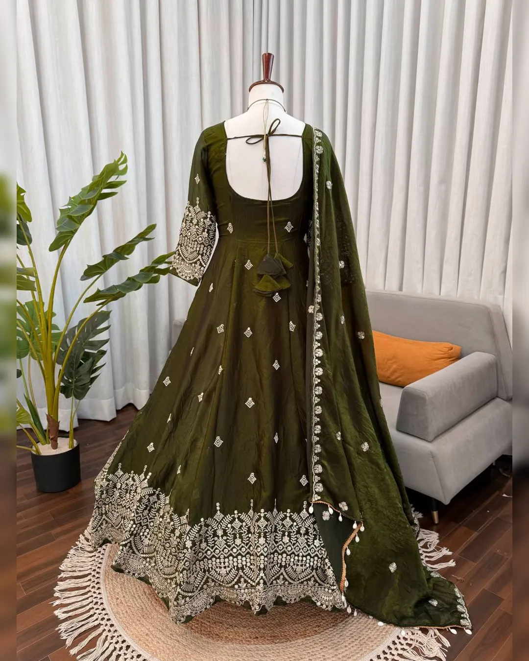 Premium heavy Fendy silk gown set with thread-sequins embroidery, flared silhouette, micro cotton pant, and matching embroidered dupatta for a regal festive look.