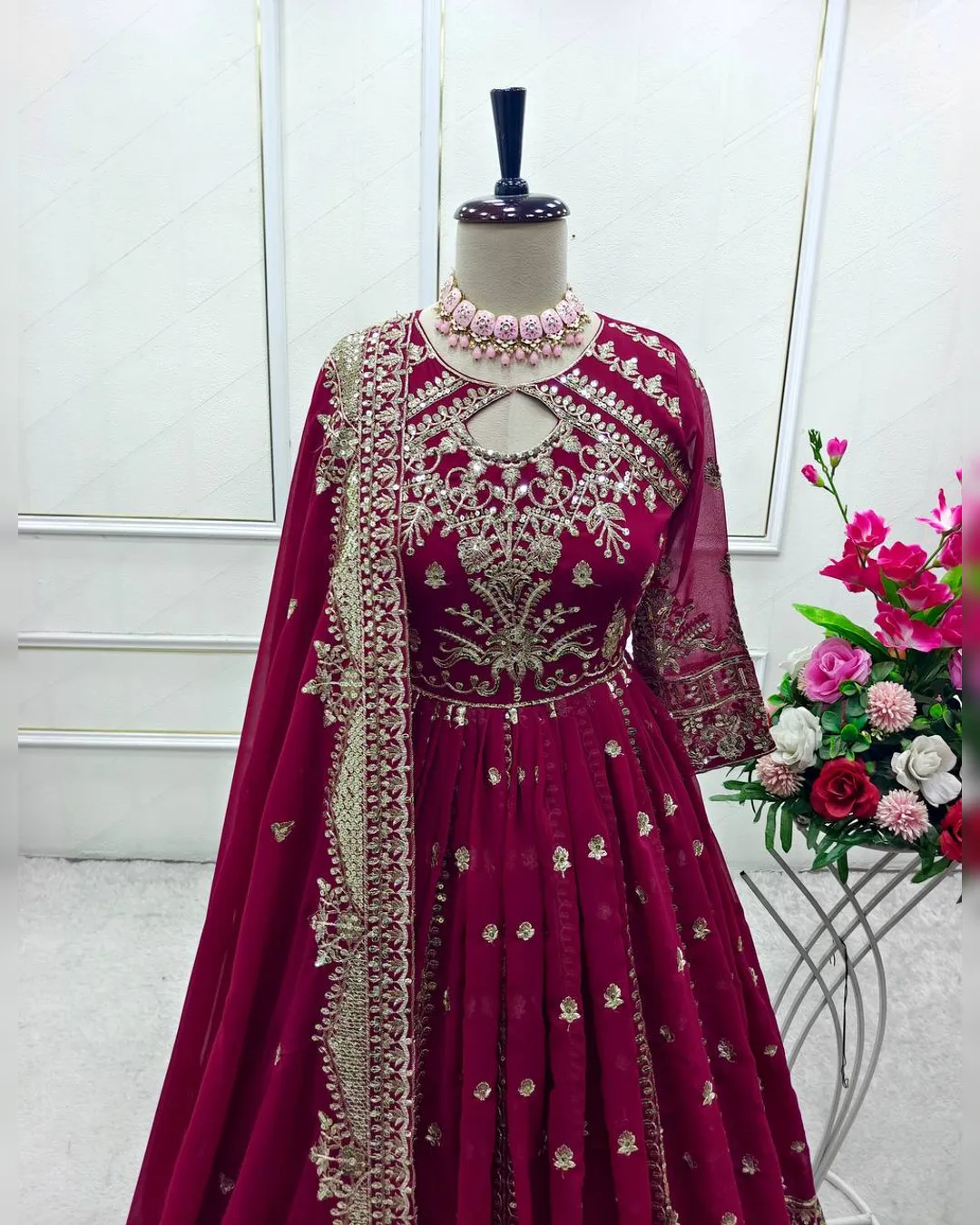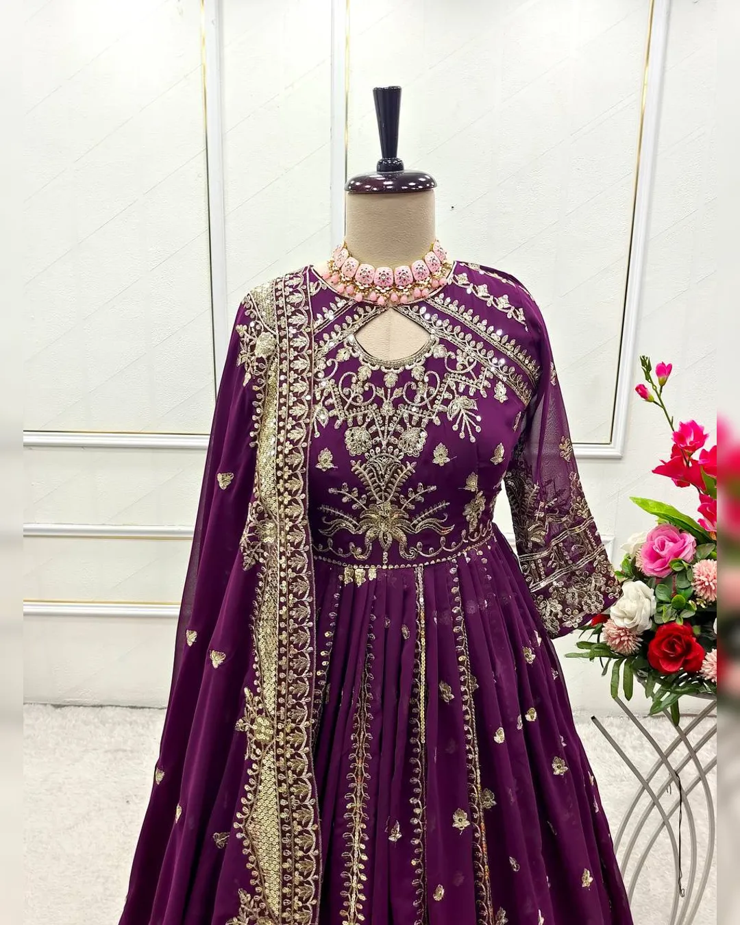 The gown features full sleeves with attached pad, a flowing 3-meter flair, and micro cotton inner lining for superior comfort. It is fully stitched for a perfect ready-to-wear fit. The set includes a matching micro cotton pant and a beautifully embroidered Fox Georgette dupatta, completing the designer look.