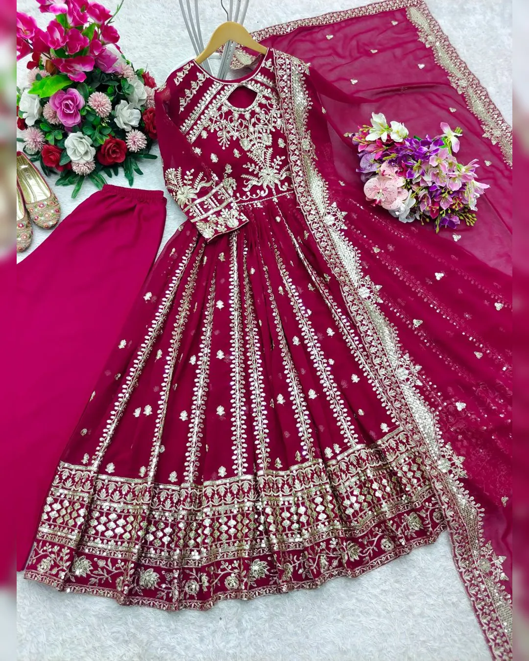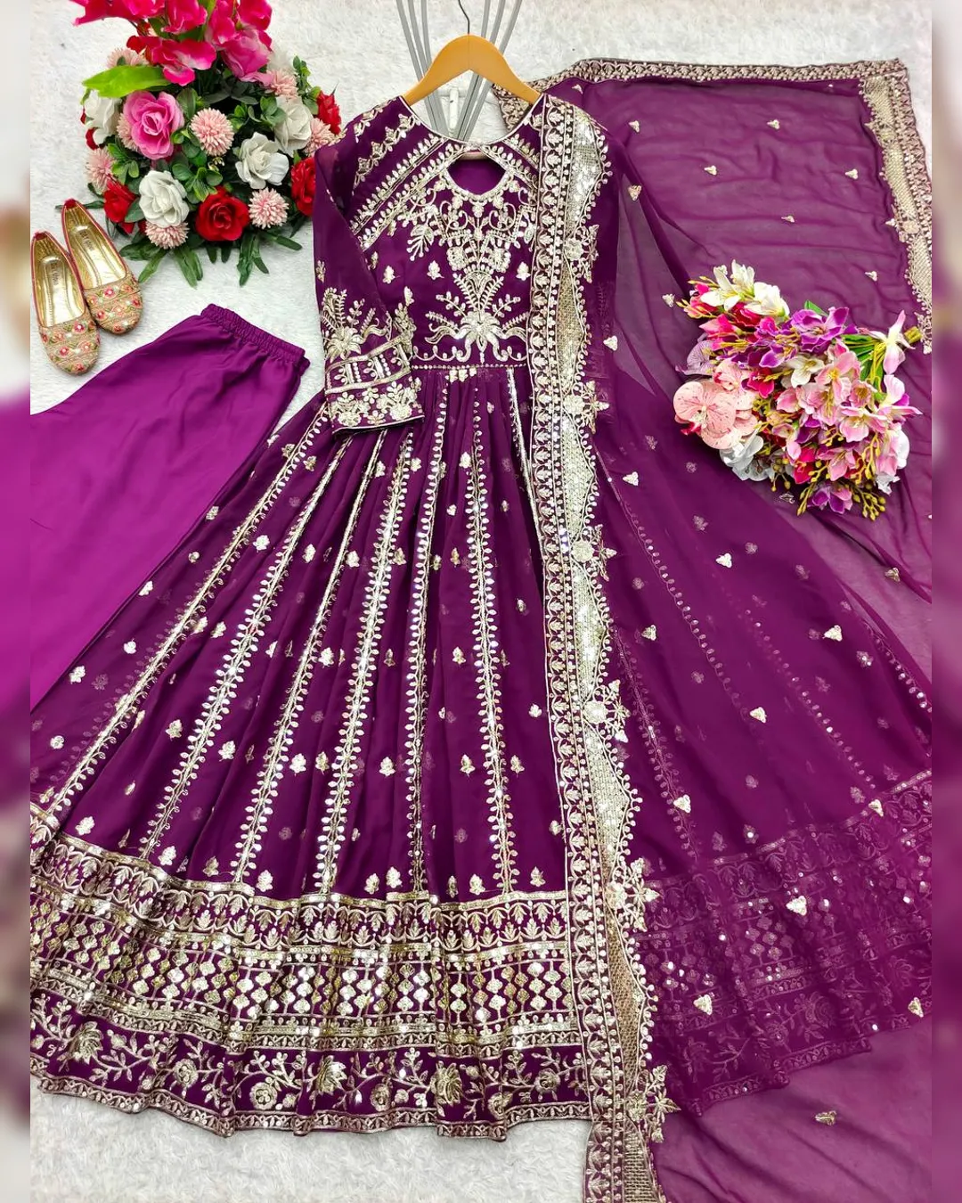 Heavy fox georgette gown with 5mm sequence embroidery, 3-meter flair, pant and matching dupatta — fully stitched designer party wear.