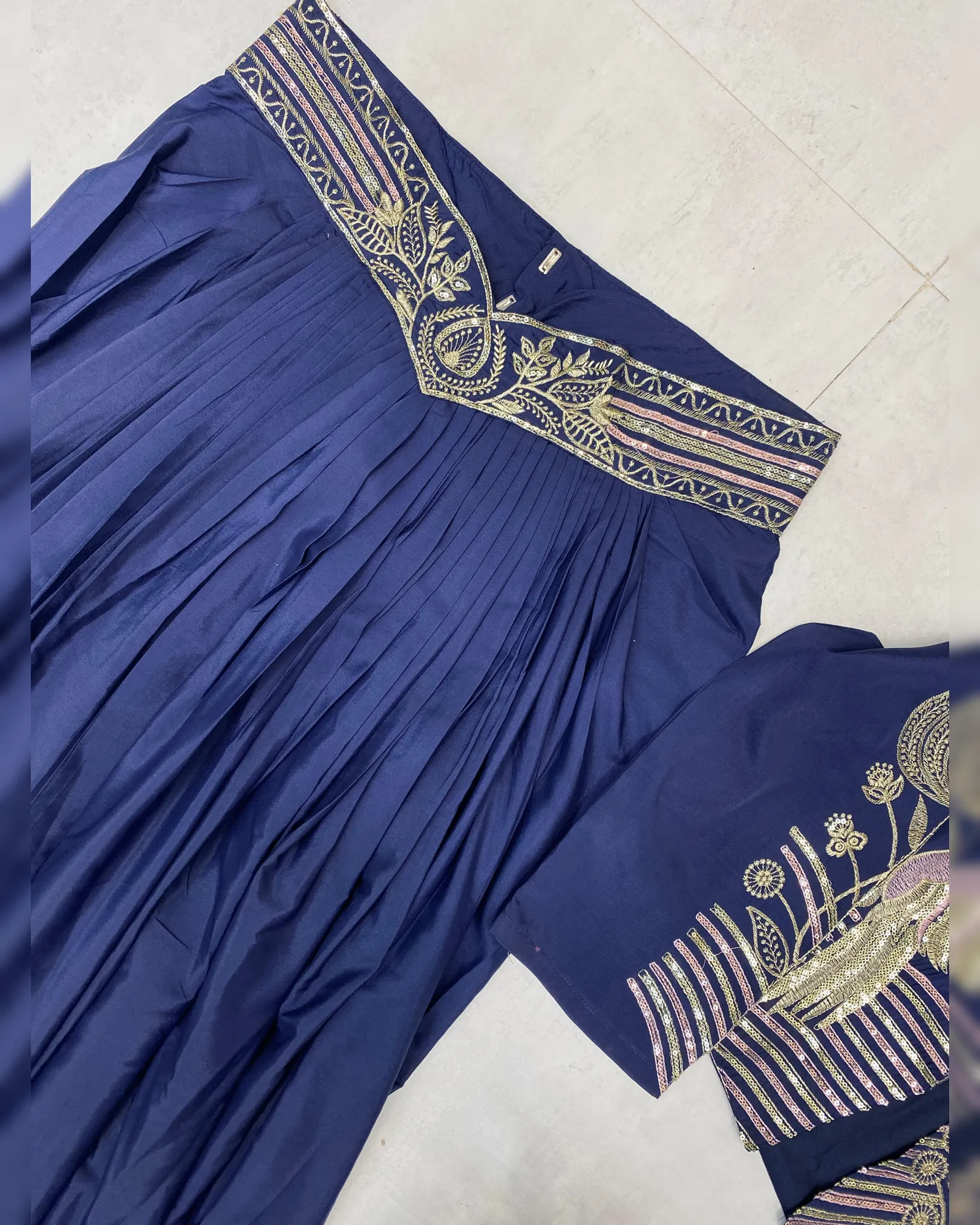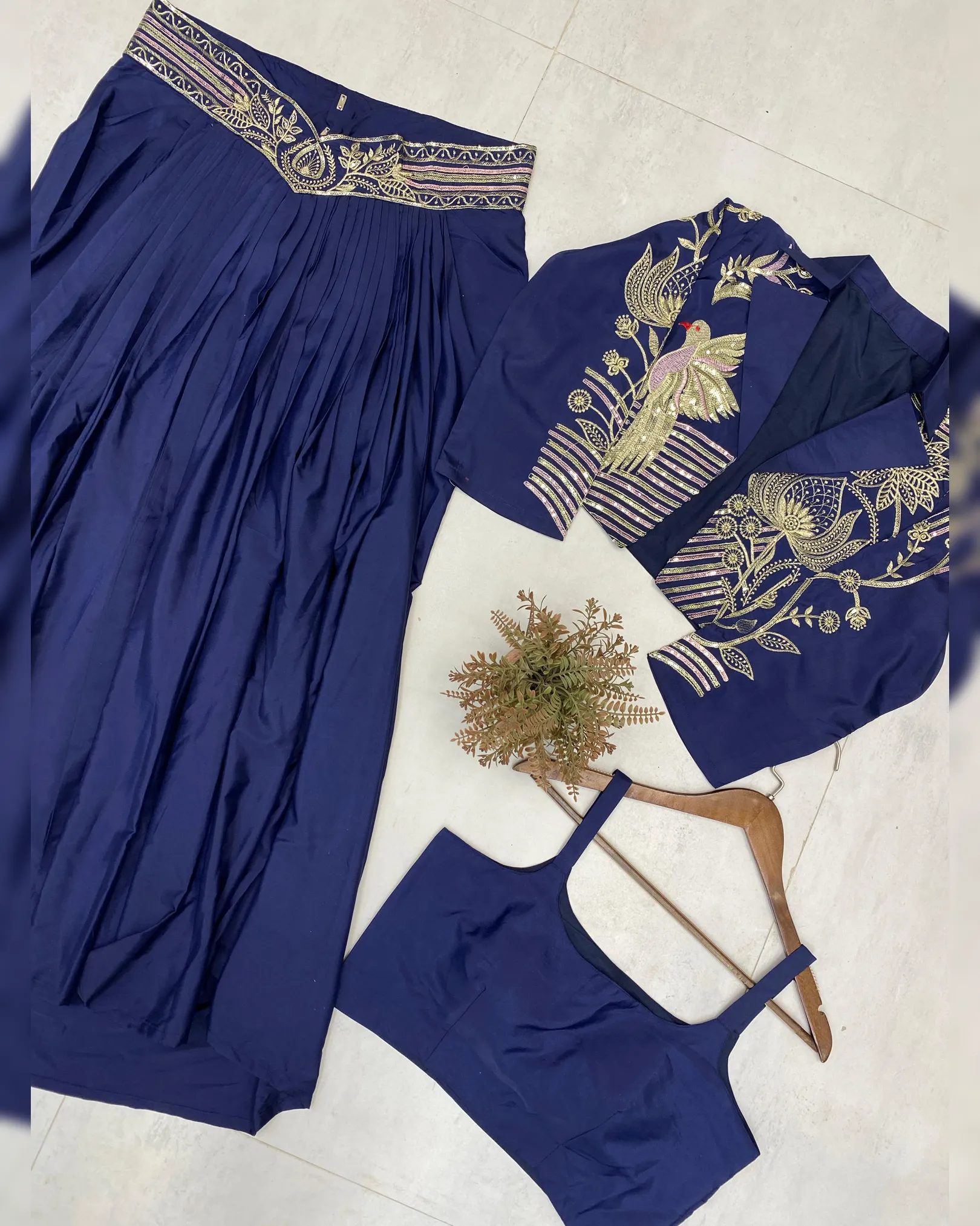 Make a bold fashion statement with this designer Indo-Western three-piece set, crafted for modern festive and party wear styling. Designed in elegant French crepe, this ensemble features a beautifully embroidered koti, a stylish blouse, and a graceful draped skirt. The delicate sequence embroidery adds just the right amount of shimmer, making it perfect for cocktail parties, festive occasions, and wedding functions. Fully stitched and ready to wear, this set offers comfort, versatility, and contemporary elegance.