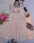 Step into the spotlight with this newly launched designer party wear gown set, crafted to give you a stunning and glamorous look. Made from heavy fox georgette fabric, this outfit offers a graceful drape with a lightweight and flowy feel.