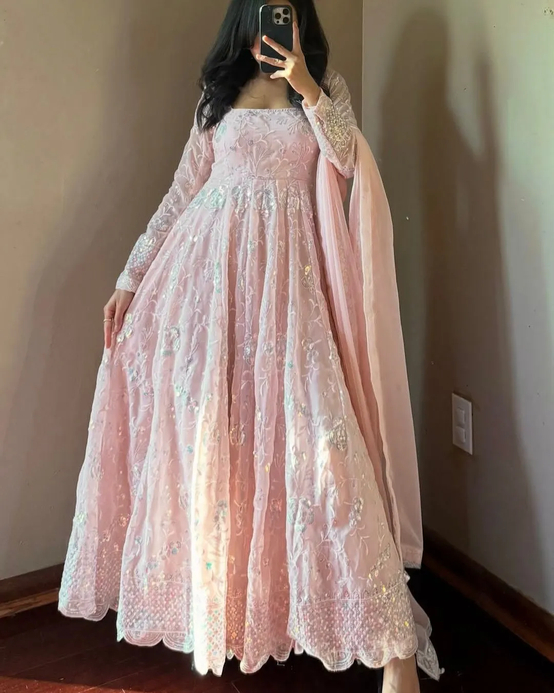 Elegant party wear gown set in heavy fox georgette with embroidery thread and rainbow sequins work, paired with dupatta and pant.
