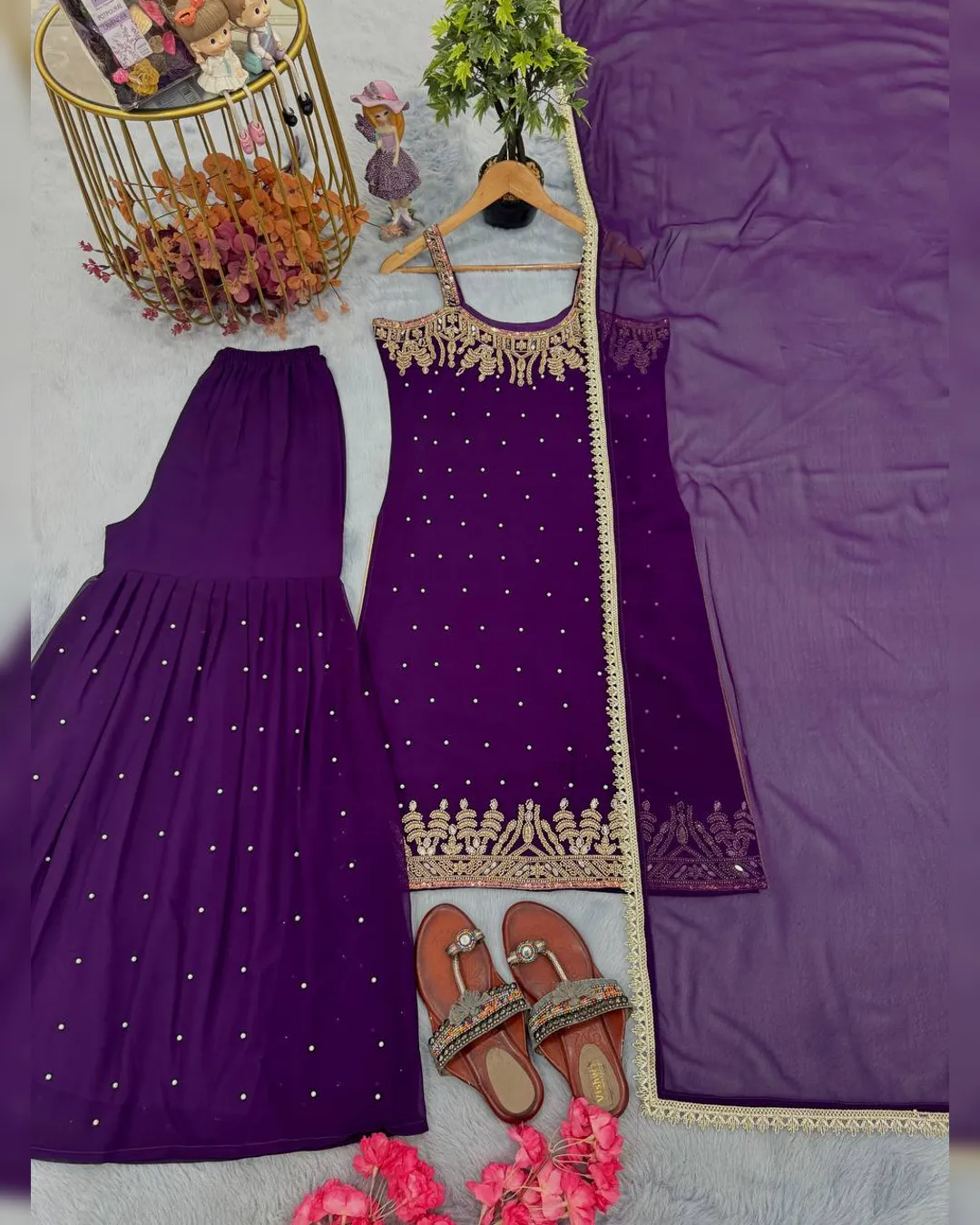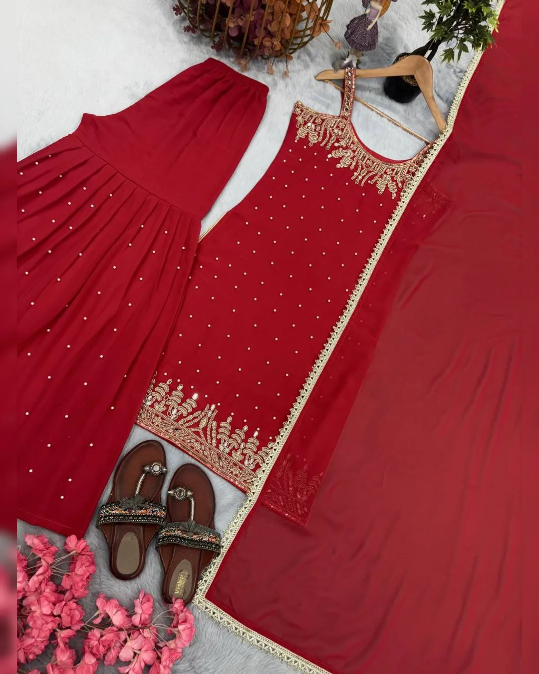 Premium 3-piece party wear set with faux georgette top, crepe plazzo & bordered dupatta featuring handwork, mirror work, and embroidery.