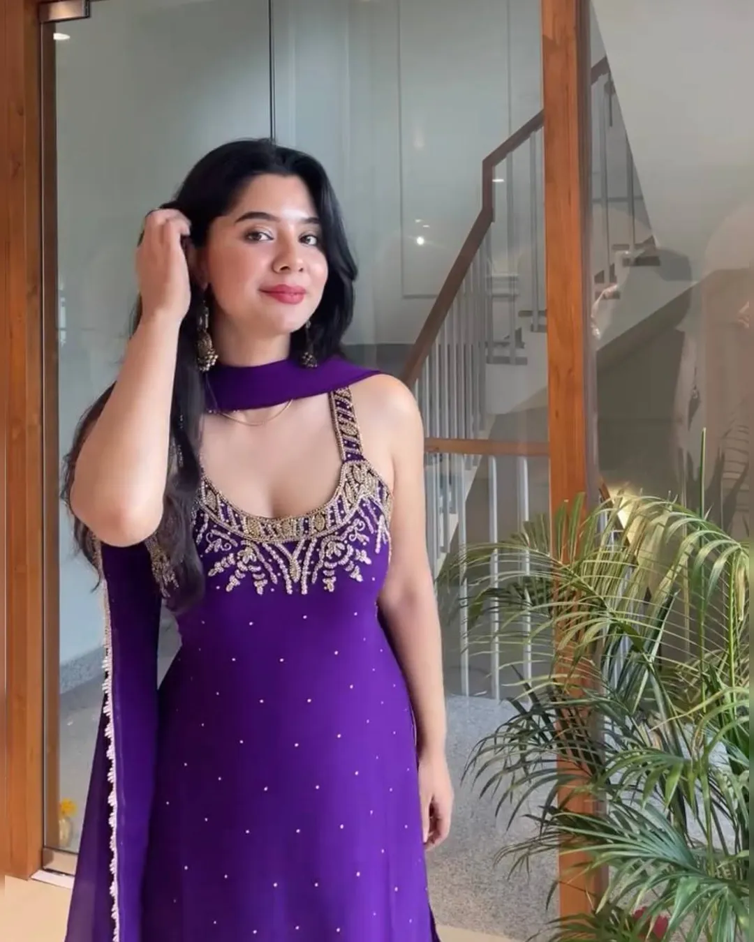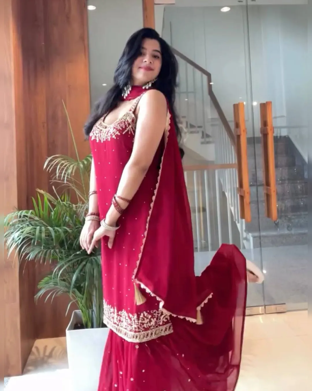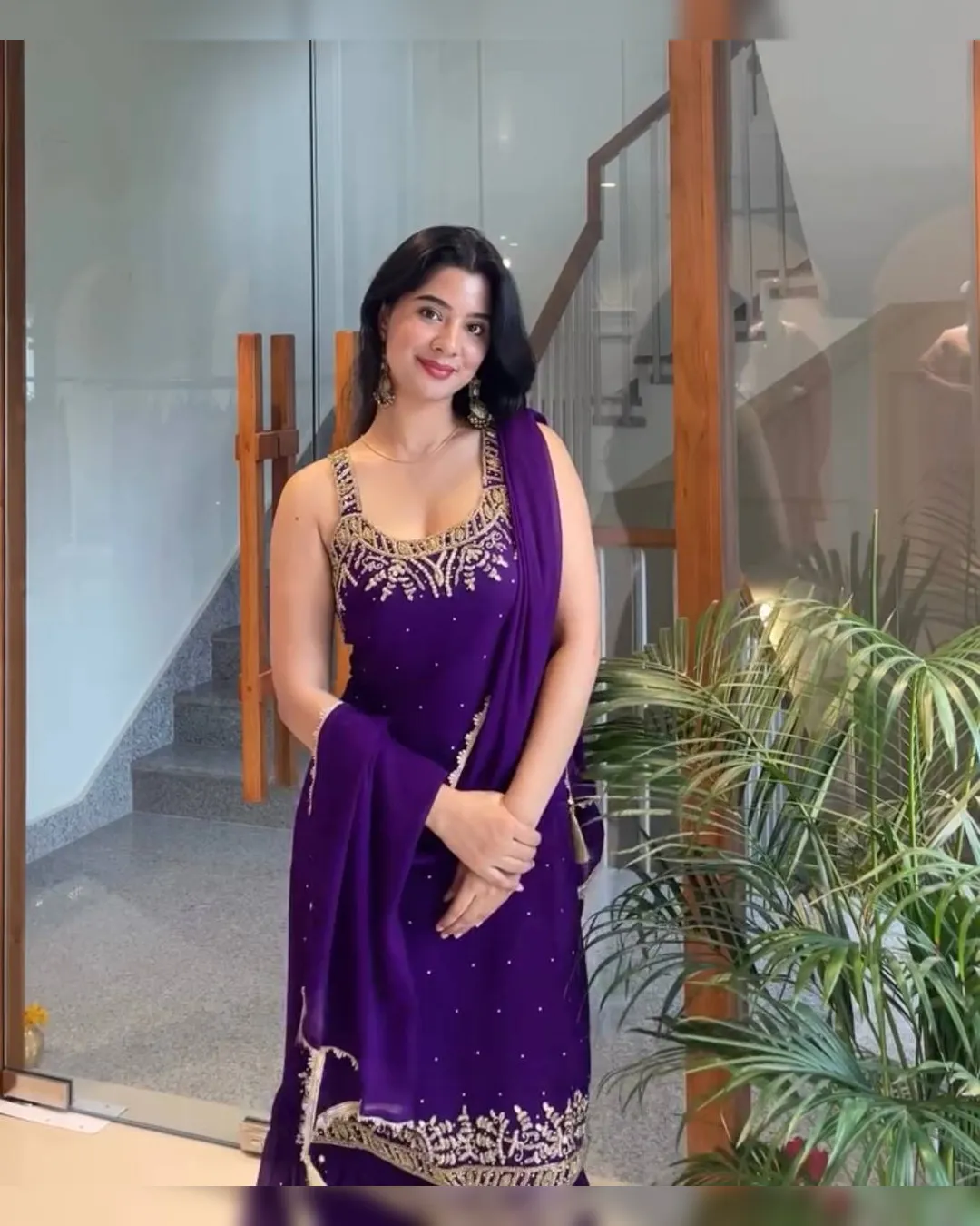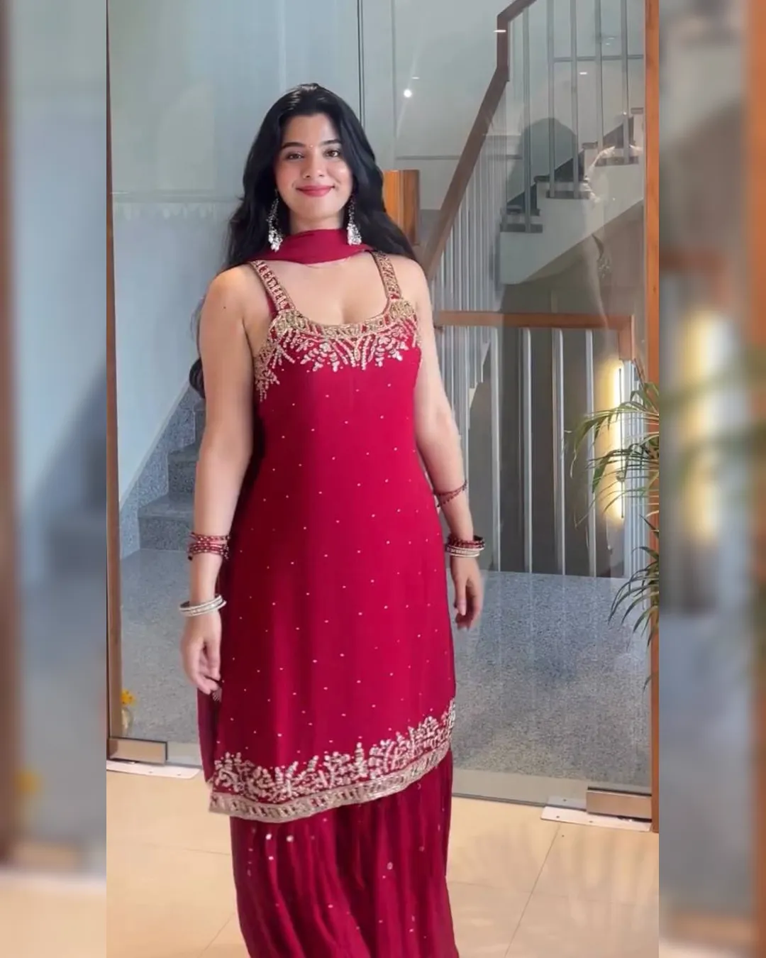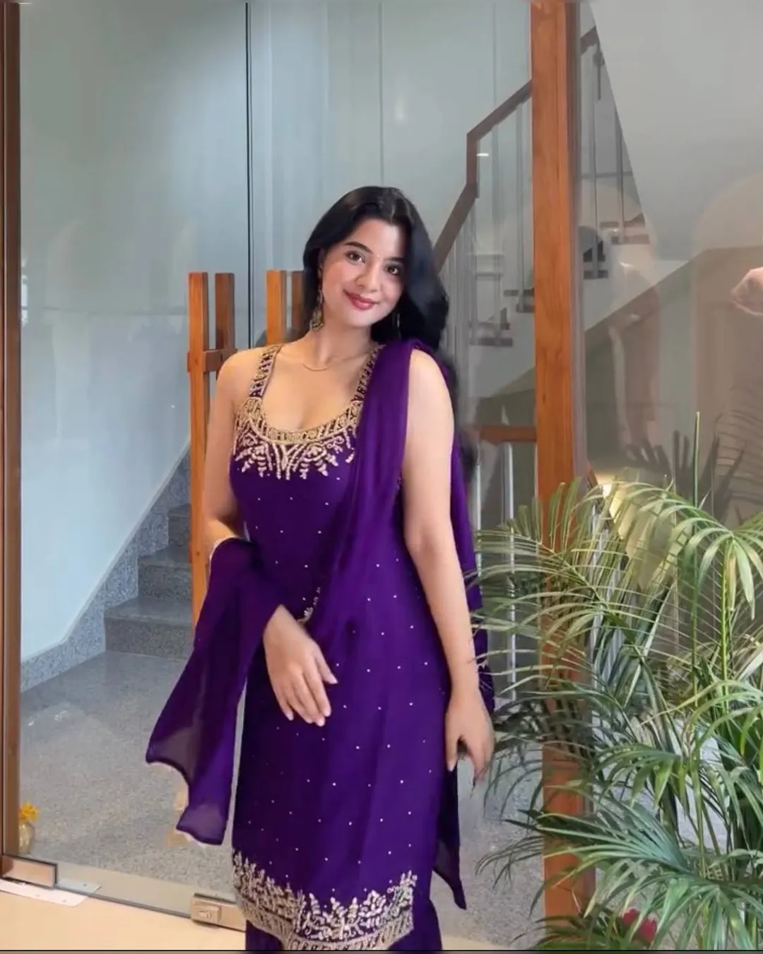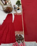 Step into elegance with this Designer Party Wear 3-Piece Set, crafted to perfection in heavy faux georgette and pure natural crepe. This fully stitched set features a stunning top adorned with intricate beads handwork, real mirror detailing, embroidery with 5mm sequins, and rivet moti embellishments. Paired with a stylish plazzo and a beautifully bordered dupatta, this outfit is ideal for festive gatherings, parties, and wedding occasions.