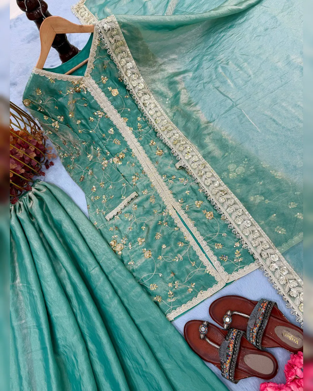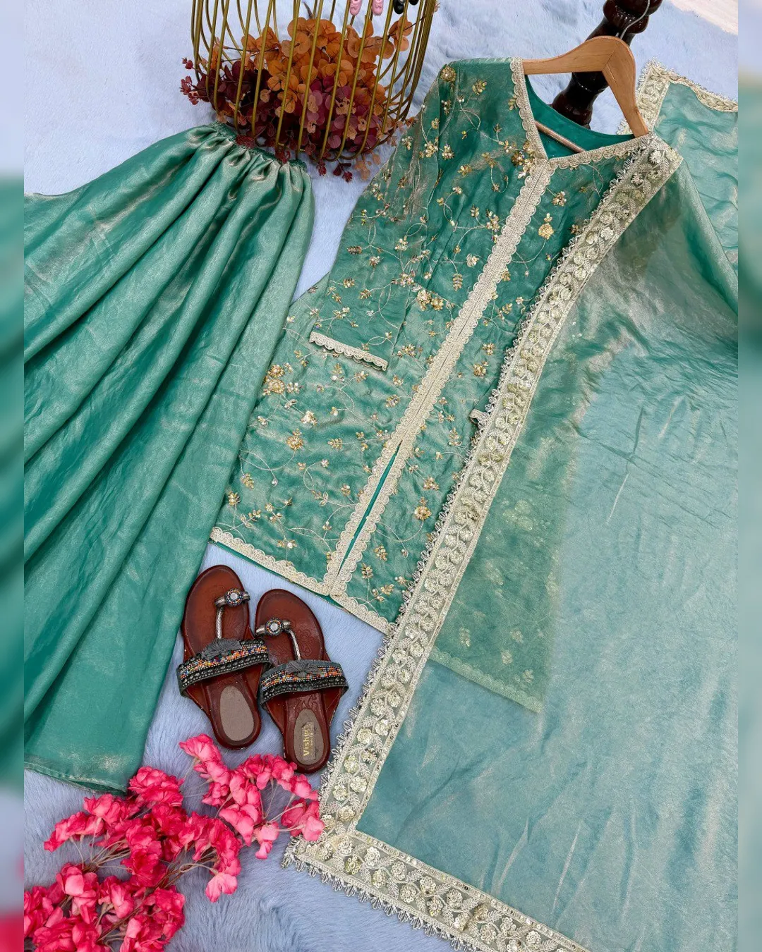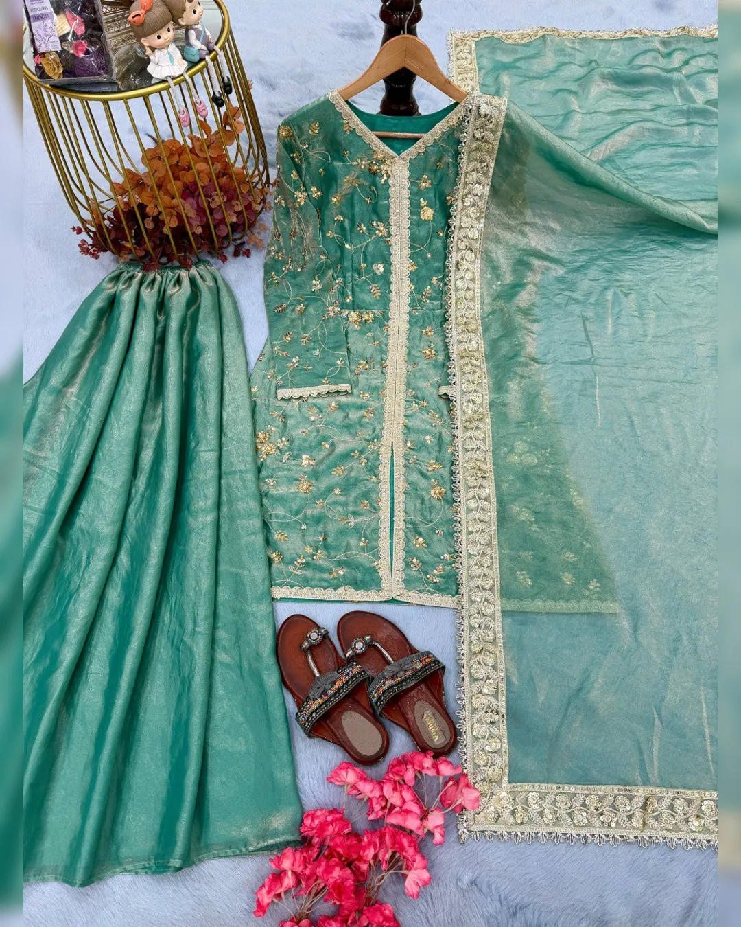 A premium party wear Pure Fendi Silk top–plazzo–dupatta set featuring heavy embroidery, sequence, and coding dori work, fully stitched and ready to wear.
