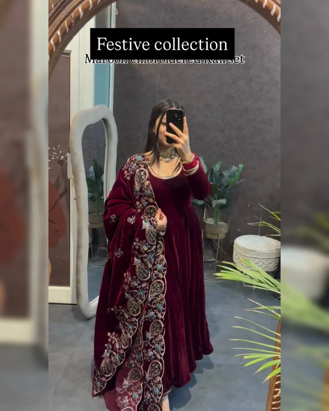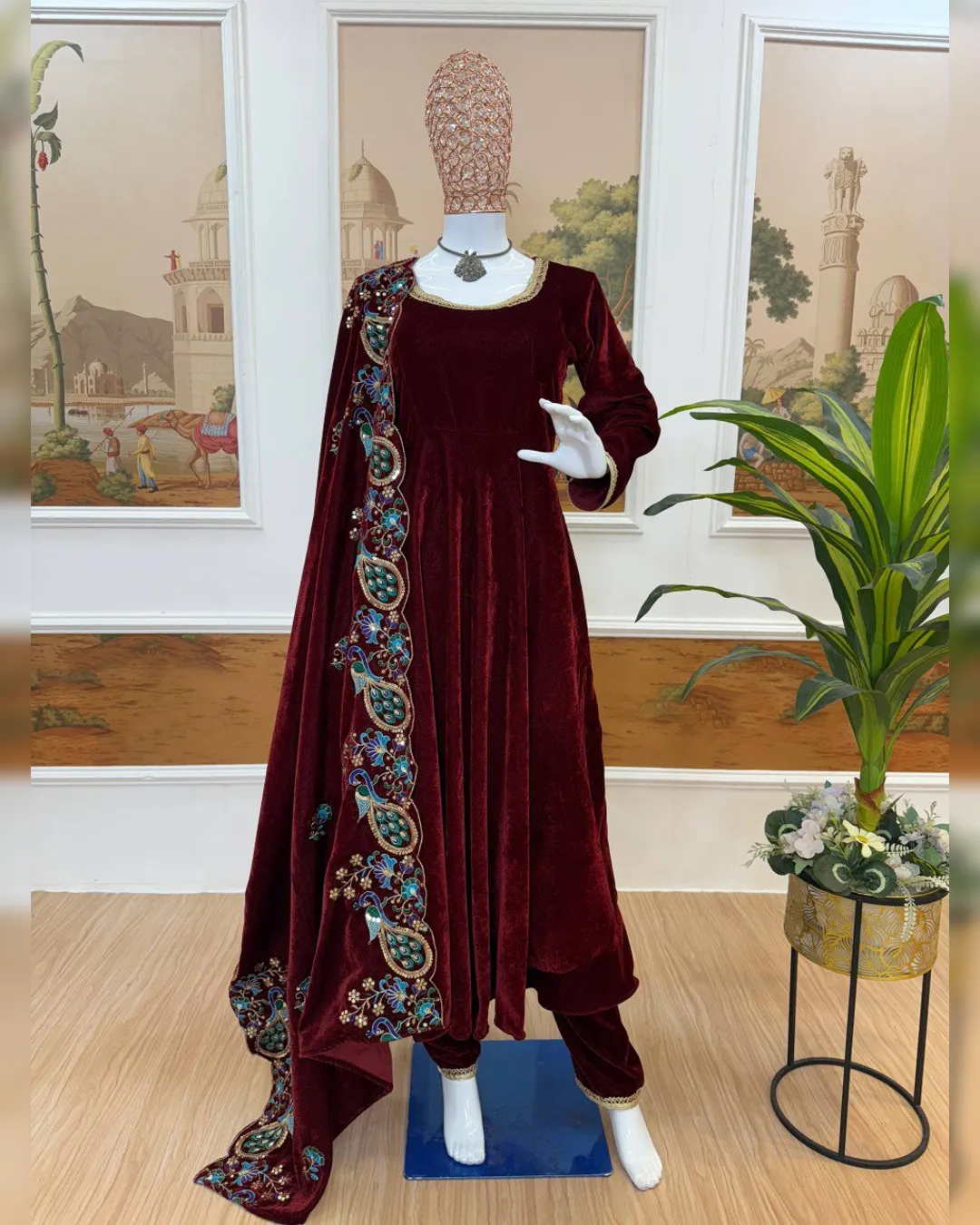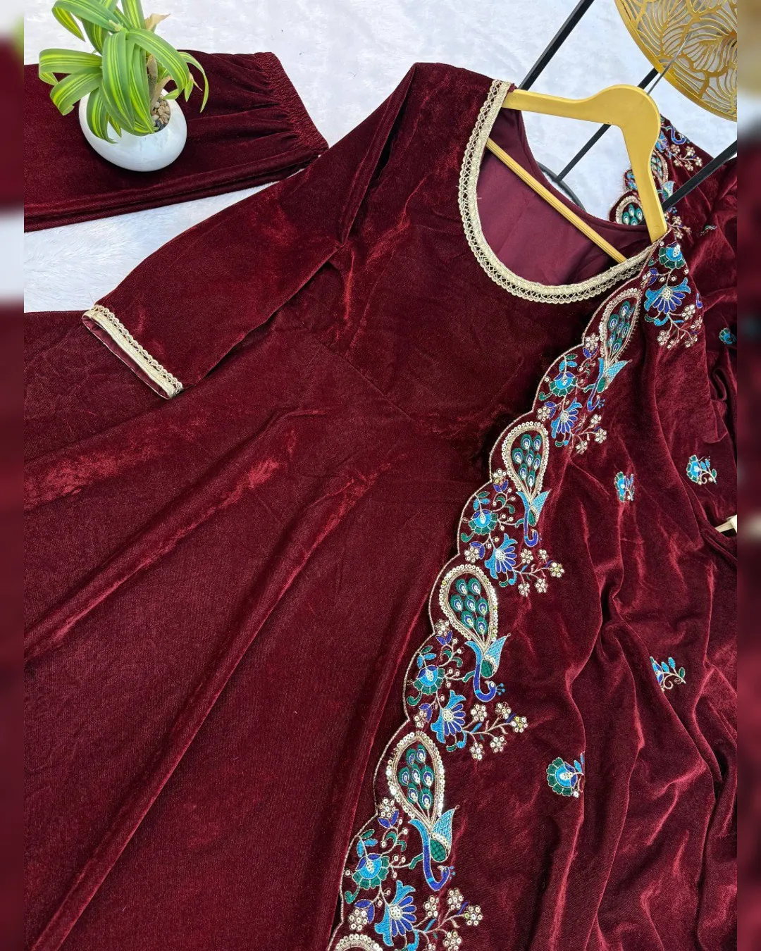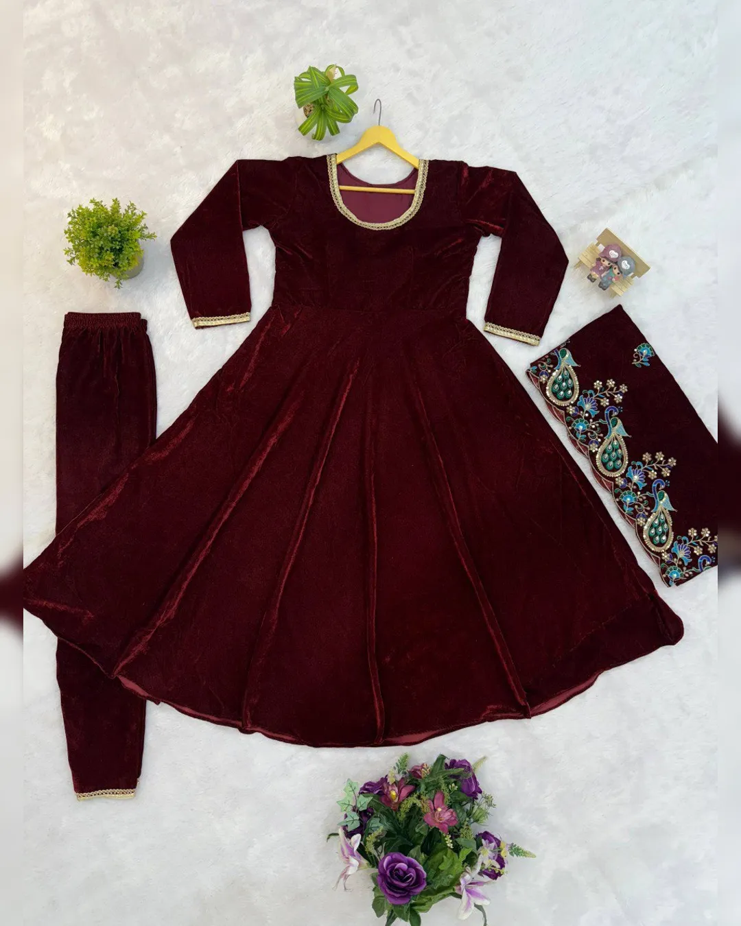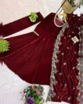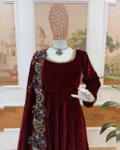 Elevate your festive and party look with this stunning 3-piece velvet gown set, designed to exude elegance and royal charm. Crafted from premium 9000 velvet fabric, the gown features a beautifully detailed fancy lace neckline and a graceful 4-meter flair that adds richness to every twirl. Paired with a comfortable fully stitched velvet pant and a heavily embroidered velvet dupatta, this outfit is perfect for weddings, festive celebrations, and special occasions where you want to stand out with sophistication.