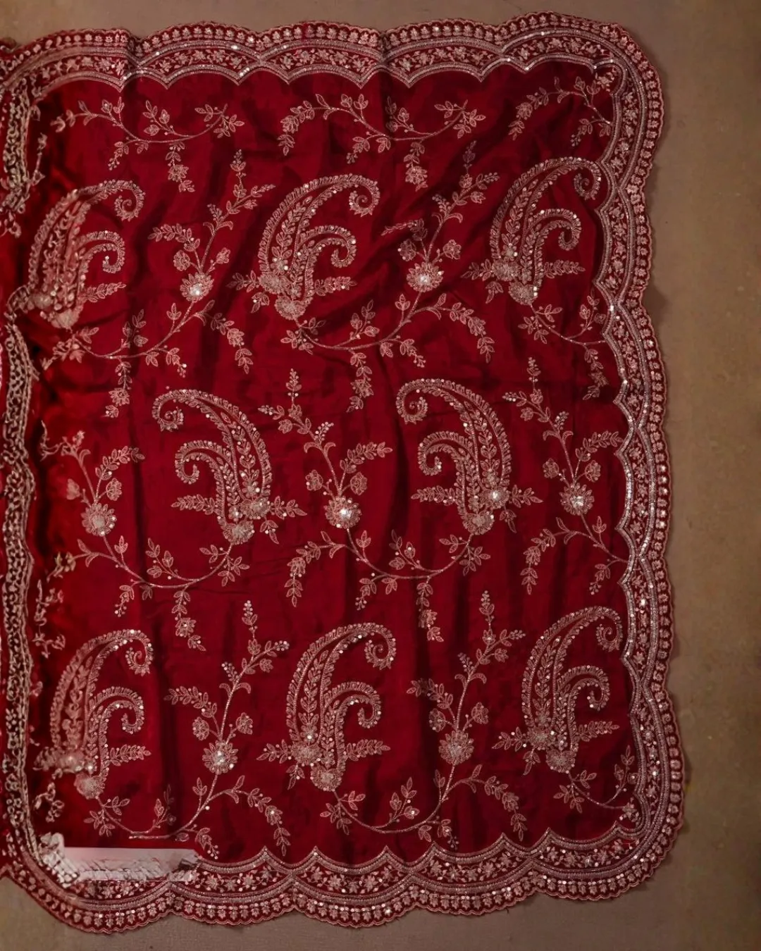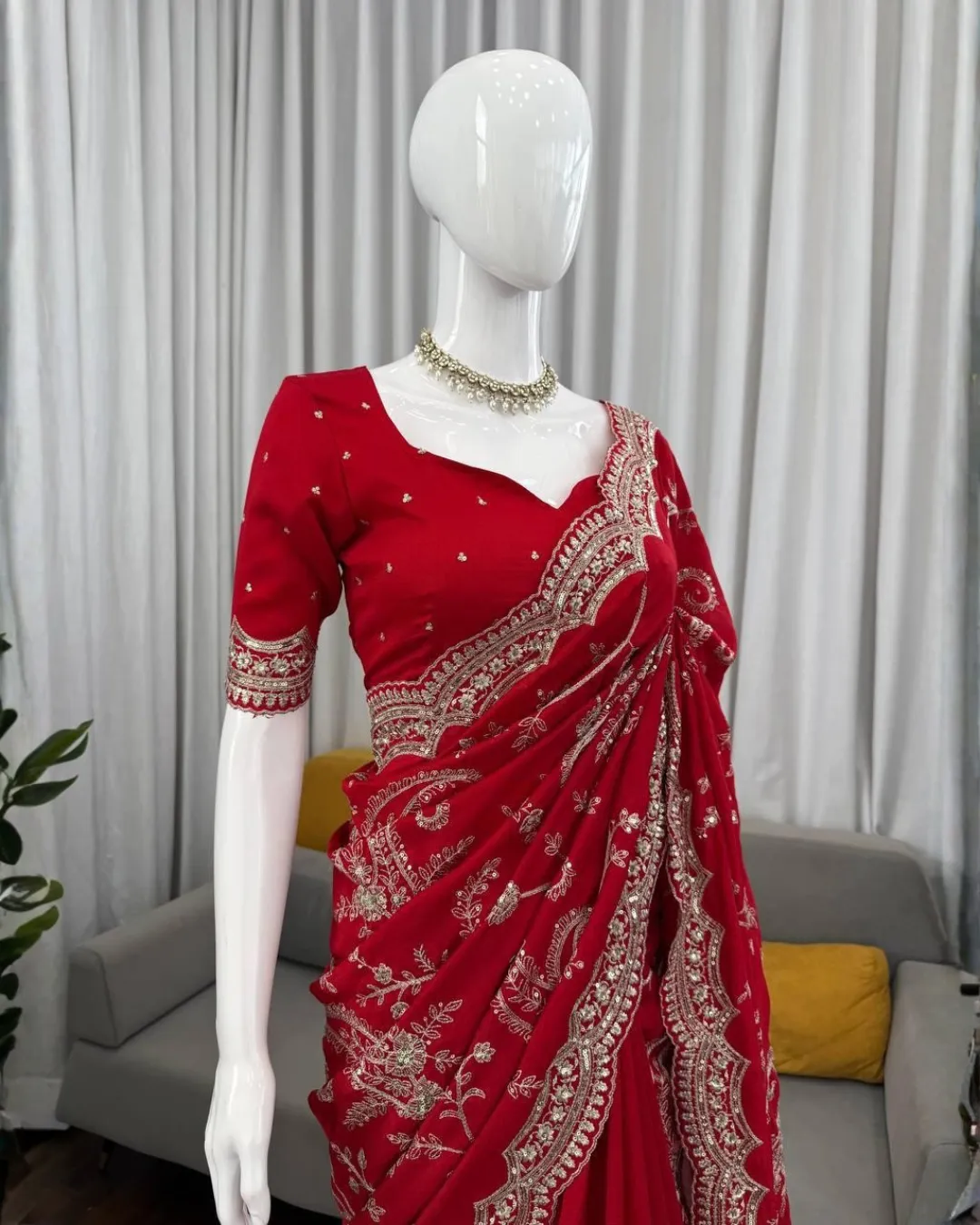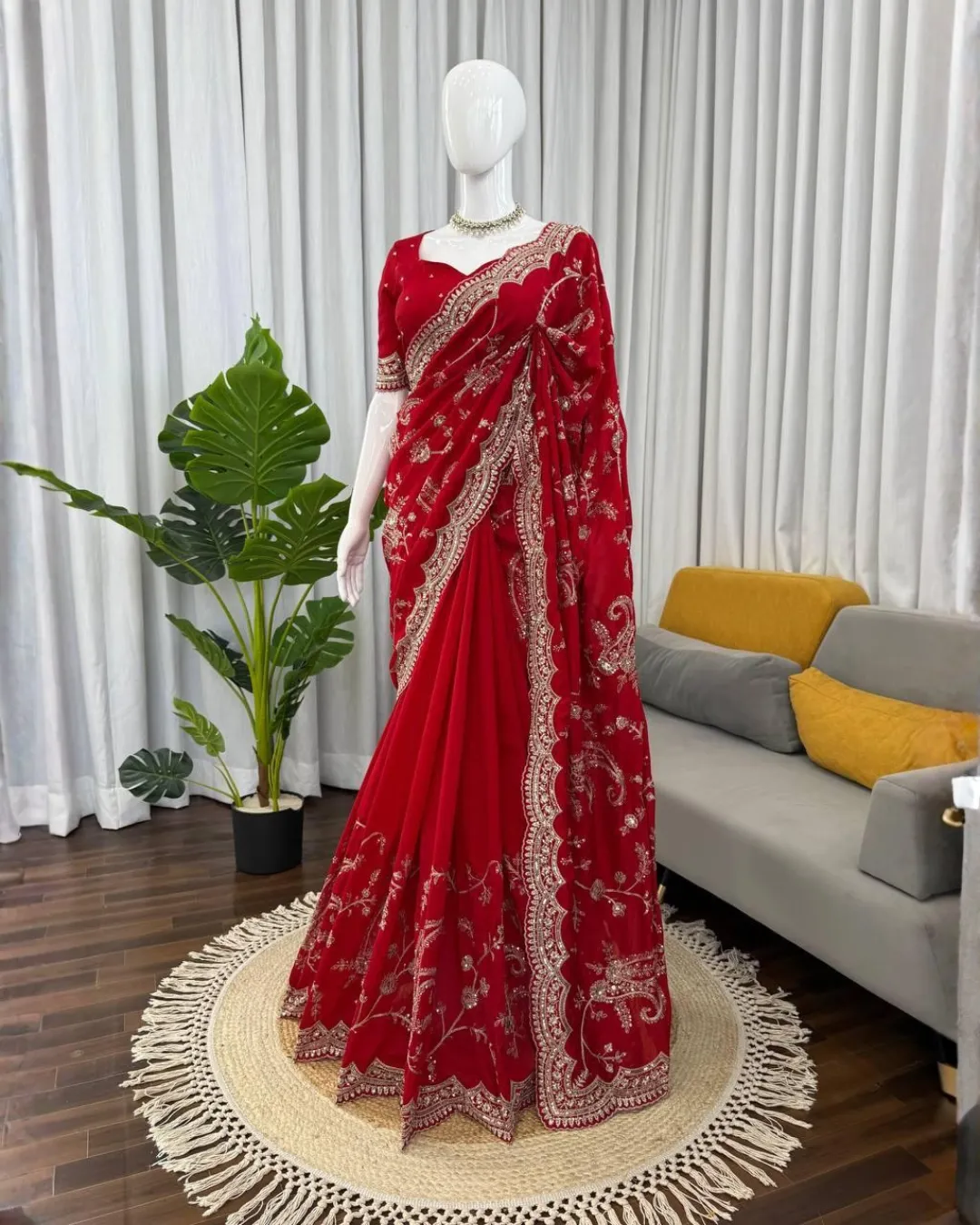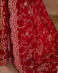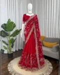 The saree is beautifully adorned with delicate sequence and thread embroidery work, adding a subtle shimmer and refined detail that enhances its luxurious appeal. Its elegant design makes it perfect for parties, festive celebrations, weddings, and evening events.