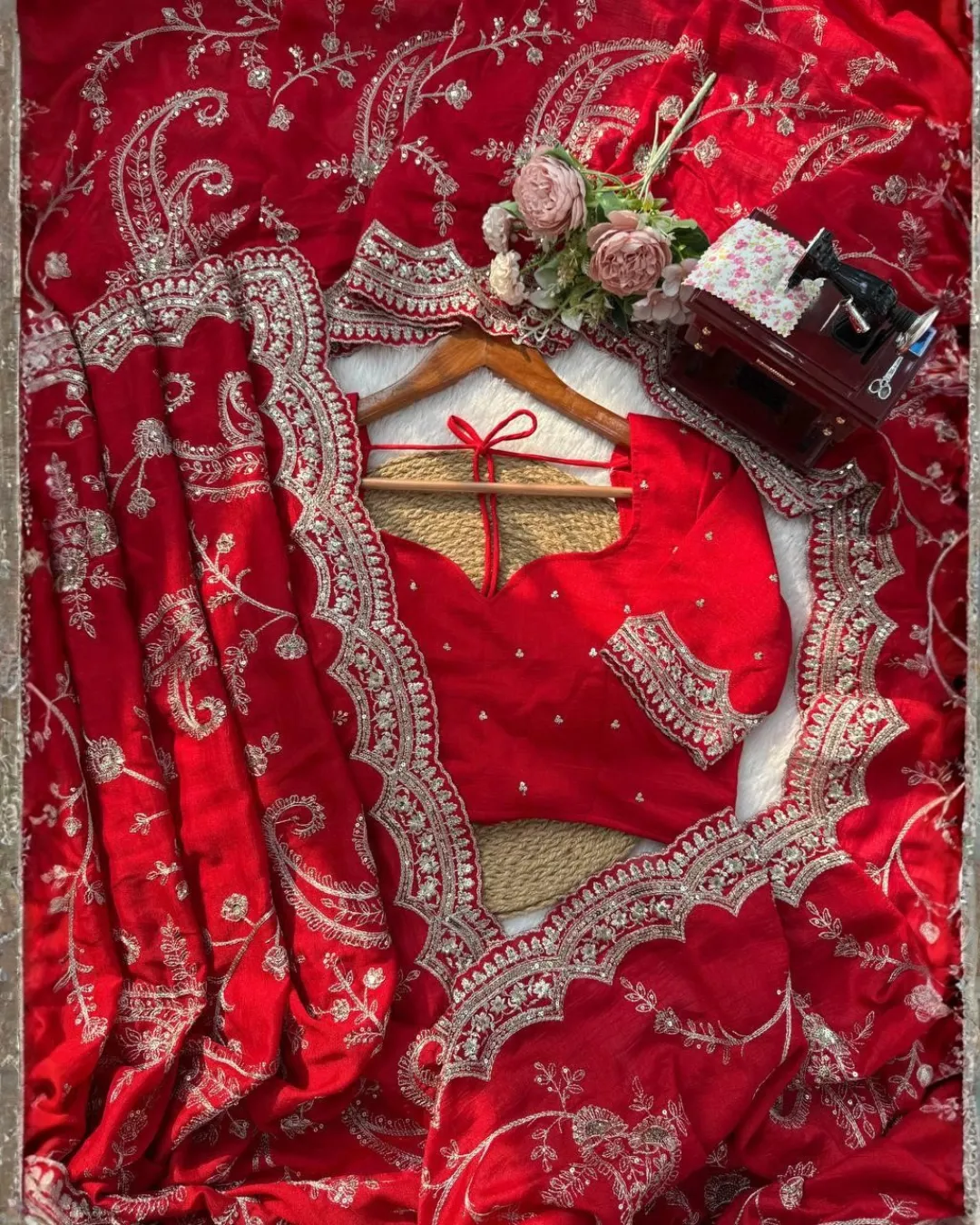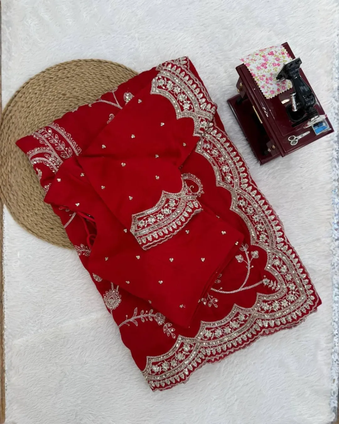 The set comes with a matching Vichitra Silk blouse piece featuring the same sequence and thread work, allowing you to customize the blouse according to your preferred style and fit.