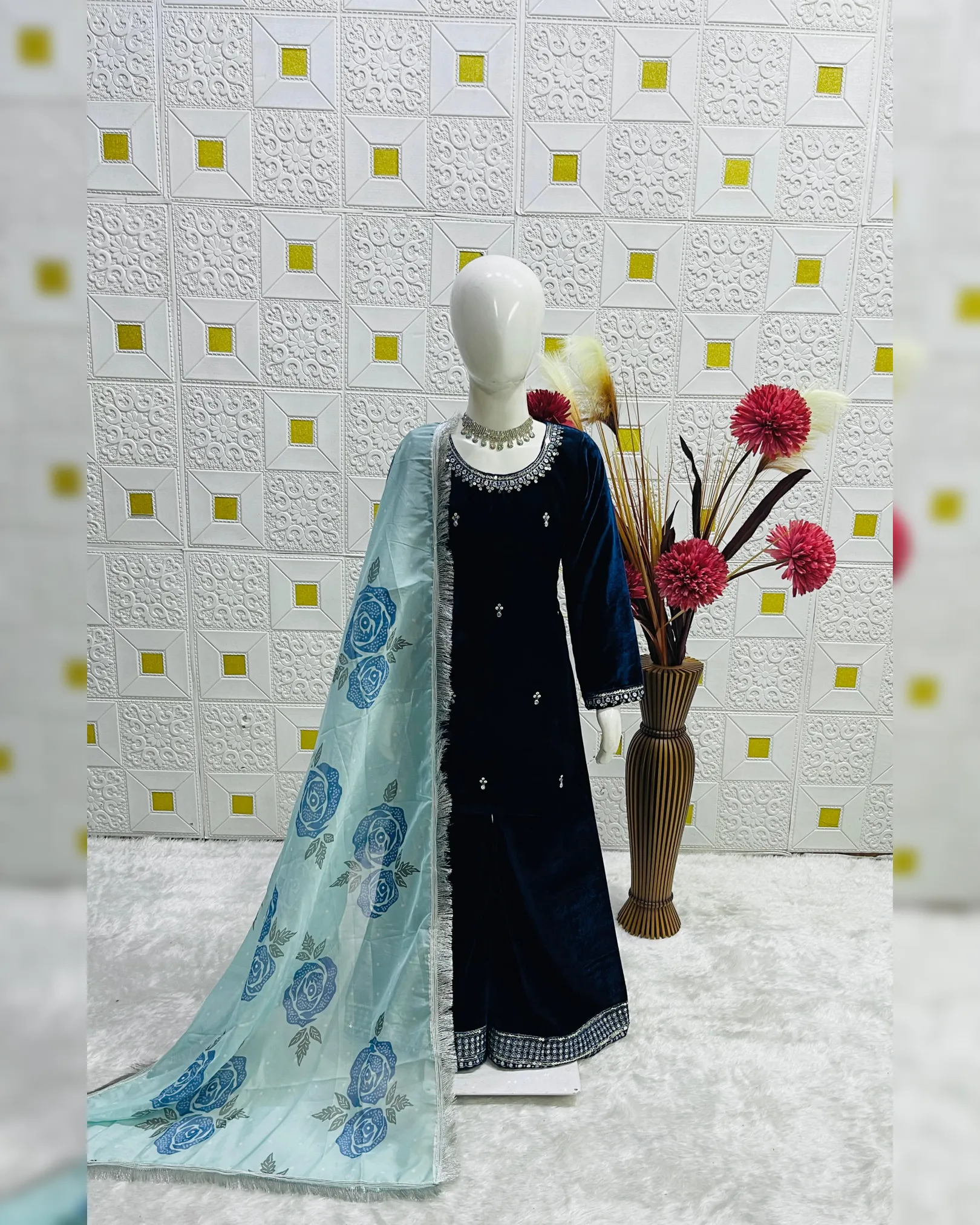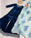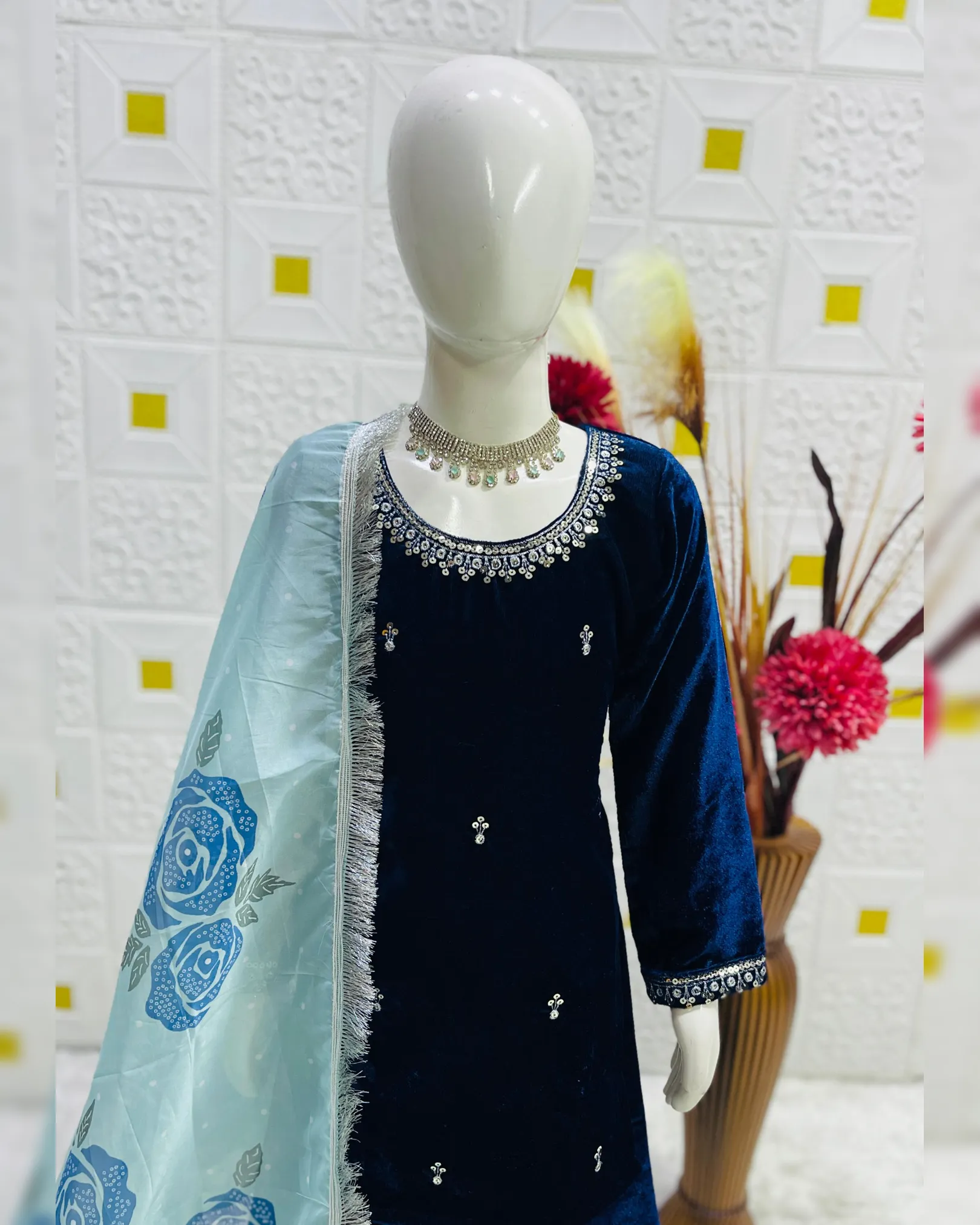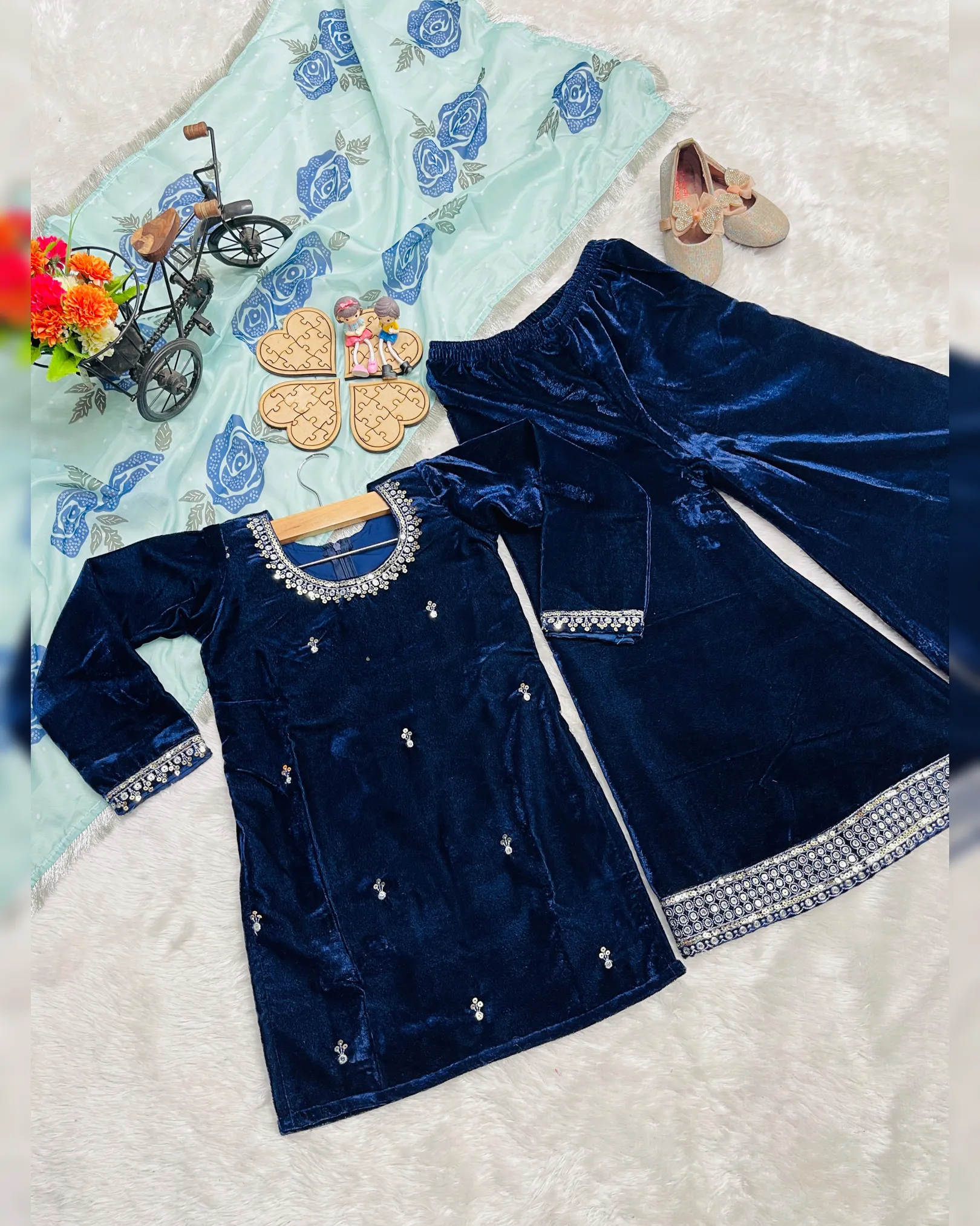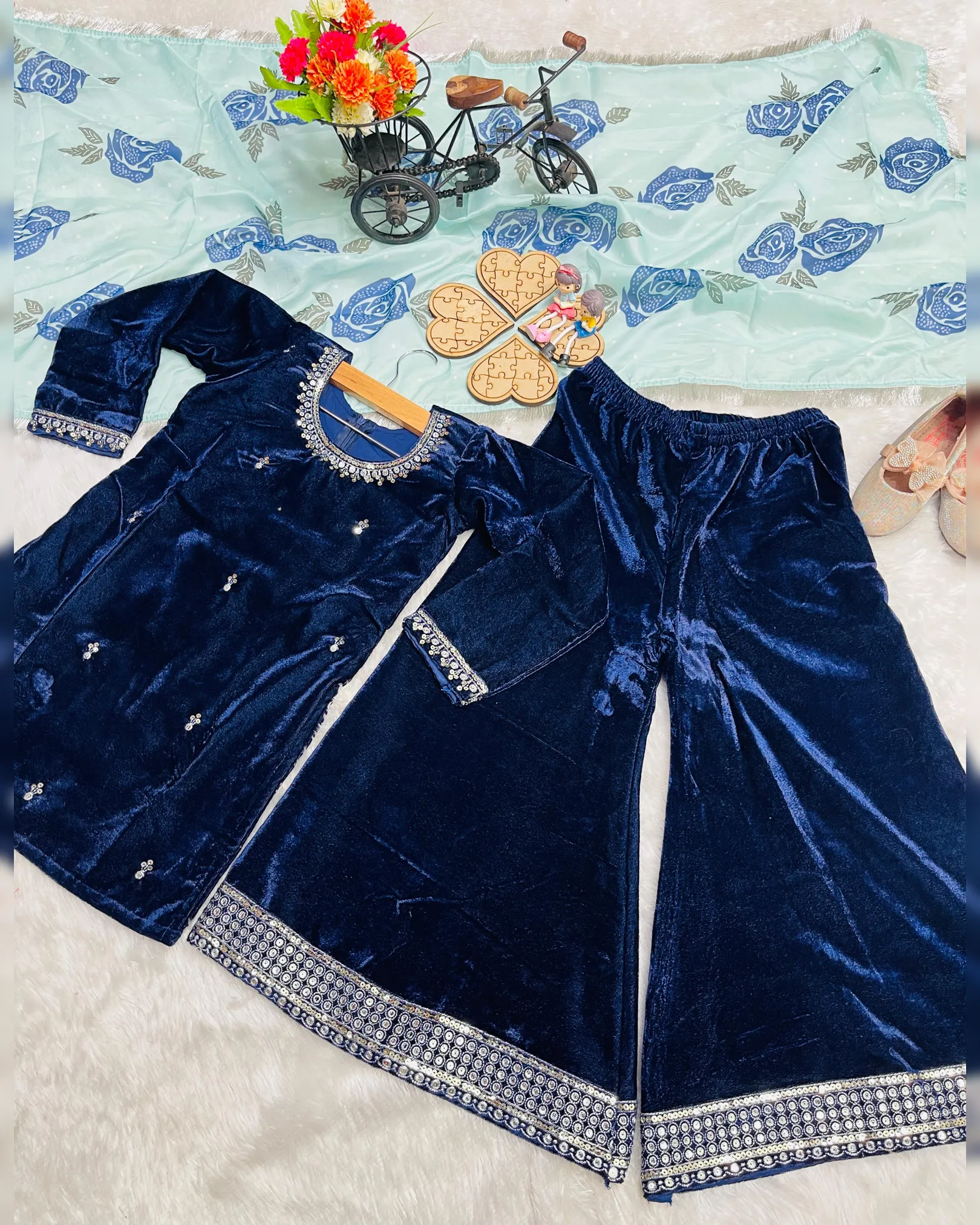 A premium kids designer velvet top-sharara and dupatta set with heavy embroidery sequence work and soft inner—perfect for weddings, festivals, and special occasions.