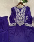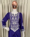 The French crepe top is beautifully highlighted with elegant embroidery work and comes with a soft micro inner lining for comfort. Its long stylish length creates a graceful contemporary silhouette. The matching French crepe dhoti completes the fusion look with a trendy yet comfortable fit.