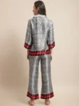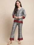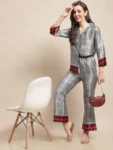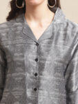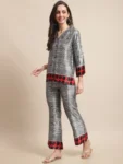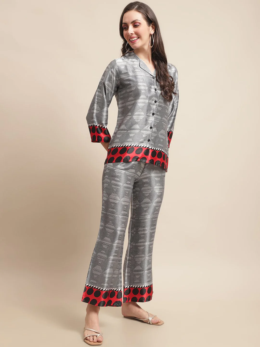 Infuse your casual wardrobe with contemporary flair with our Digital Fusion Ensemble, a dynamic co-ord set crafted for effortless style and sophistication. Fashioned from smooth satin fabric, this set features a Grey, Red, and Black Digital Printed Shirt paired with matching Mid-Rise Trousers, ideal for casual occasions. The shirt showcases a trendy Cuban Collar, Three-Quarter Sleeves, and a full placket button closure, exuding modern charm and versatility. Complementing the shirt, the trousers offer a chic silhouette with a flared hem, adding a touch of flair to your ensemble. Adorned with striking digital prints in shades of grey, red, and black, this ensemble exudes contemporary elegance and urban allure. Whether you're exploring the city or meeting friends for coffee, the Digital Fusion Ensemble promises to elevate your look with effortless sophistication.