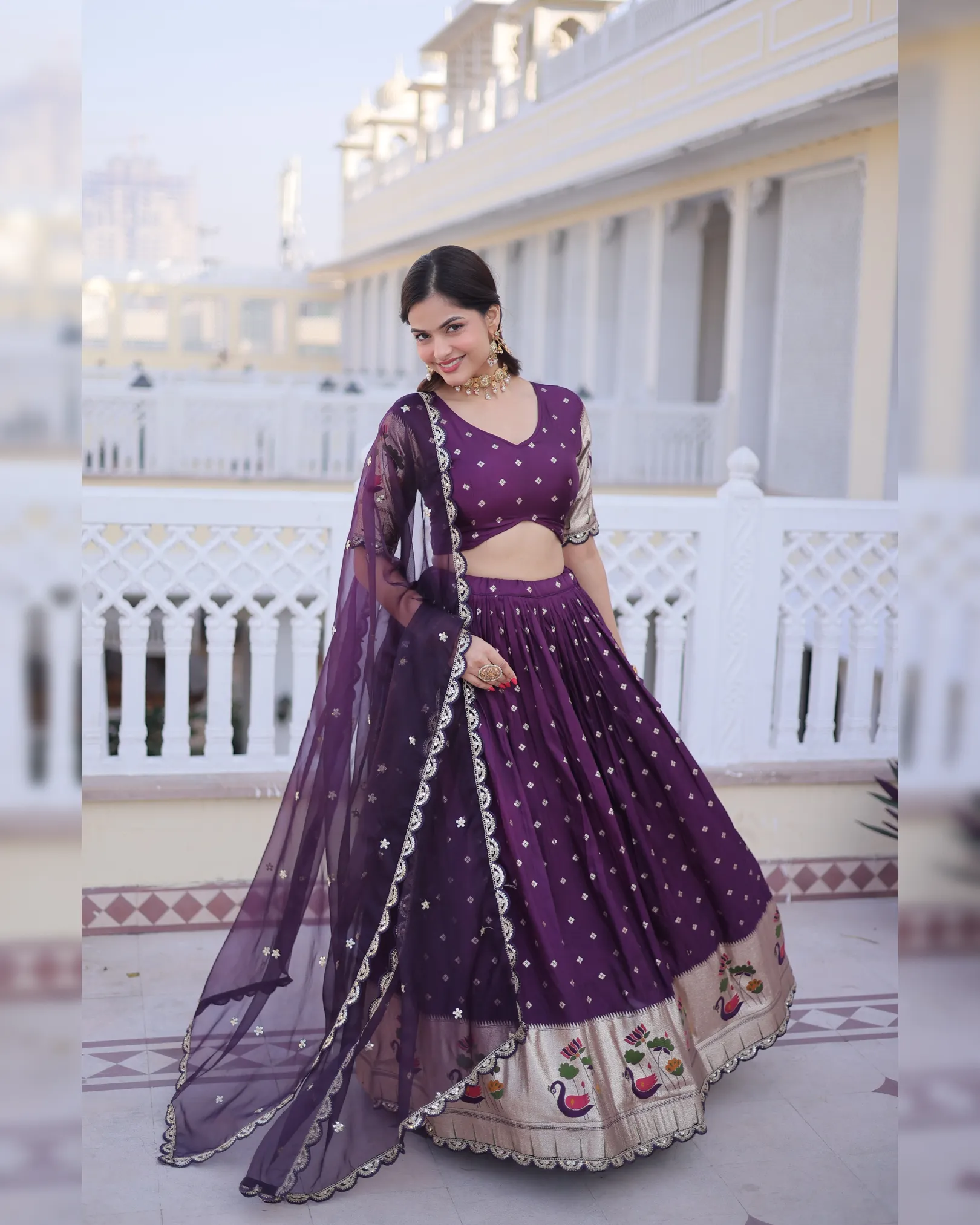 Dola silk lehenga choli set with Meena weaving, sequins lace embroidery, 3-meter flair, and Tebby silk dupatta — perfect for weddings and festive wear.