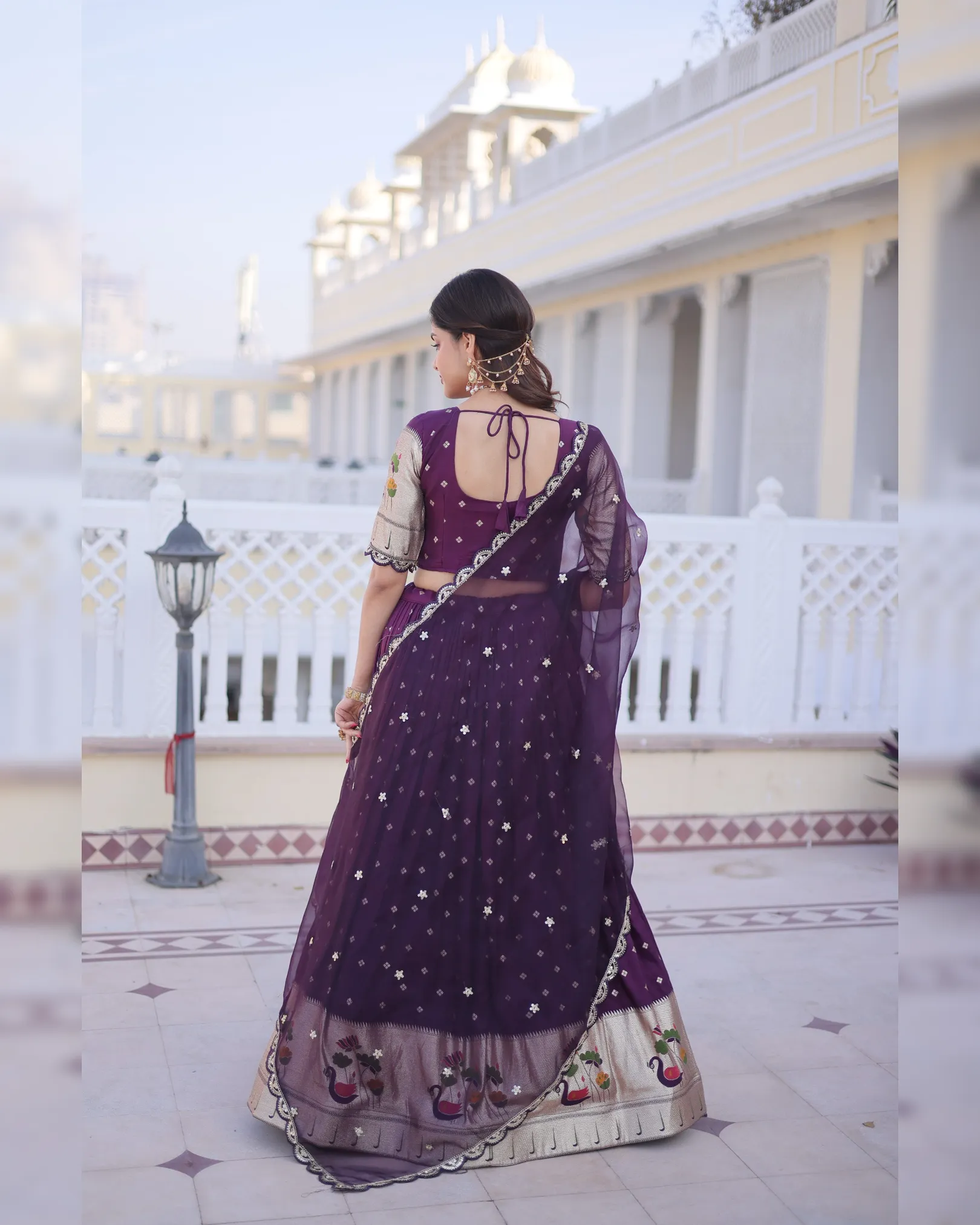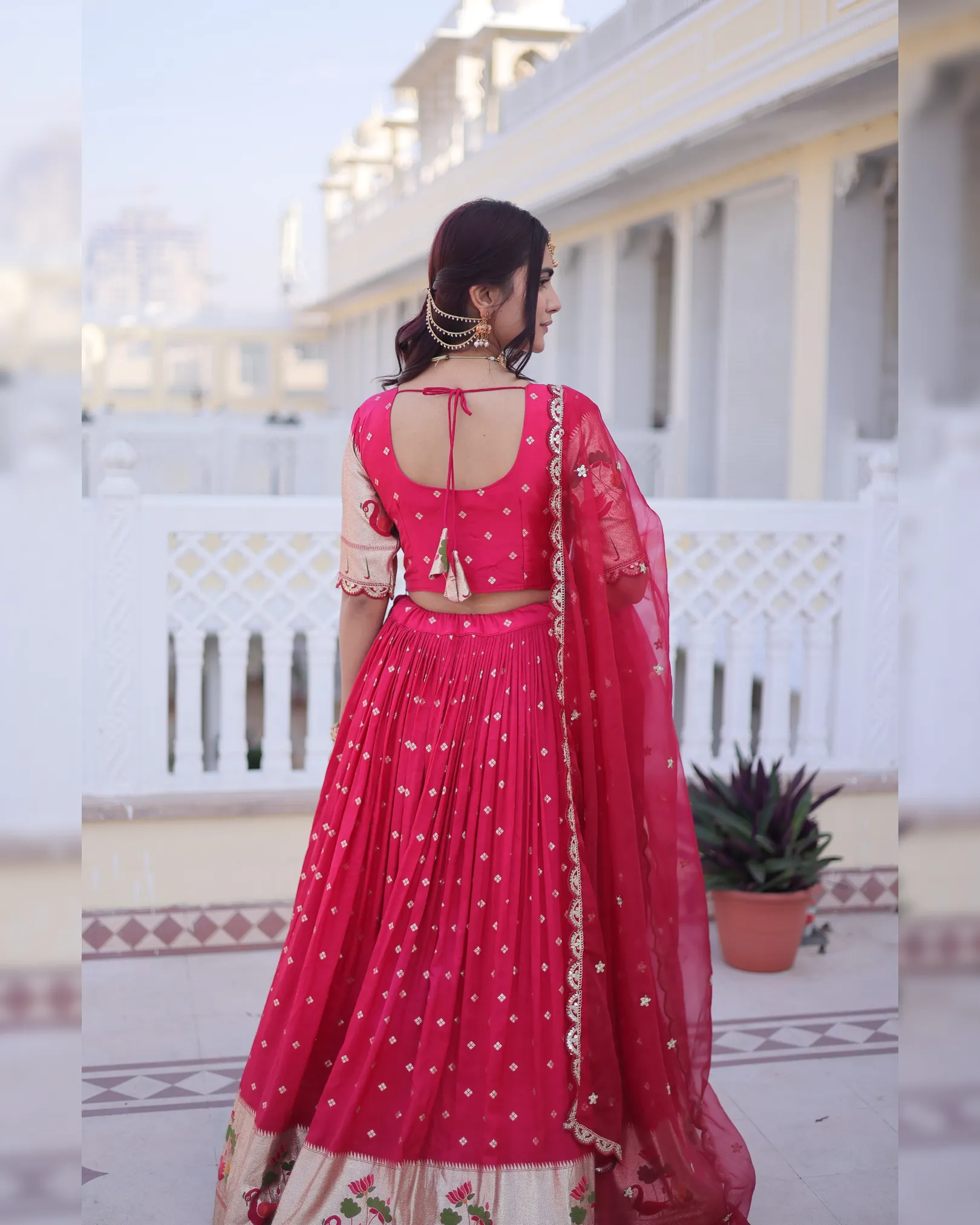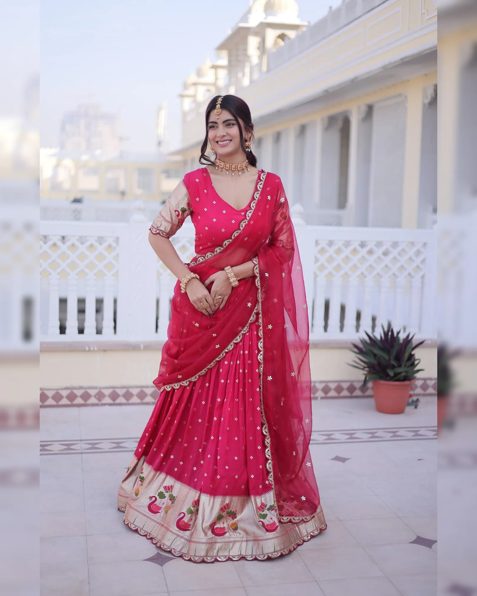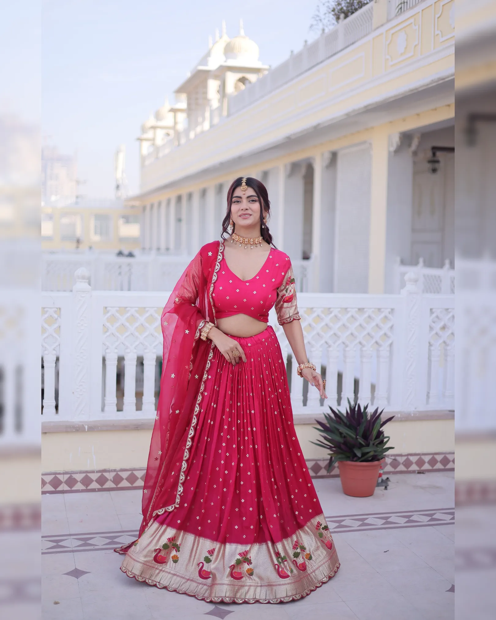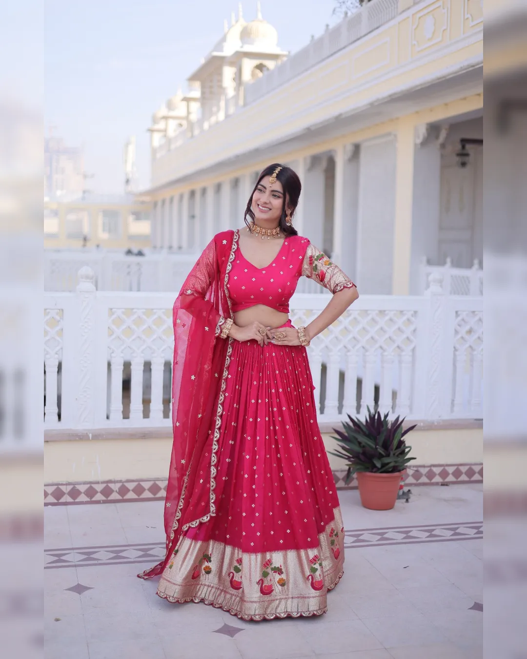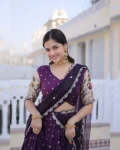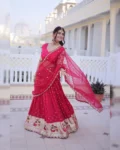Celebrate tradition with elegance in our Dola Silk Lehenga Choli Dupatta Set, designed for festive and wedding occasions. The lehenga features rich Meena weaving enhanced with sequins coding and embroidered lace work, creating a regal and graceful appeal. Crafted with a comfortable cotton lining, sturdy canvas patta, and a flattering 3-meter flair, this fully stitched lehenga ensures both beauty and comfort.