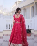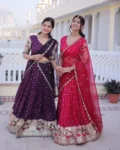 The unstitched blouse allows custom fitting, while the Tebby silk dupatta with sequins embroidered work completes the look with a luxurious touch. Available in Pink and Wine, this ensemble is a perfect blend of heritage craftsmanship and modern sophistication.