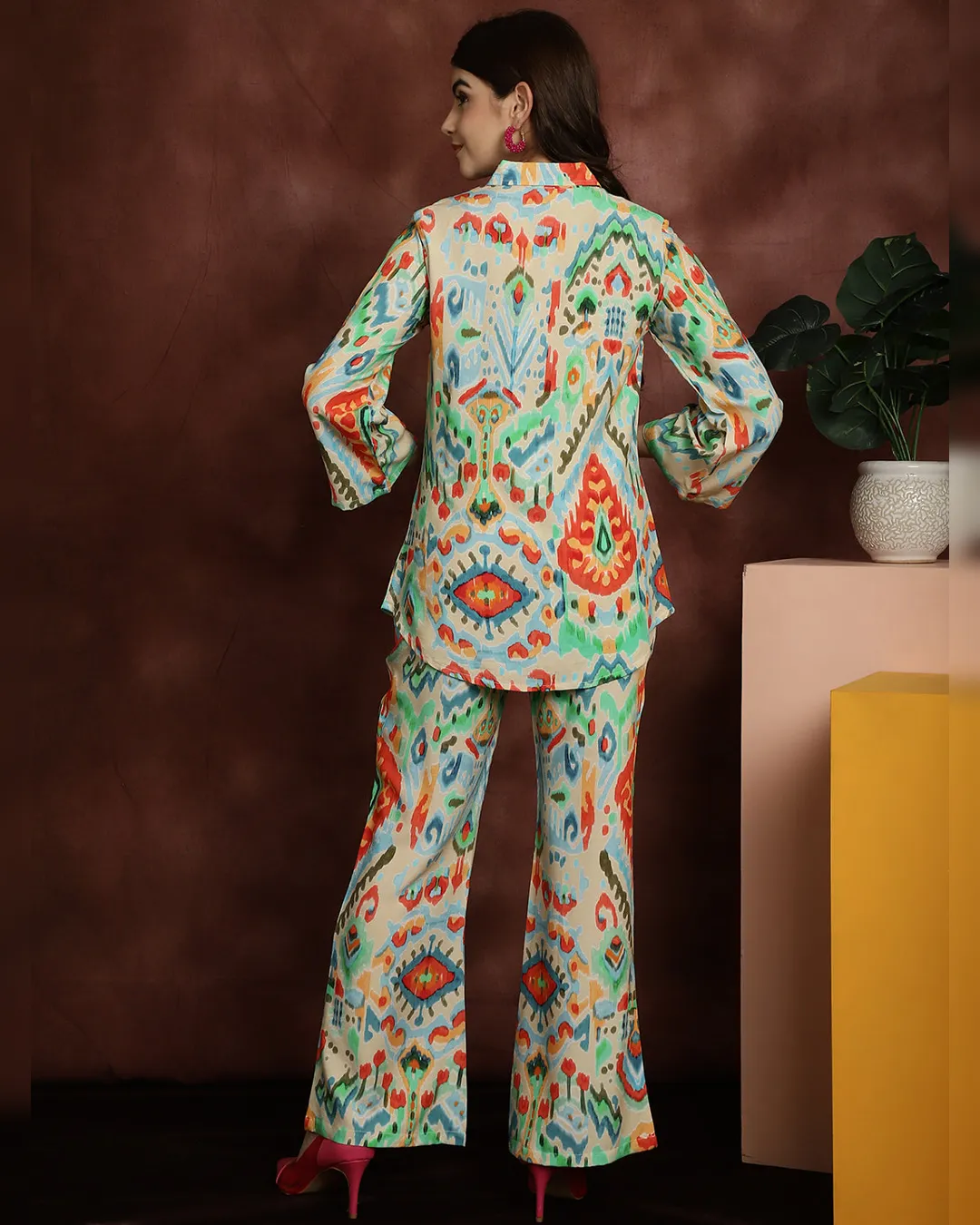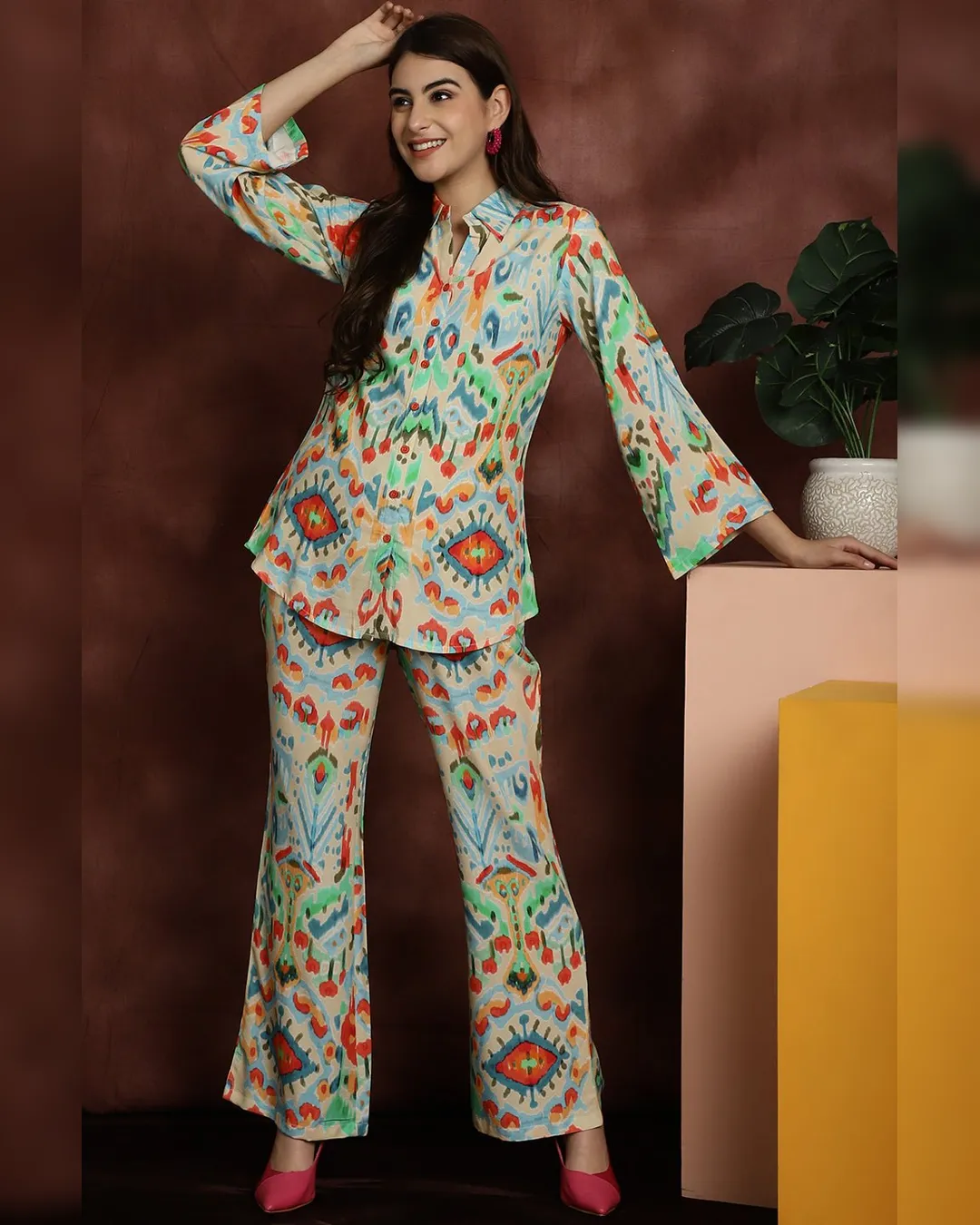 Relax in style with this beige abstract printed viscose rayon co-ord set featuring a soft shirt-style top and comfy bottoms—perfect for lounging or bedtime comfort.