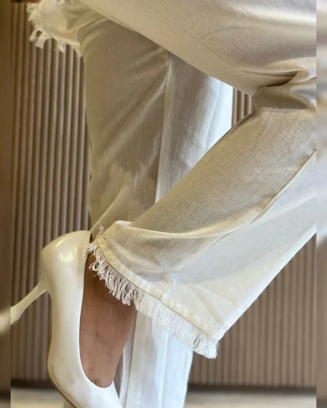 The intricate lace detailing adds a touch of femininity and sophistication, while the soft cotton fabric ensures breathability and ease of movement. Whether you're headed to a meeting or catching up with friends, this set will keep you looking chic and polished.
