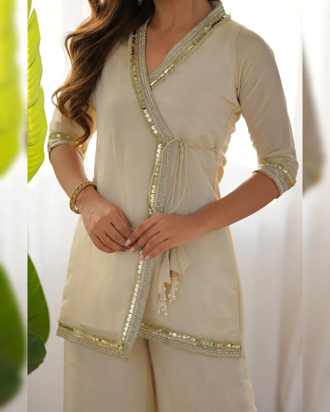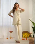 Ivory wrap-around kurta set in premium Sunshine Moss fabric with delicate lace detailing and wide pants for a graceful, modern festive look.