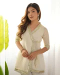 Soft, subtle, and effortlessly elegant — this wrap-around kurta set is designed for a refined and graceful look. Crafted in premium Sunshine Moss fabric, the outfit features a soothing ivory tone enhanced with delicate lace detailing, creating a perfect balance of minimal charm and sophistication. The structured yet flowy silhouette delivers a polished appearance, while the wide pants add a modern formal touch. Ideal for festive gatherings, elegant day events, and special occasions, this timeless ensemble speaks elegance in every detail.