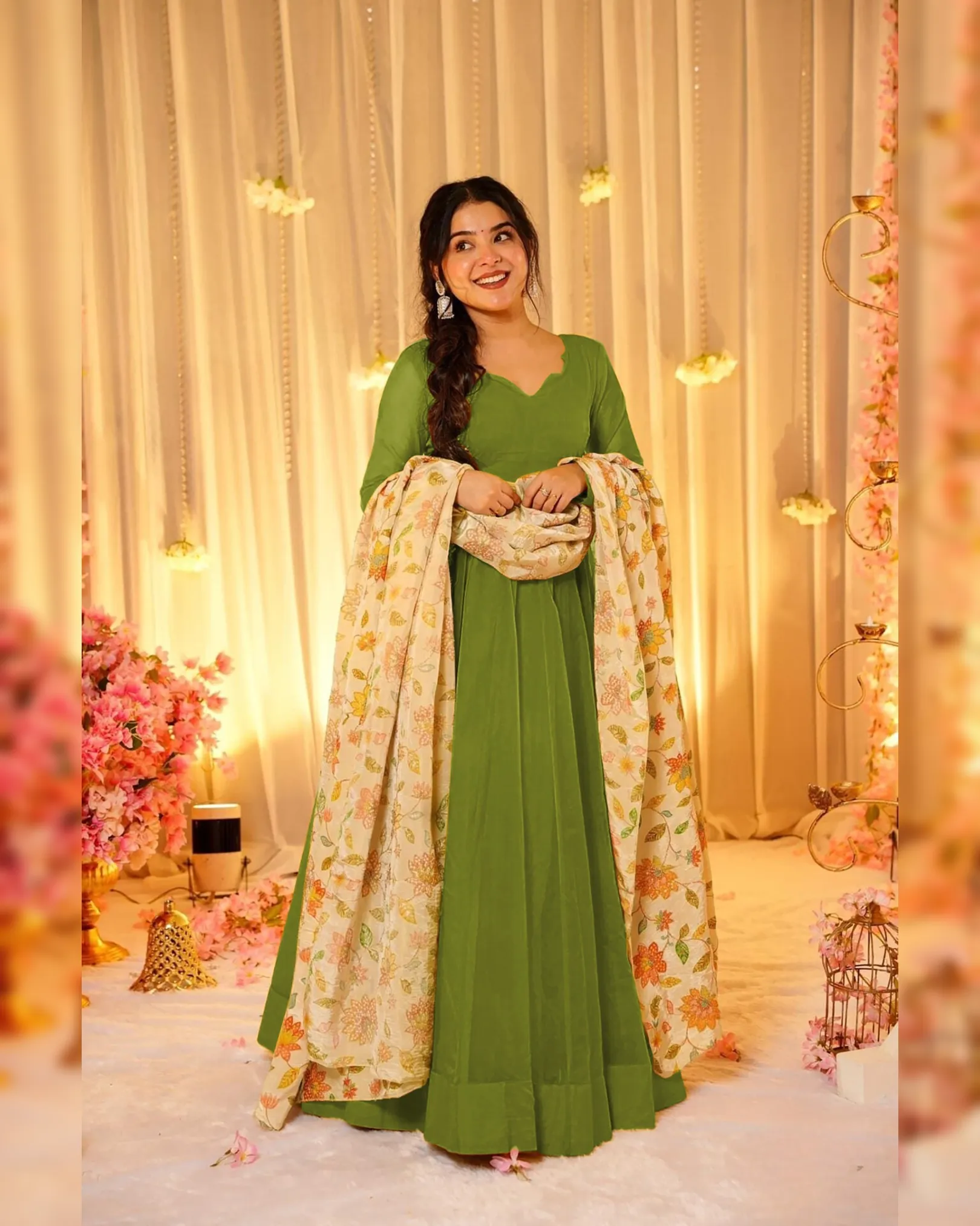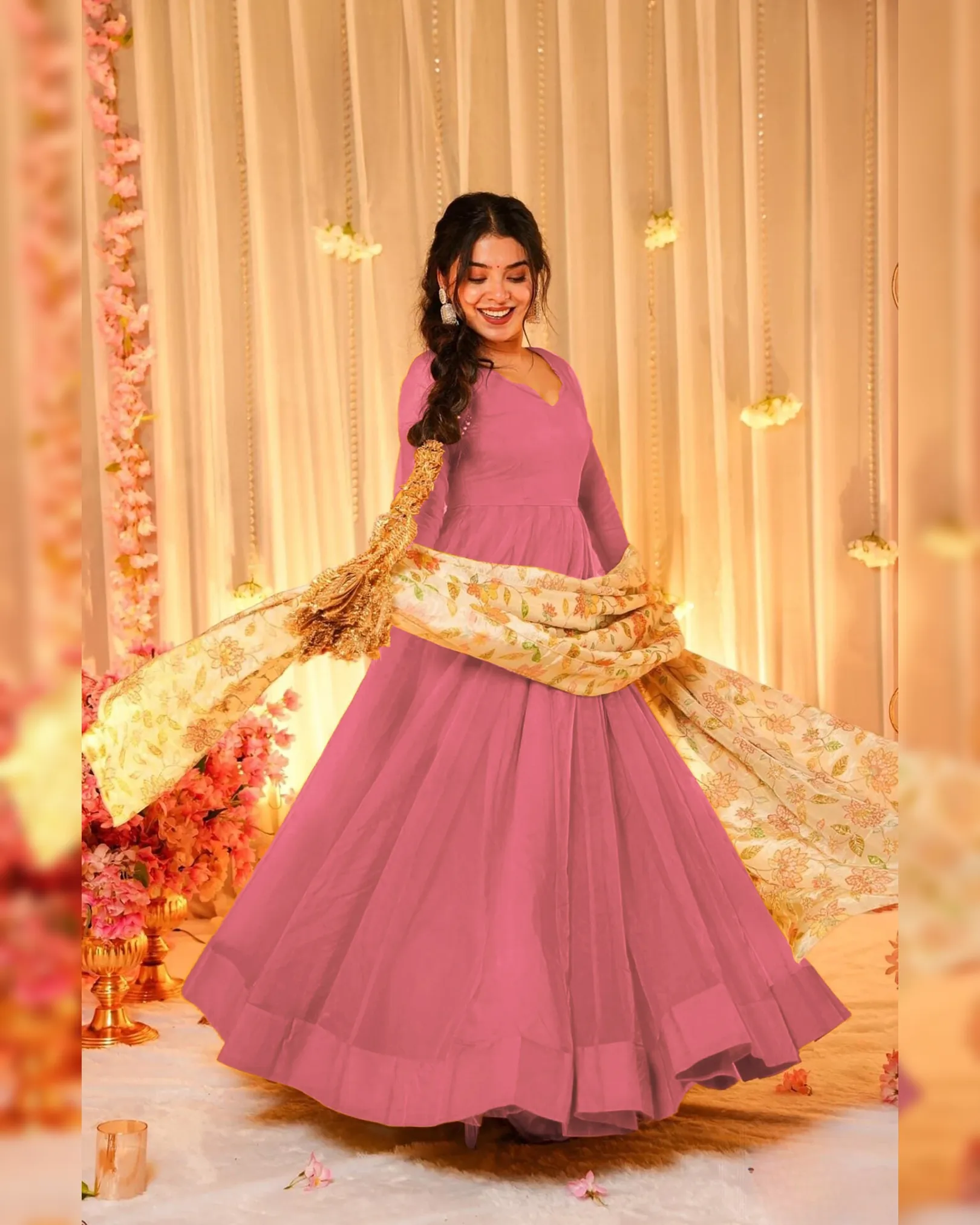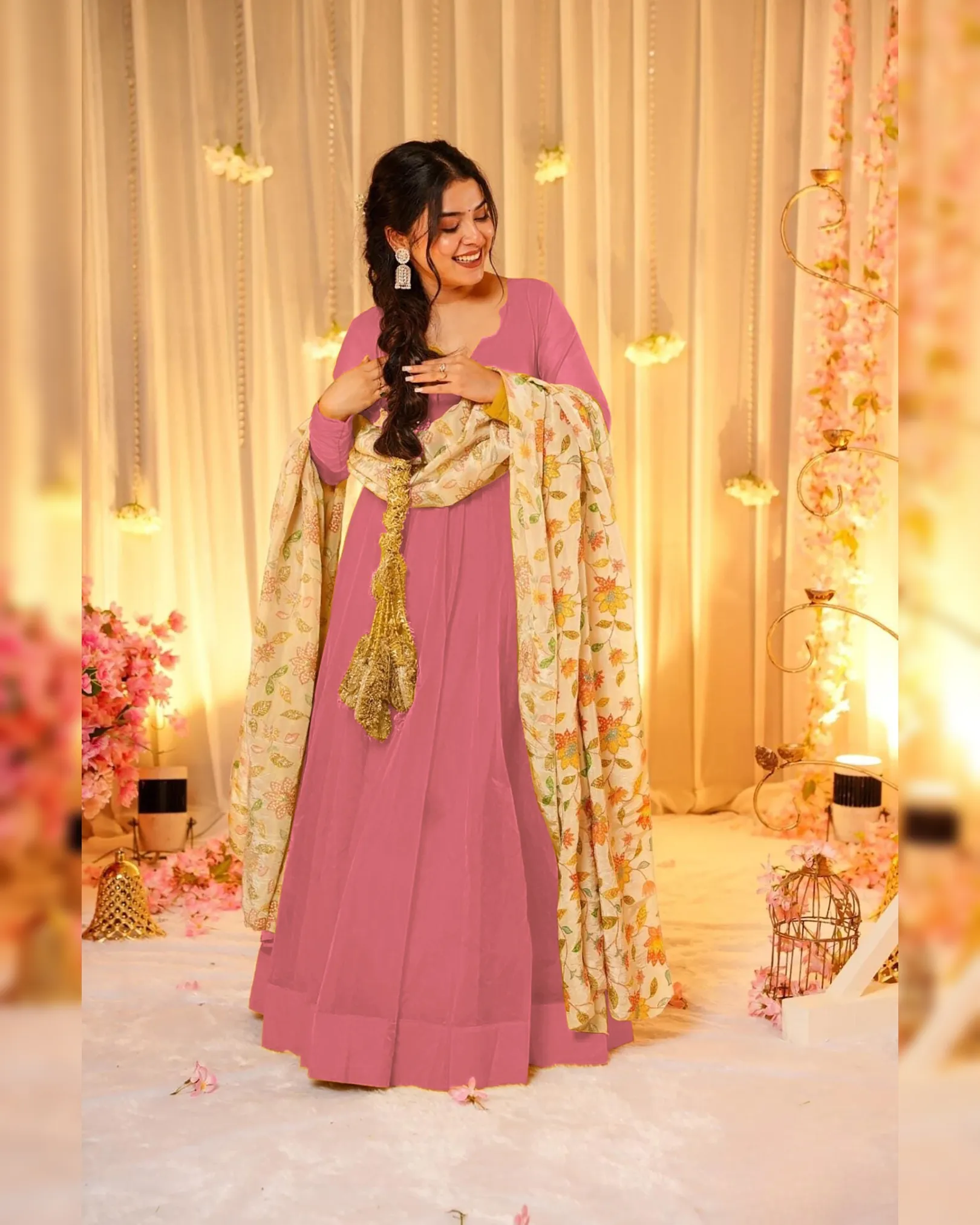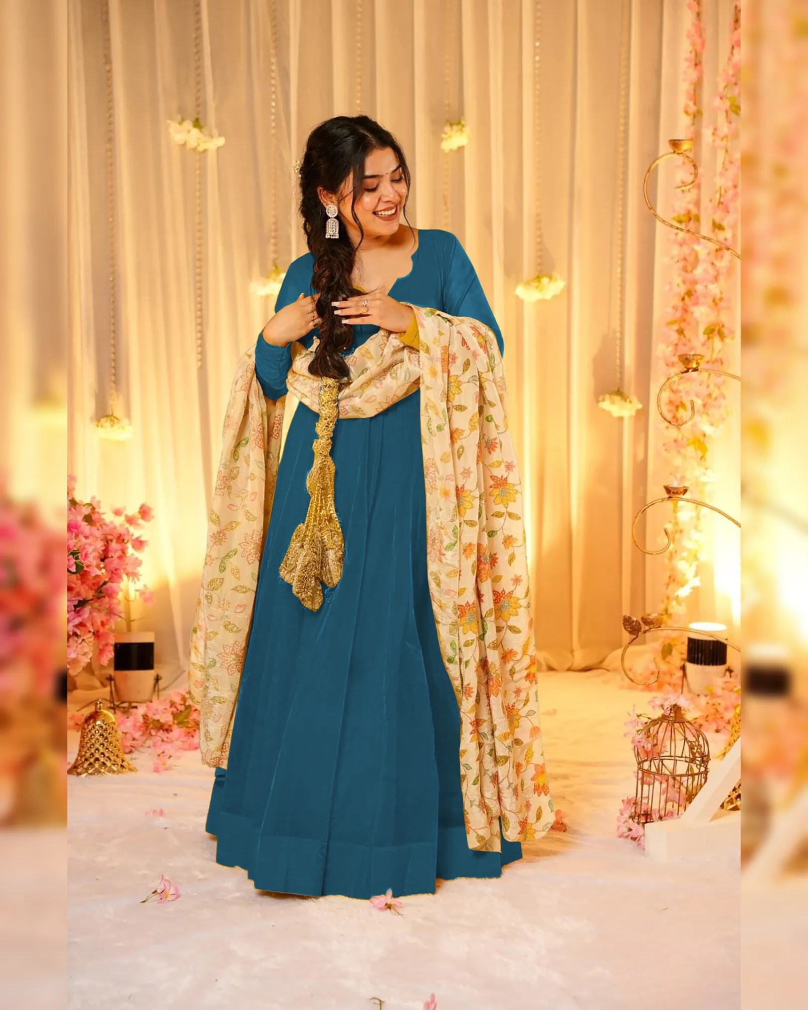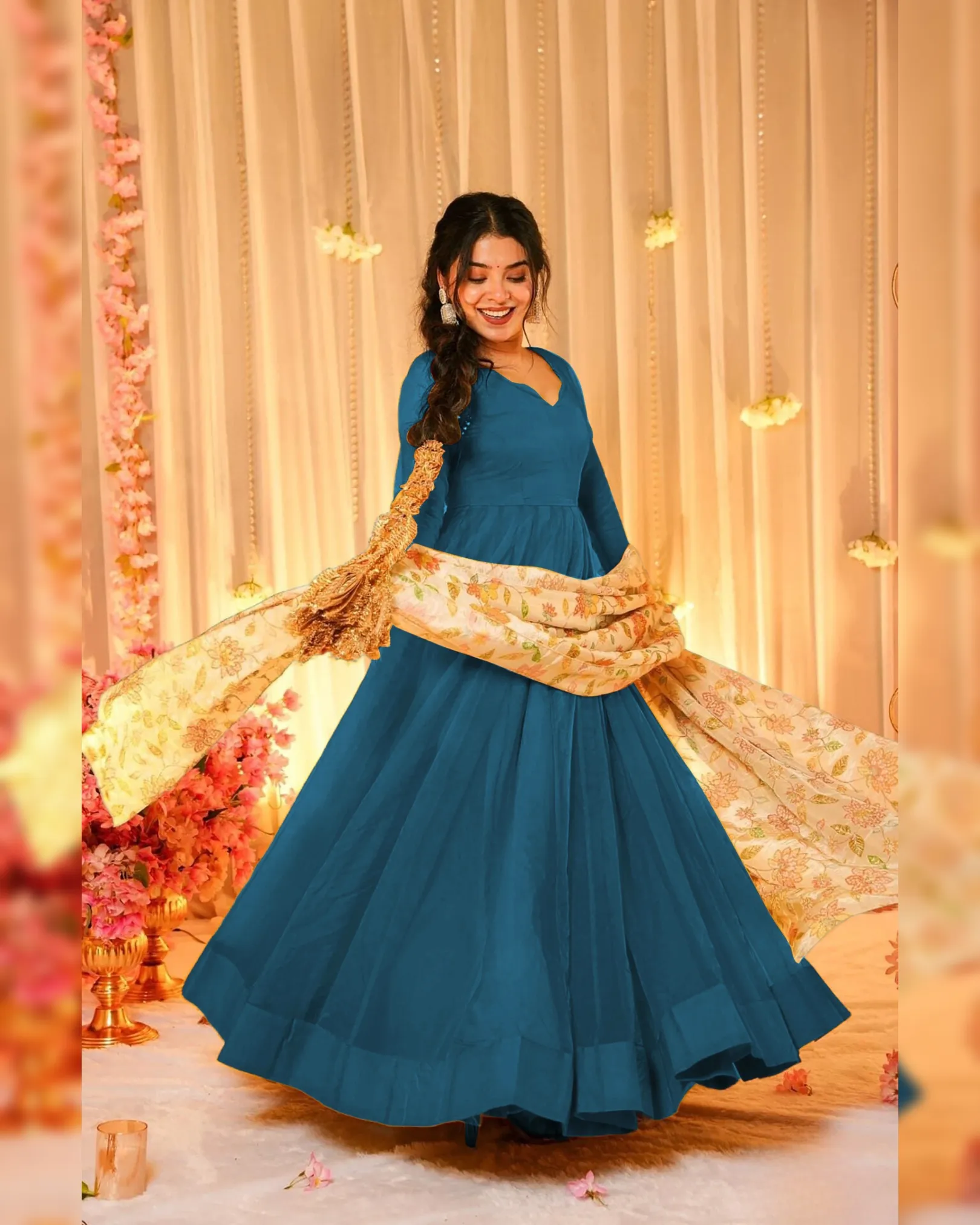 Graceful Anarkali style flared gown crafted in soft dyed silk with a 3.5-meter flair and paired with a beautiful floral digital printed Teby silk dupatta with lace border. Perfect for festive occasions, weddings, and parties.