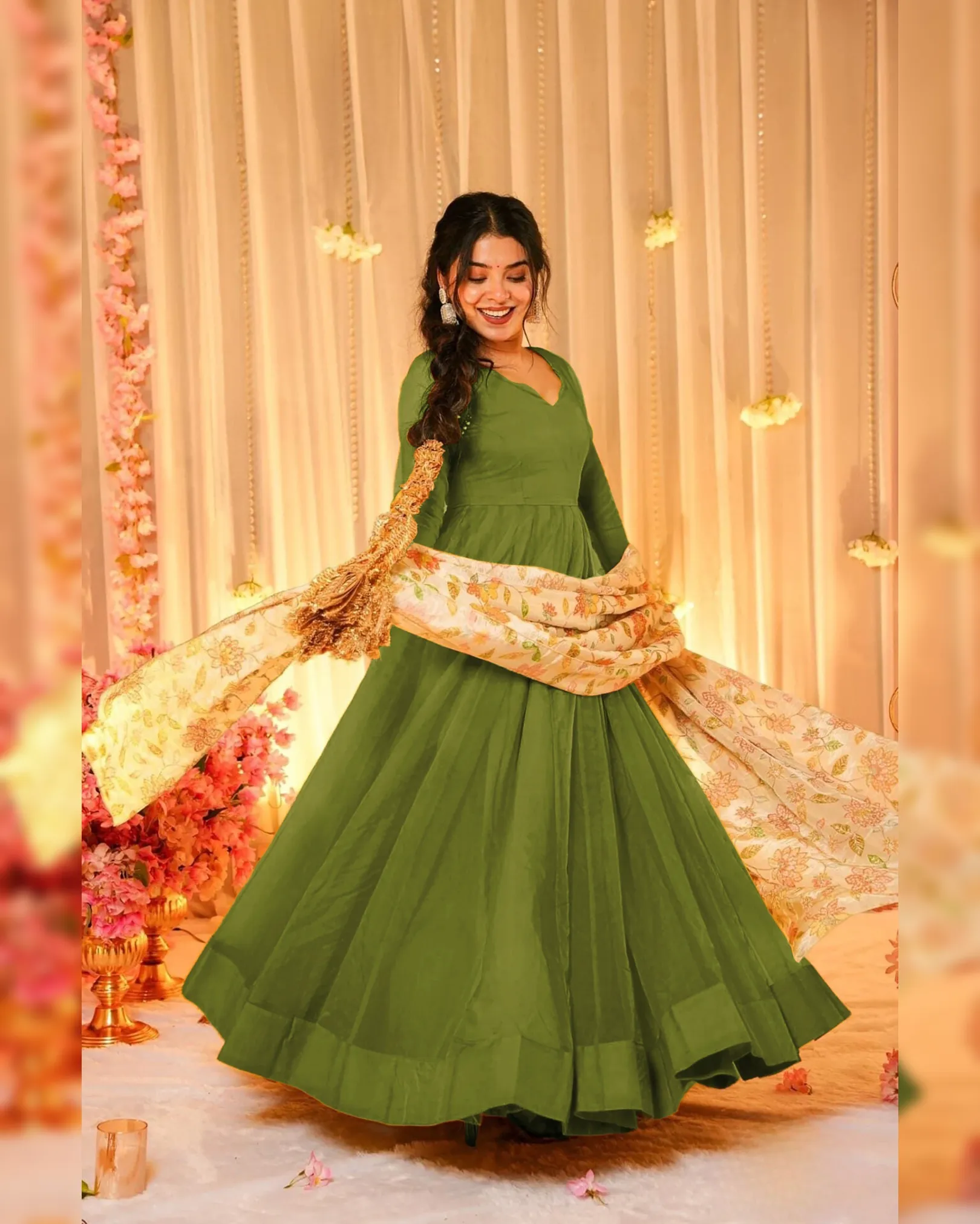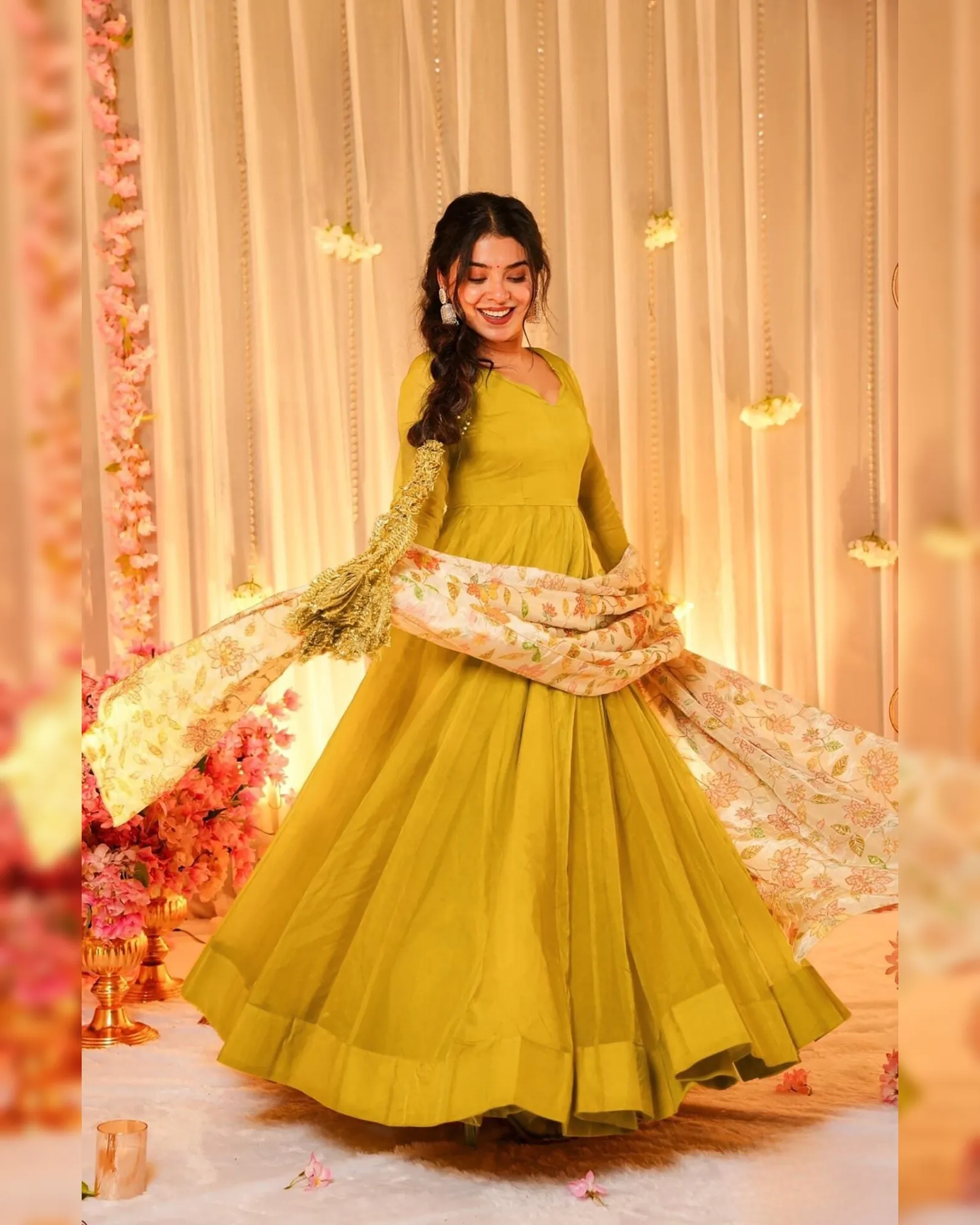Step into elegance with this stunning ethnic flared gown set, designed to give you a royal and graceful look for special occasions. Crafted from premium soft dyed silk, the gown features a fully flared Anarkali silhouette with an impressive 3.5-meter flair, offering a beautiful flow and dramatic appearance.